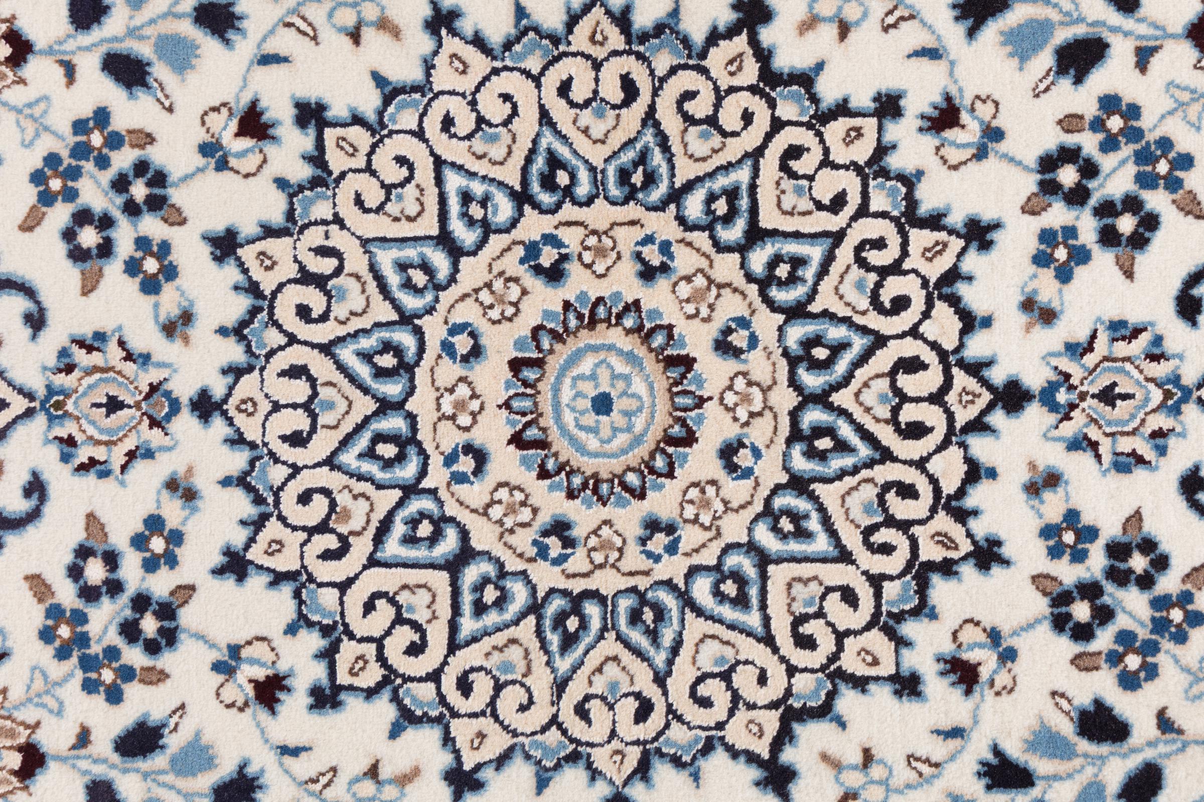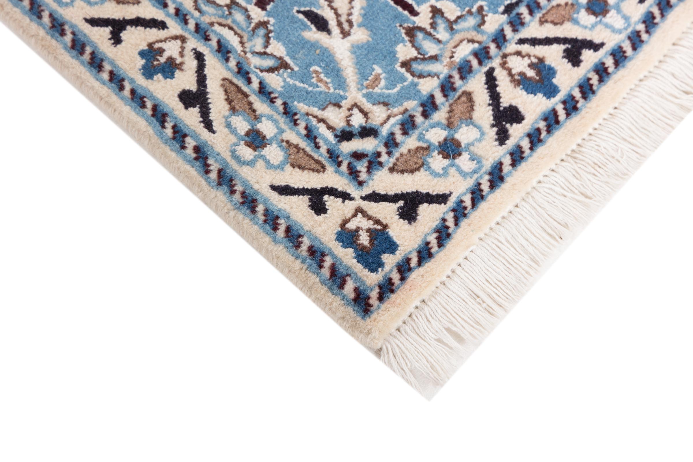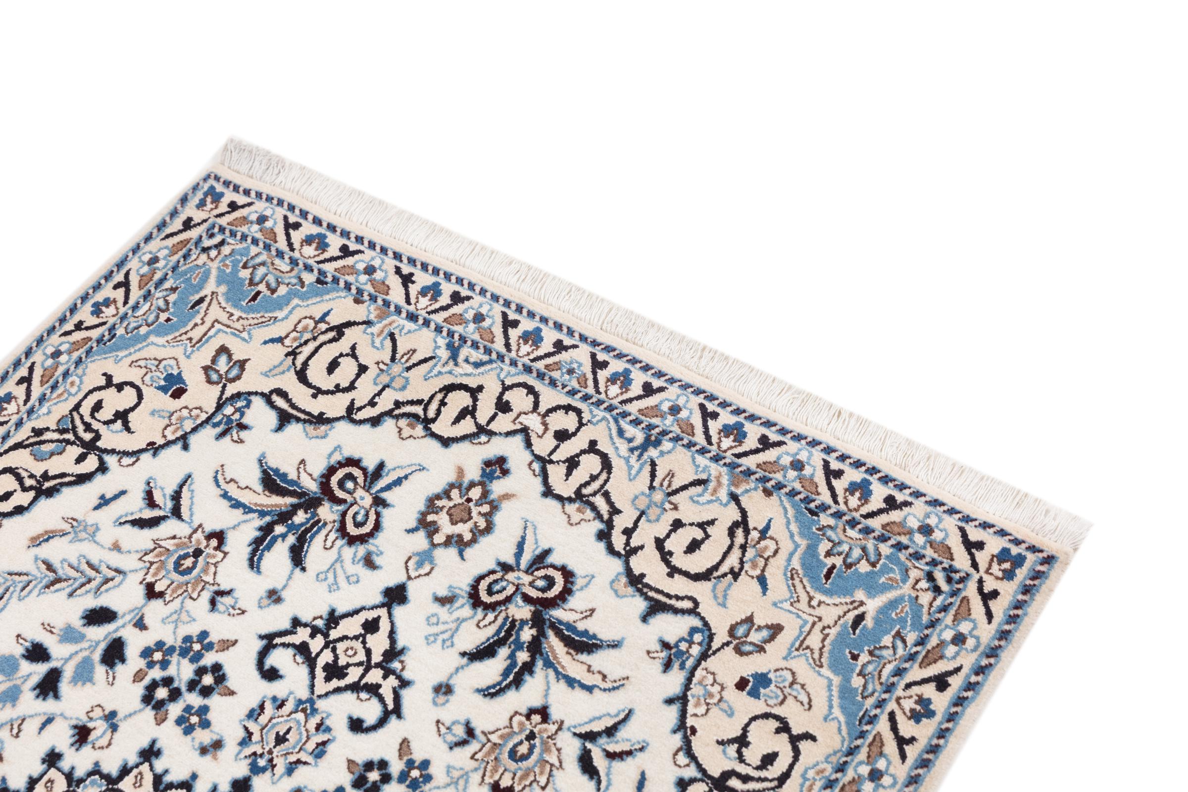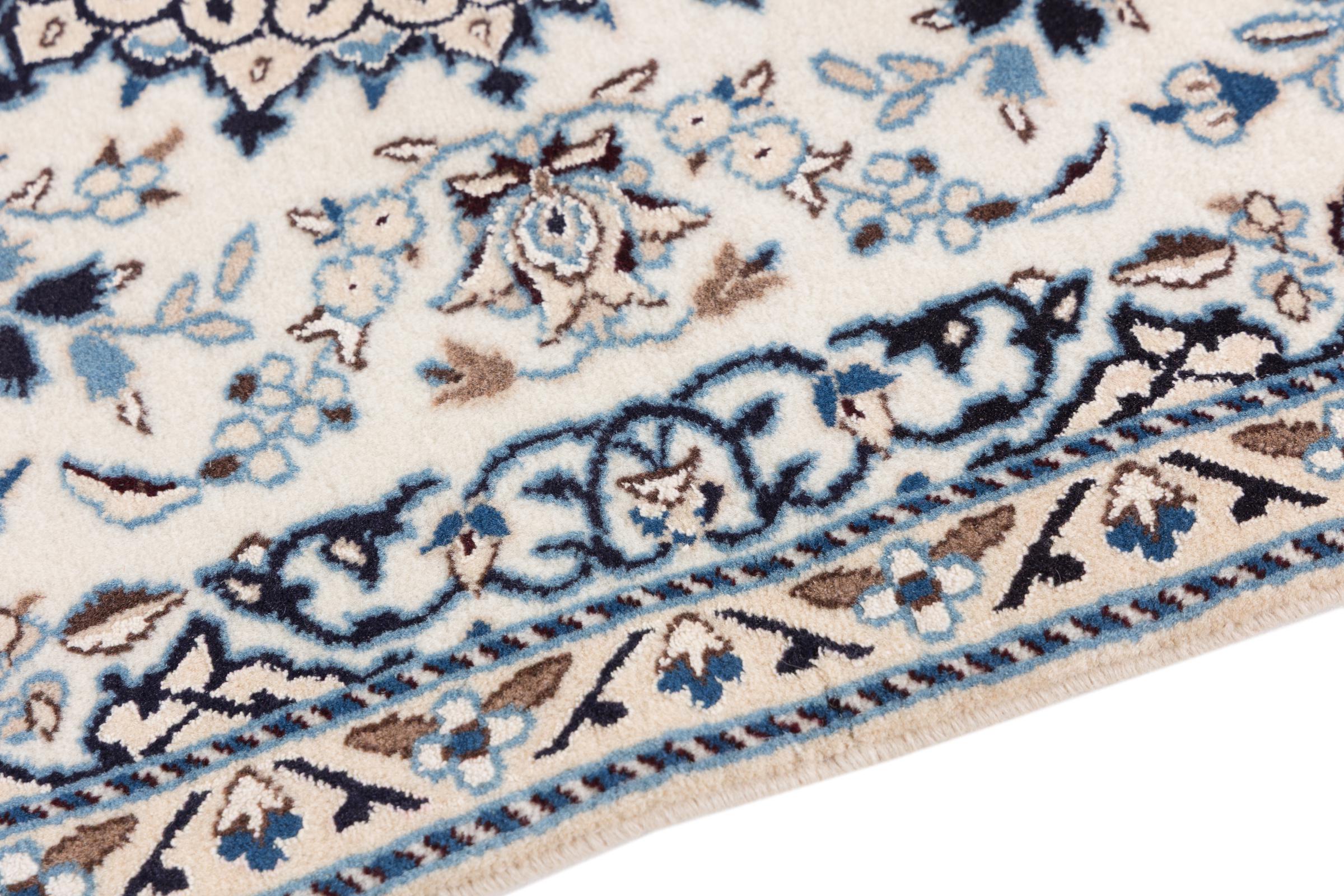 This Nain rug is classified as 9La. The excellent quality, the beautiful oriental design with its curvilinear patterns will delight every buyer. This Persian rug was hand-knotted in the city of Nain, which lies on the western edge of the Dasht-e-Kavir desert, from high-quality wool and natural silk. 9La Nain rugs are significantly finer than a 12La and already show beautiful details.