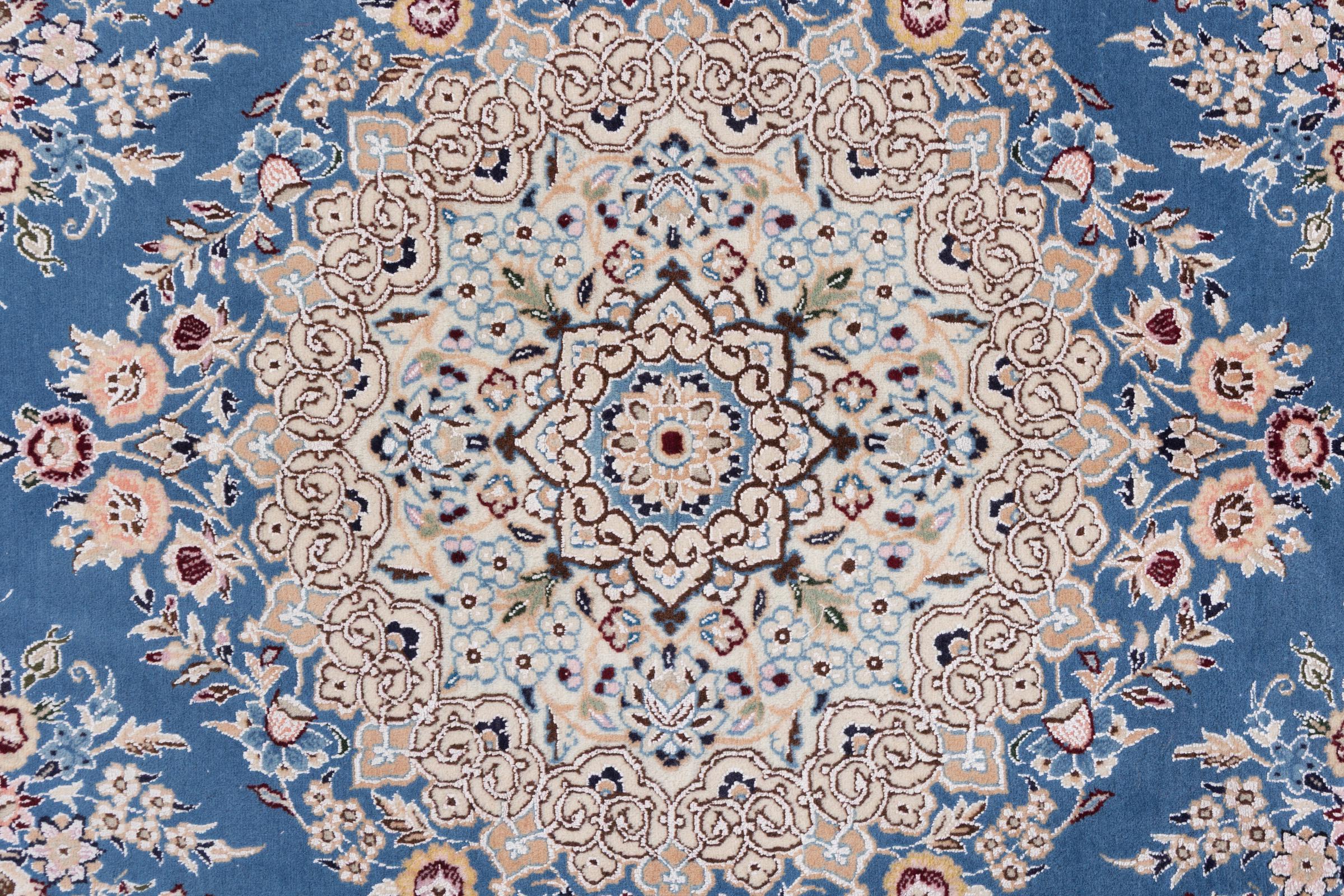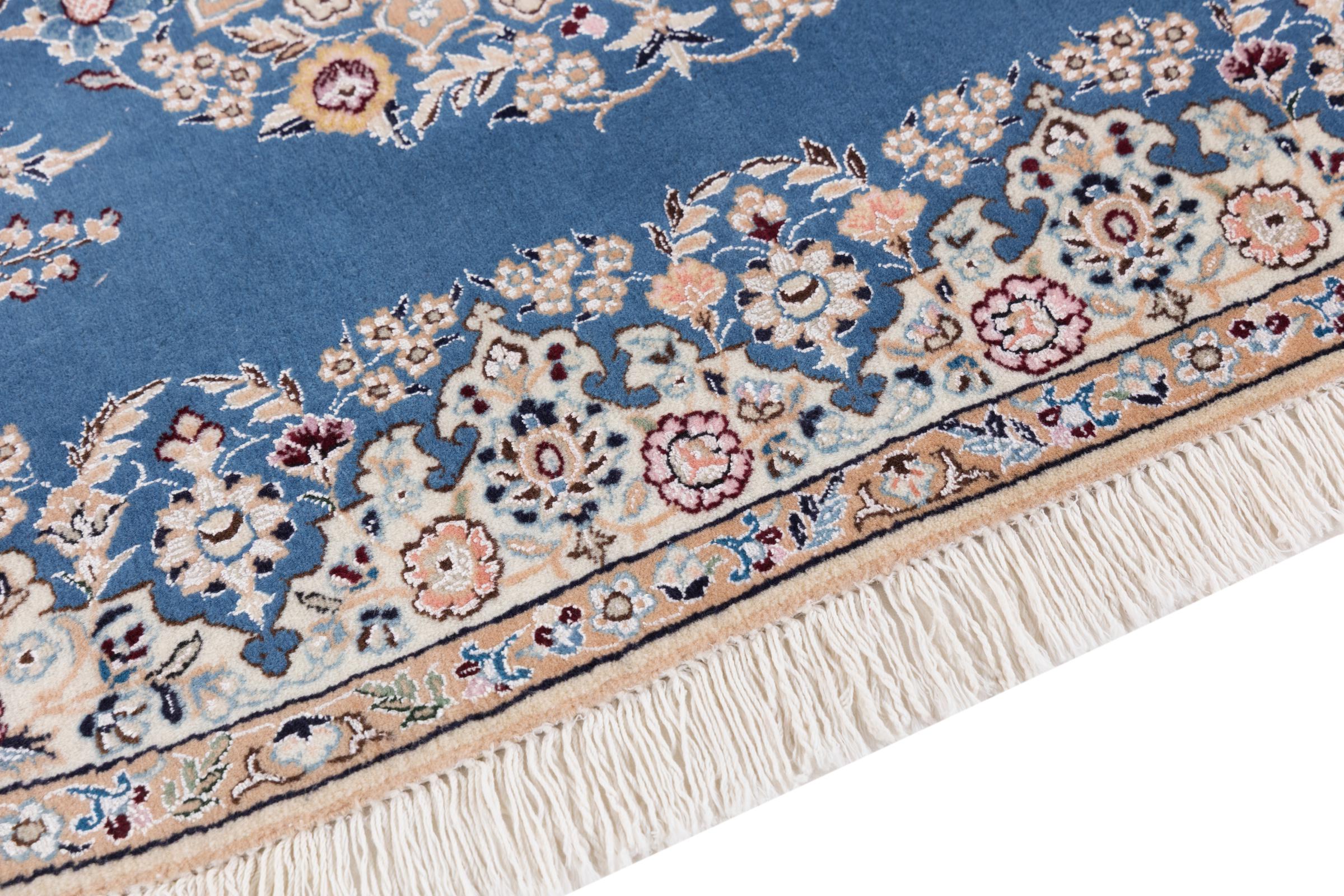 This Nain rug combines quality, tradition and an unmistakable design. It was hand-knotted from high-quality cork wool and natural silk in the desert town of the same name, Nain. Lovers of valuable rugs from Iran will love this Persian rug. With Nain rugs in the 6La and 4La classifications, you have a real work of art with an incredible level of detail that you can really lose yourself in. Nain 4La rugs are almost impossible to find today, as they are extremely elaborate to produce.
