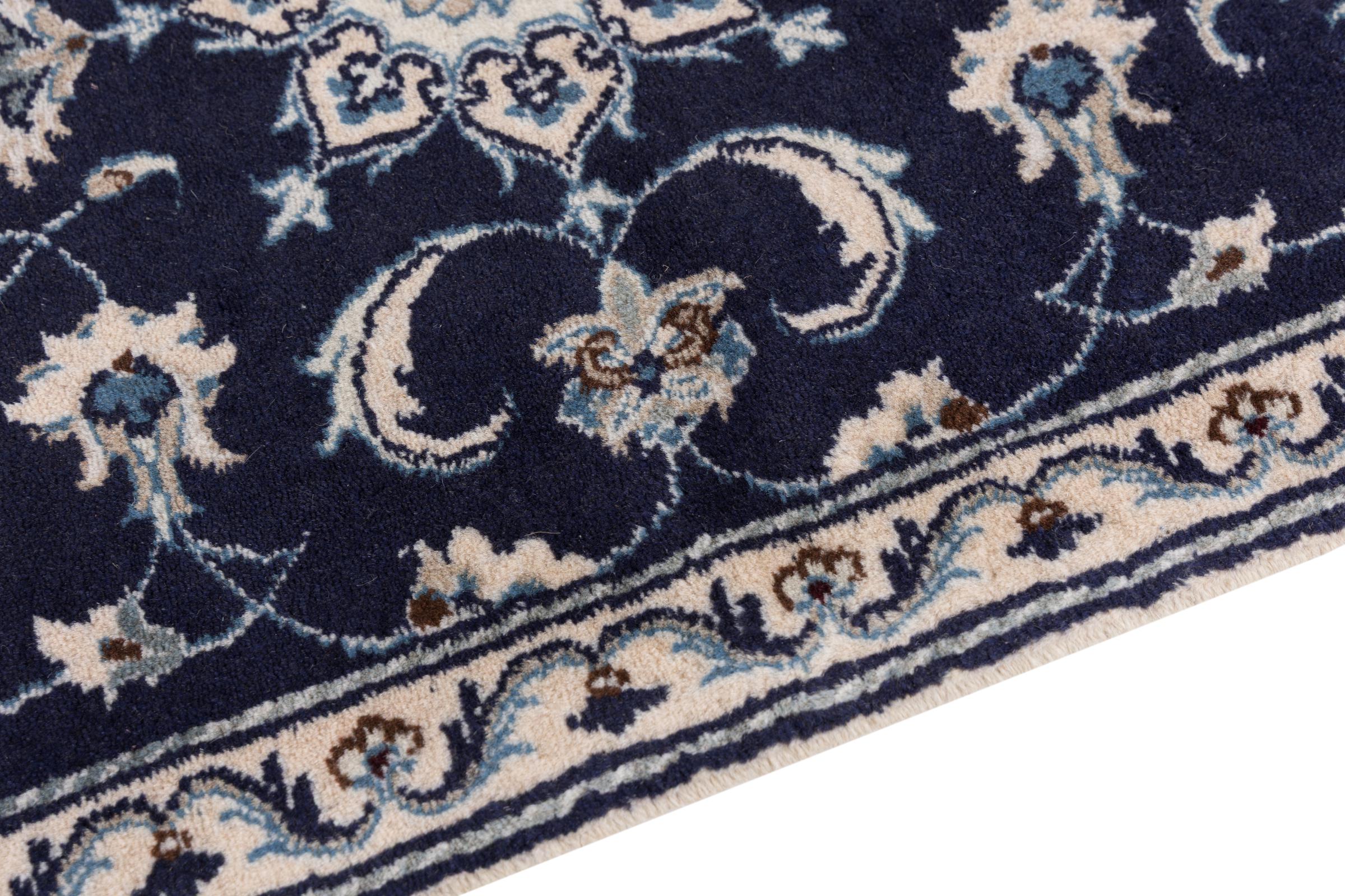This Nain rug is classified as 12La. Its typical Nain colour scheme gives it an elegant and sophisticated look. This Persian rug was hand-knotted in the city of Nain, which lies on the western edge of the Dasht-e-Kavir desert, using high-quality wool and natural silk. At 12La, it is not as finely detailed with ornamentation as a Nain 9La or 6La.