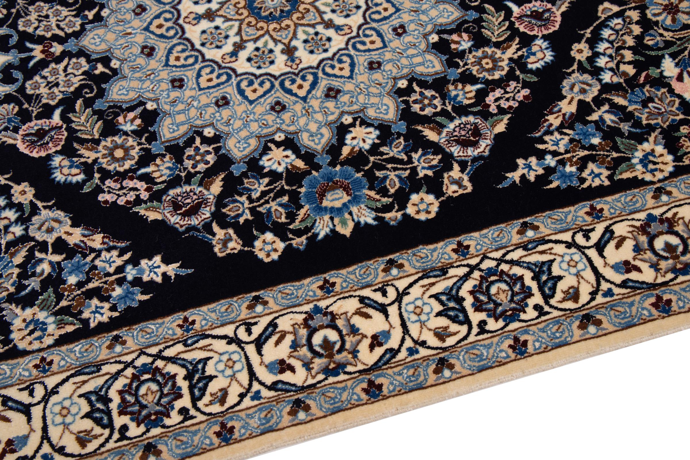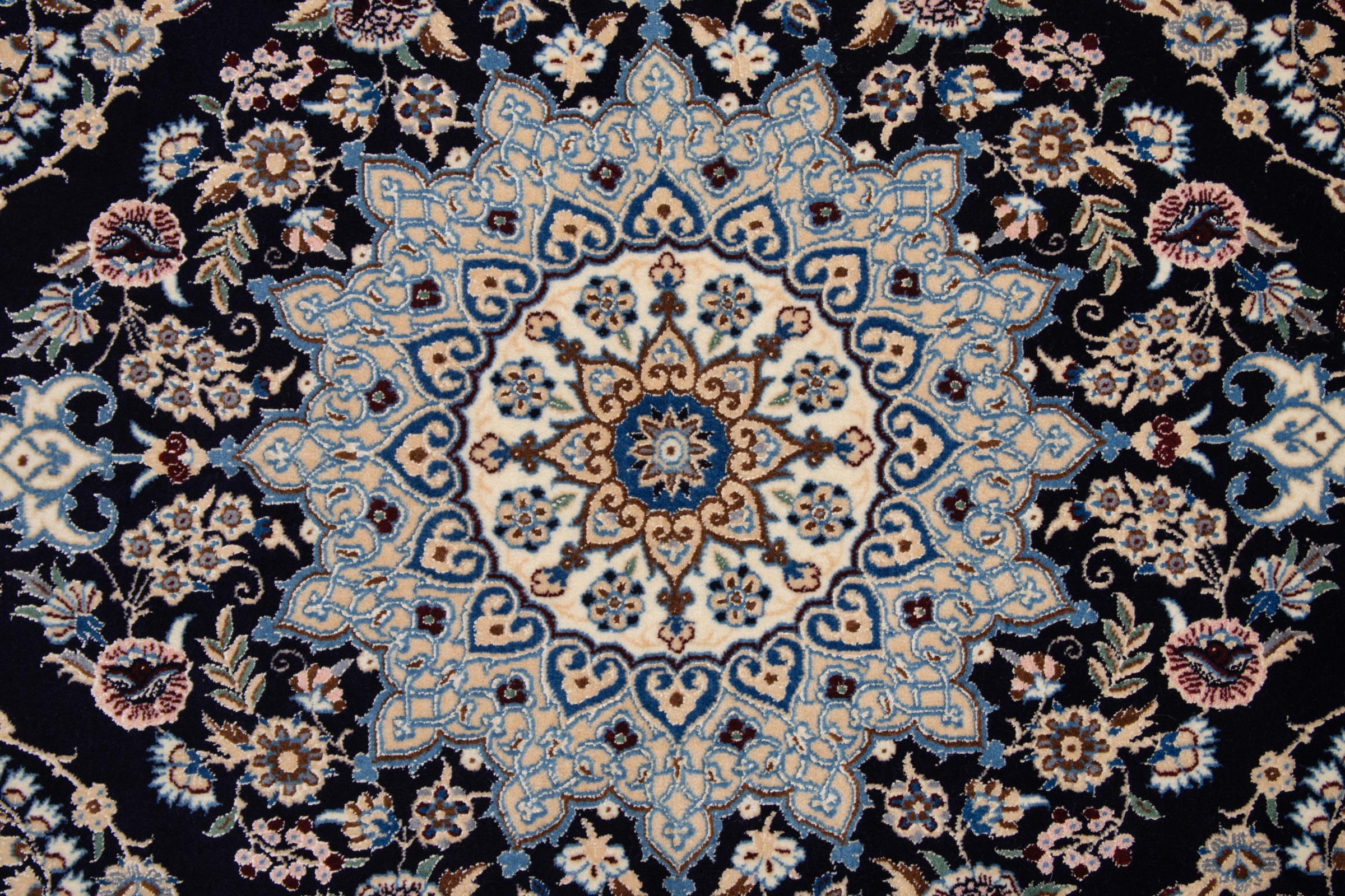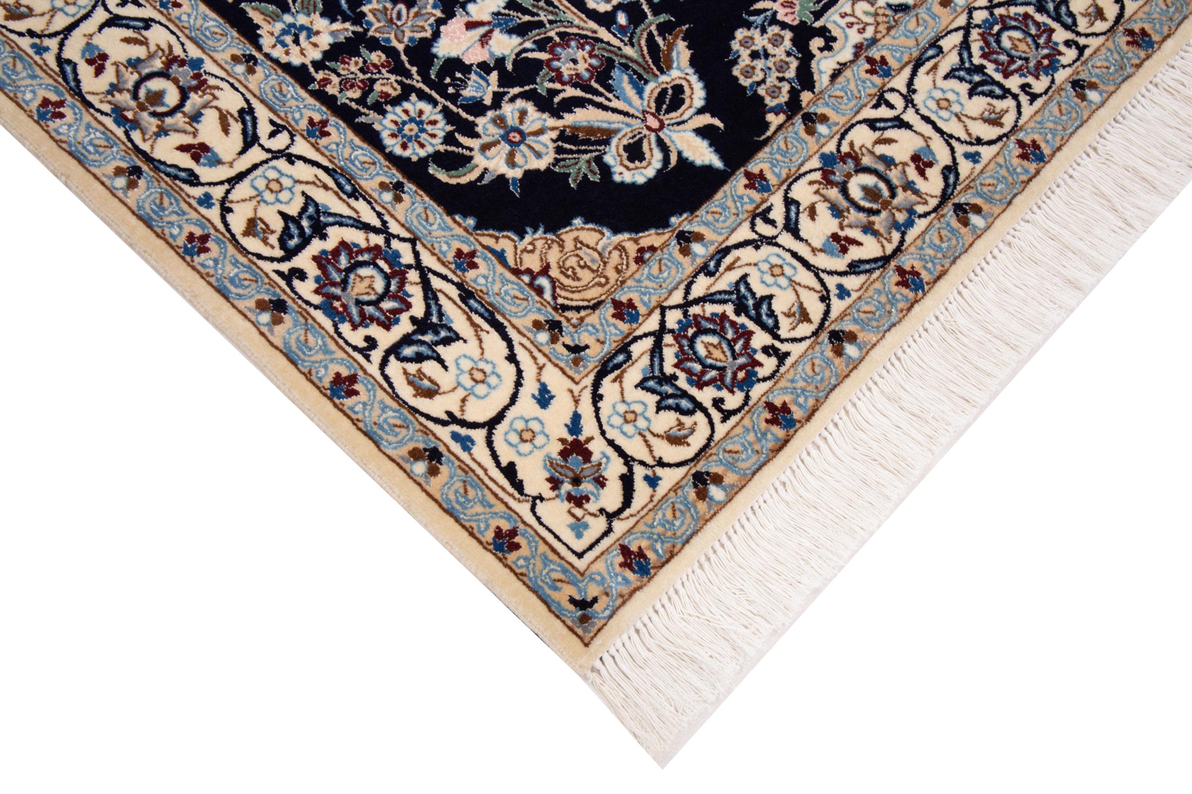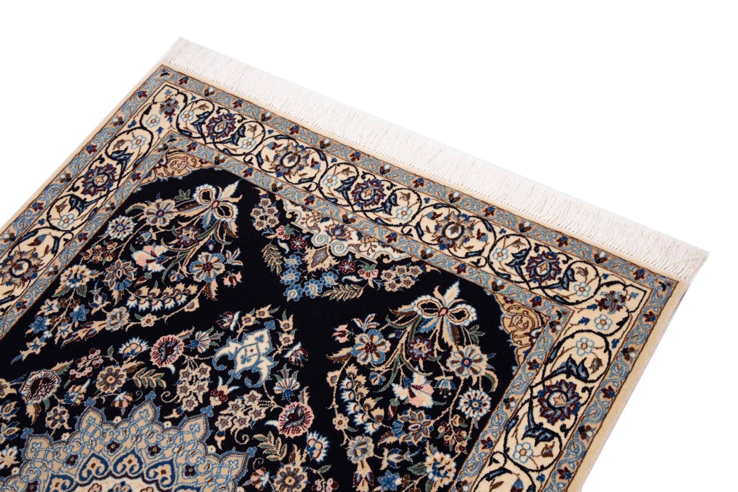This Nain rug combines quality, tradition and an unmistakable design. It was hand-knotted from high-quality cork wool and natural silk in the desert town of the same name, Nain. Lovers of valuable rugs from Iran will love this Persian rug. With Nain rugs in the 6La and 4La classifications, you have a real work of art with an incredible level of detail that you can really lose yourself in. Nain 4La rugs are almost impossible to find today, as they are extremely elaborate to produce.