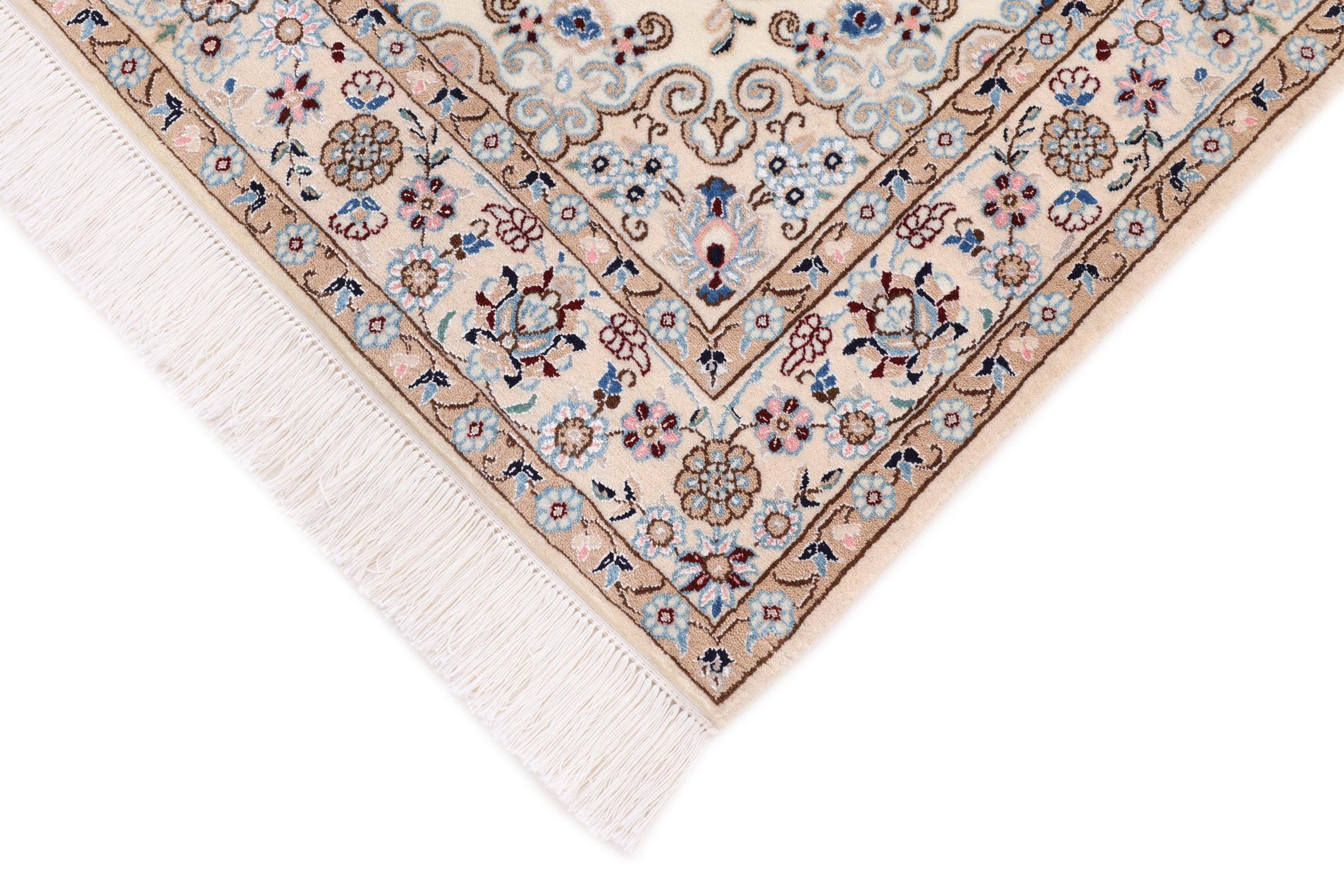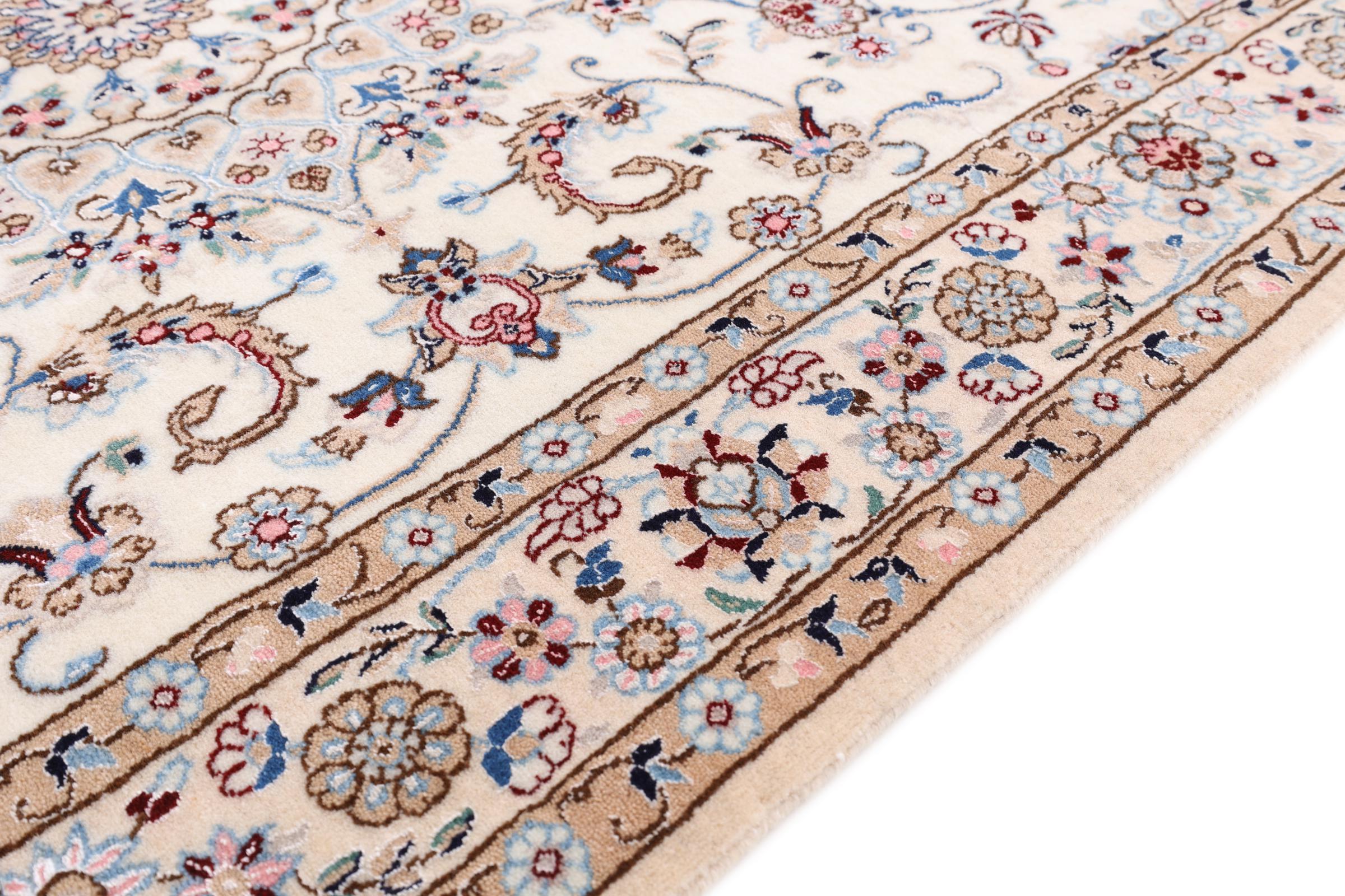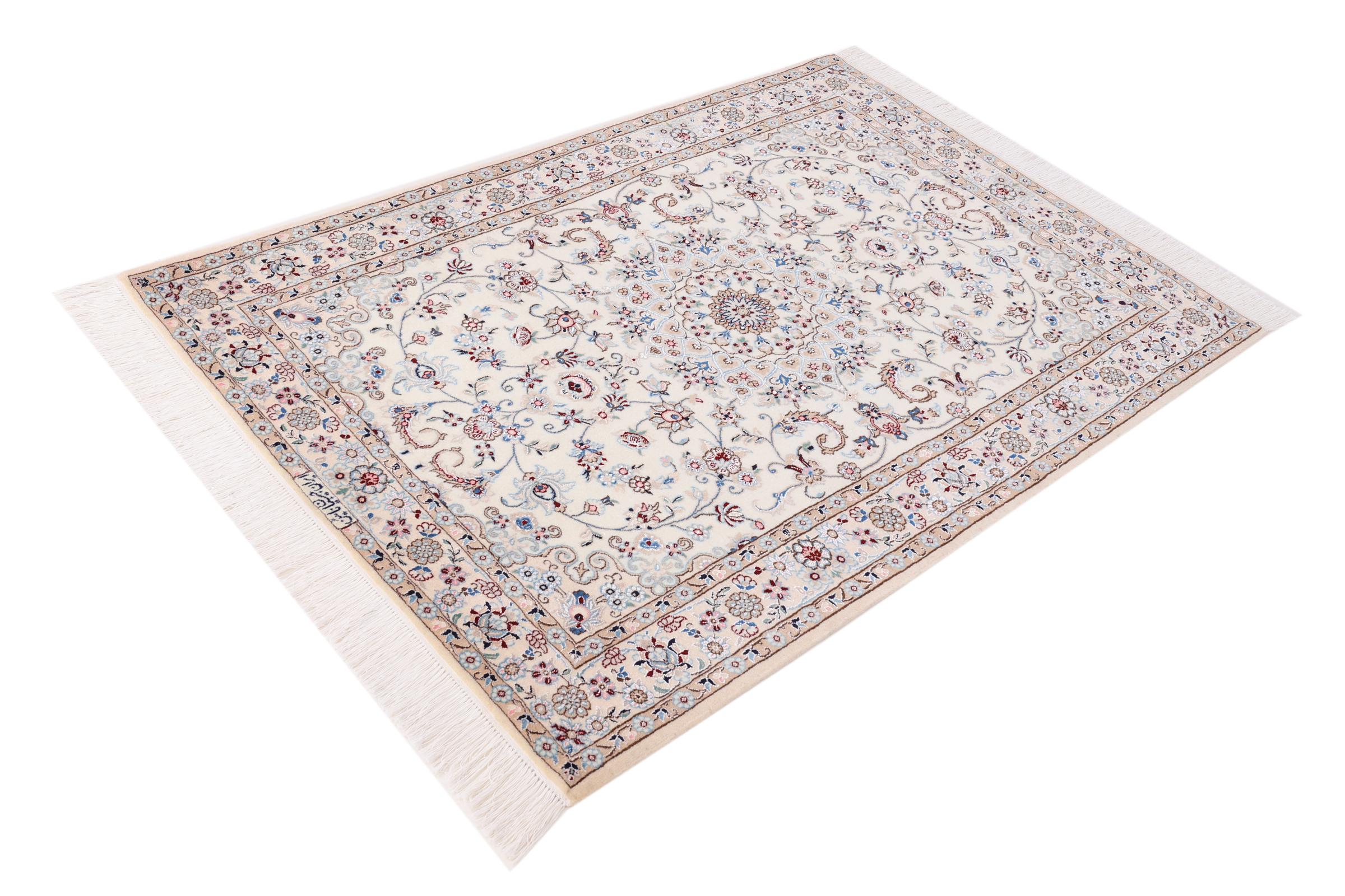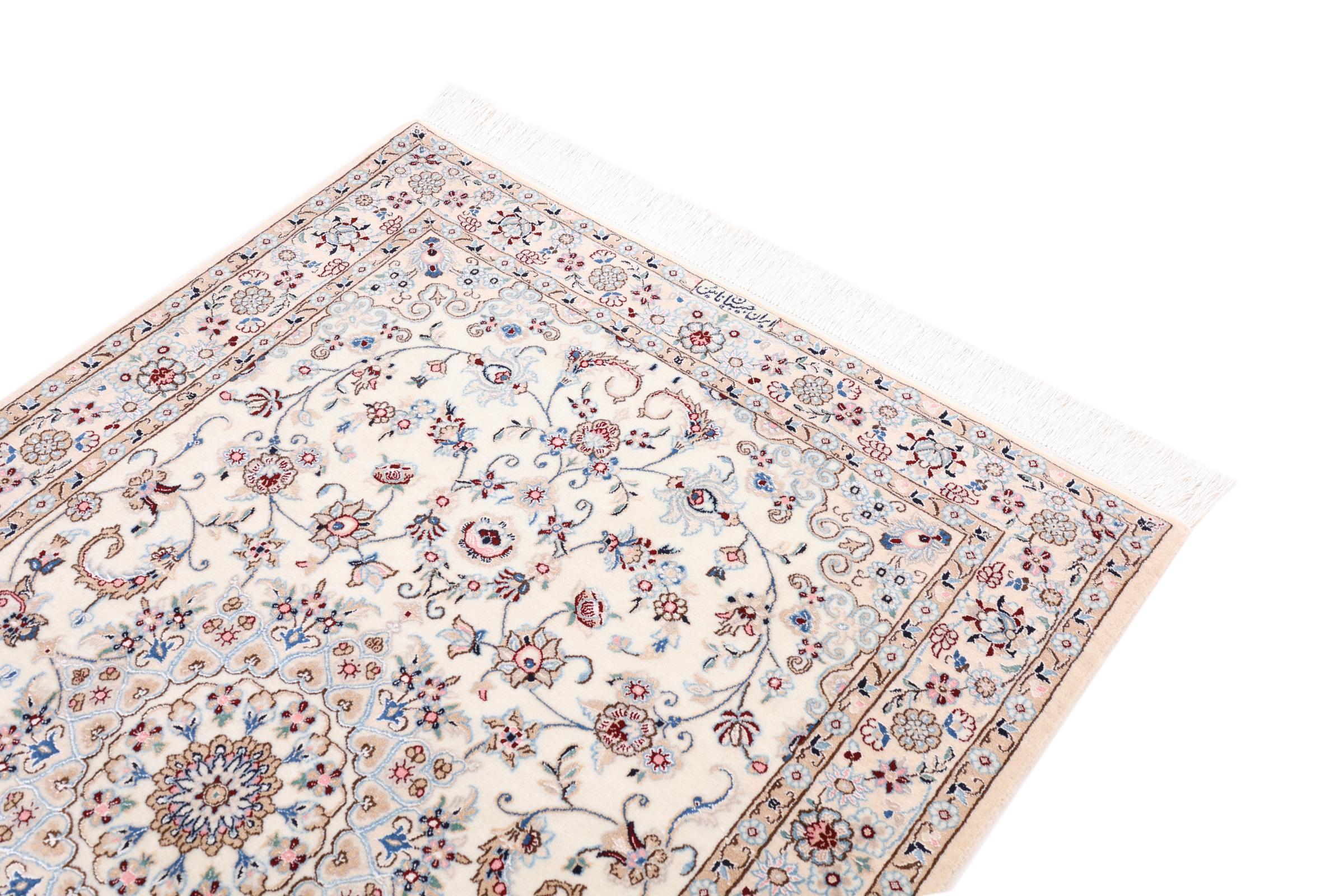 This Nain rug combines quality, tradition and an unmistakable design. It was hand-knotted from high-quality cork wool and natural silk in the desert town of the same name, Nain. Lovers of valuable rugs from Iran will love this Persian rug. With Nain rugs in the 6La and 4La classifications, you have a real work of art with an incredible level of detail that you can really lose yourself in. Nain 4La rugs are almost impossible to find today, as they are extremely elaborate to produce.