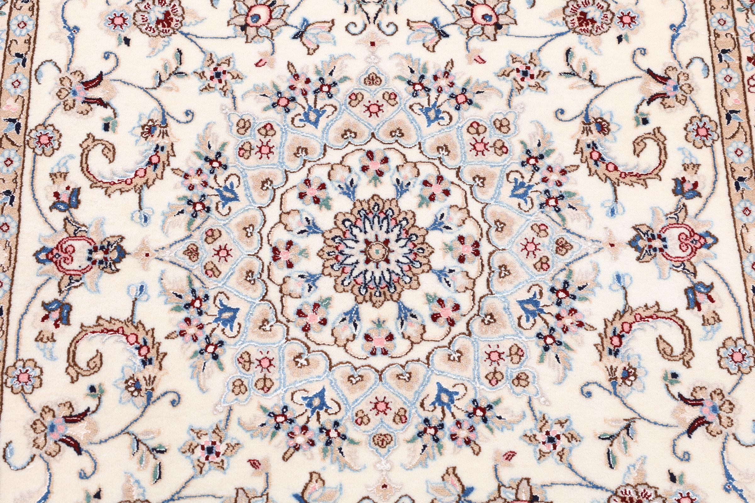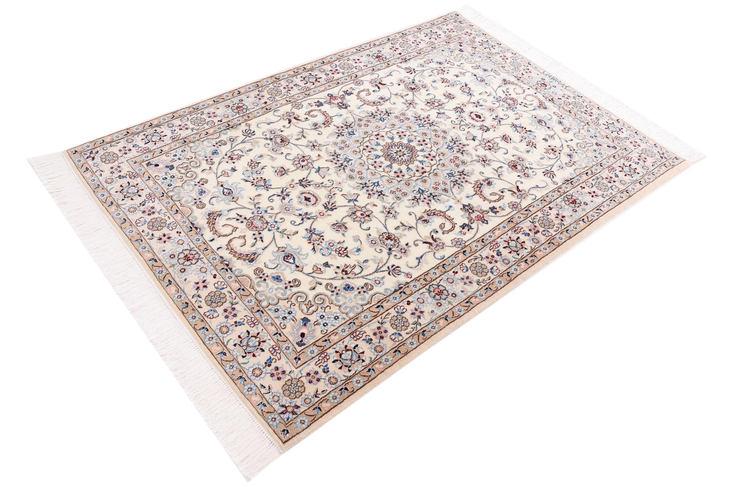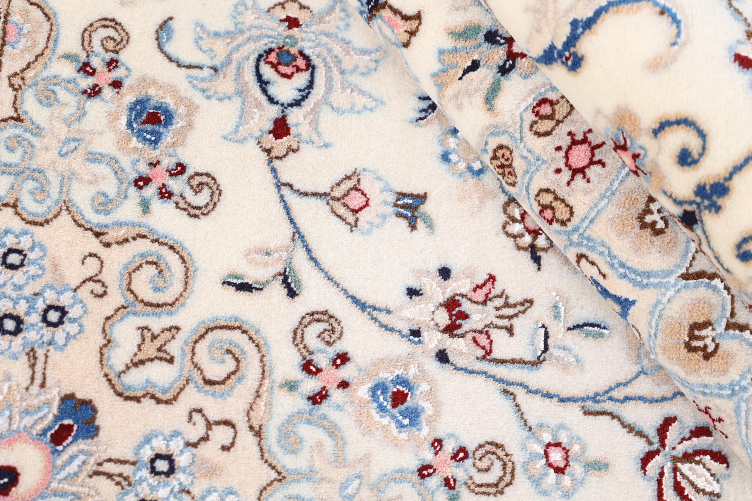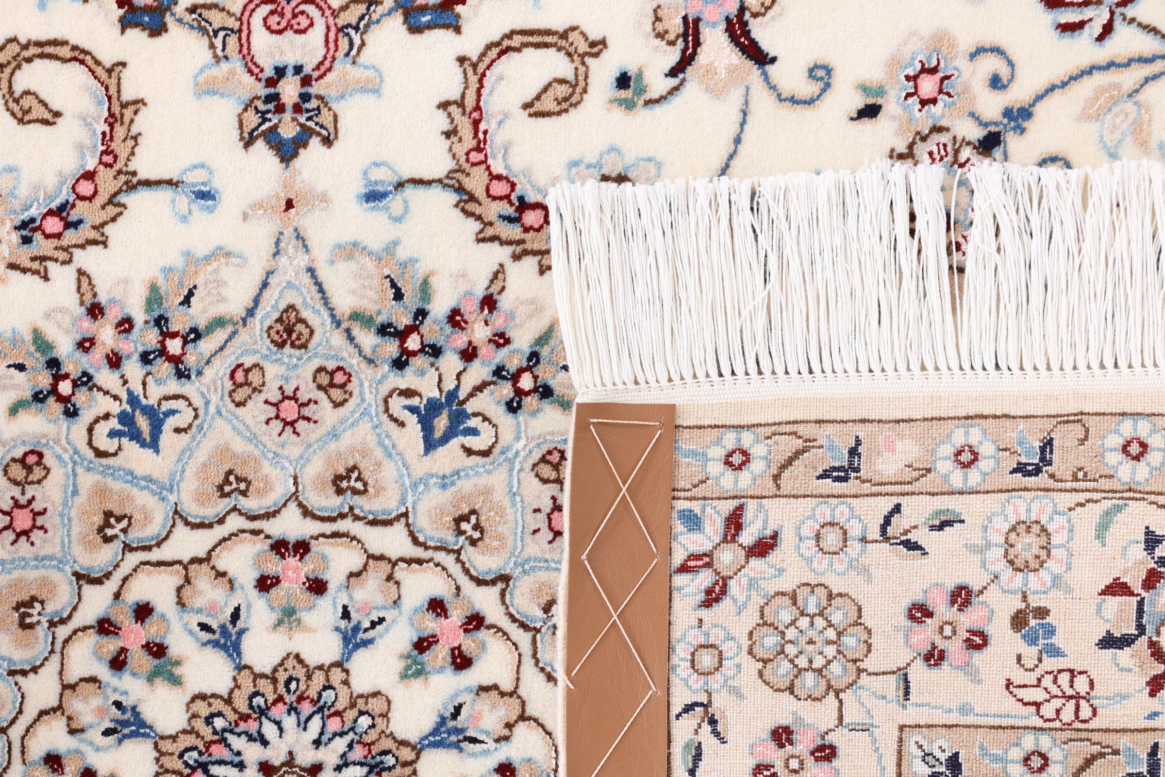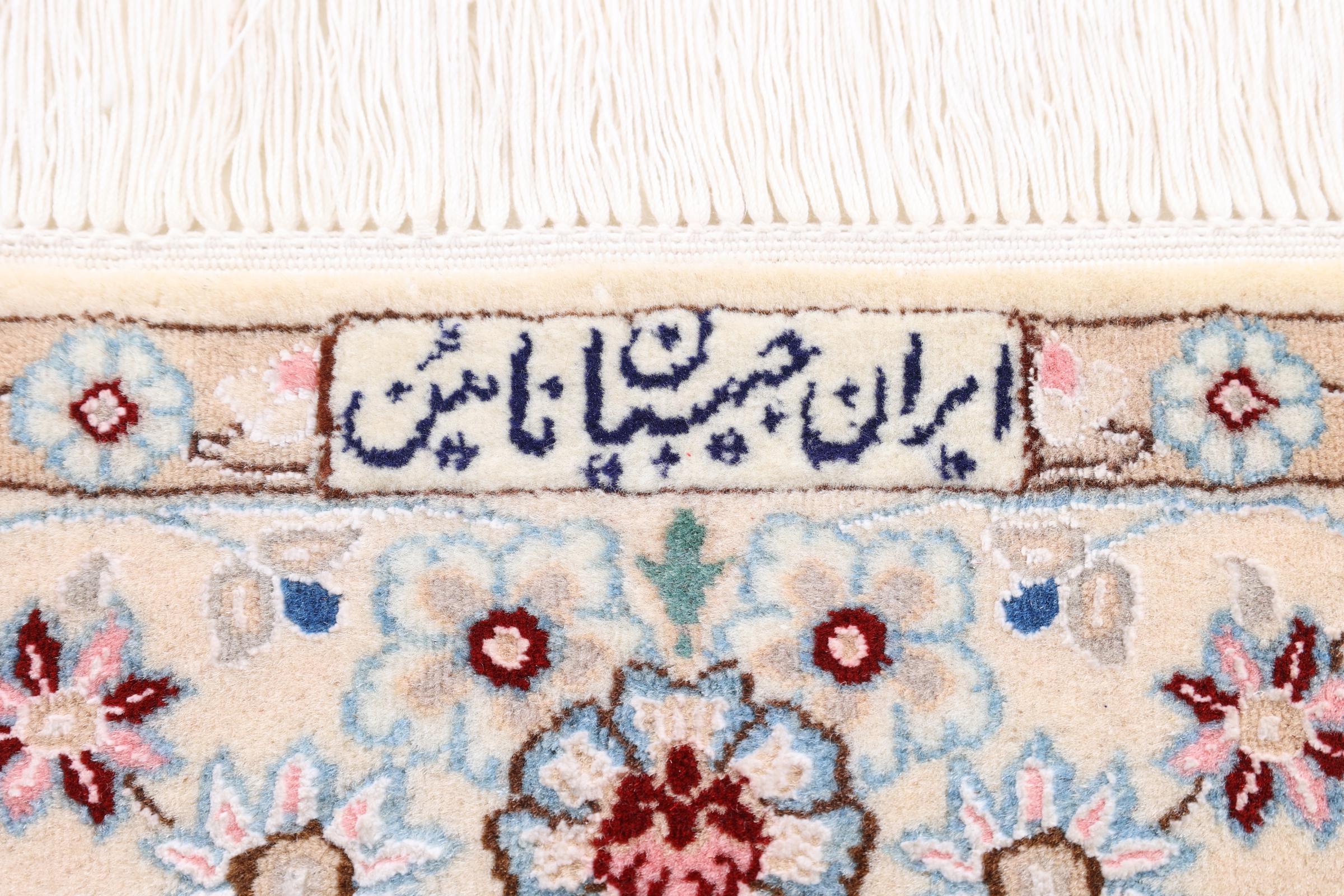 This Nain rug combines quality, tradition and an unmistakable design. It was hand-knotted from high-quality cork wool and natural silk in the desert town of the same name, Nain. Lovers of valuable rugs from Iran will love this Persian rug. With Nain rugs in the 6La and 4La classifications, you have a real work of art with an incredible level of detail that you can really lose yourself in. Nain 4La rugs are almost impossible to find today, as they are extremely elaborate to produce.