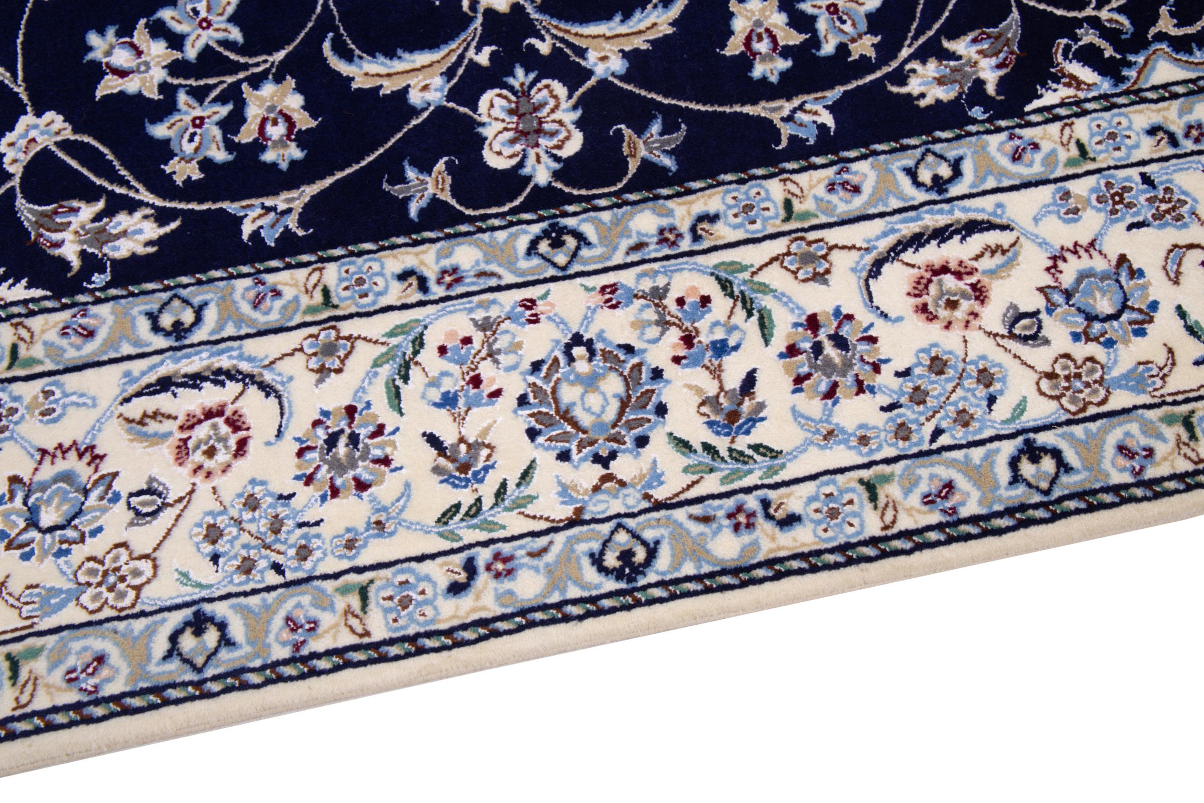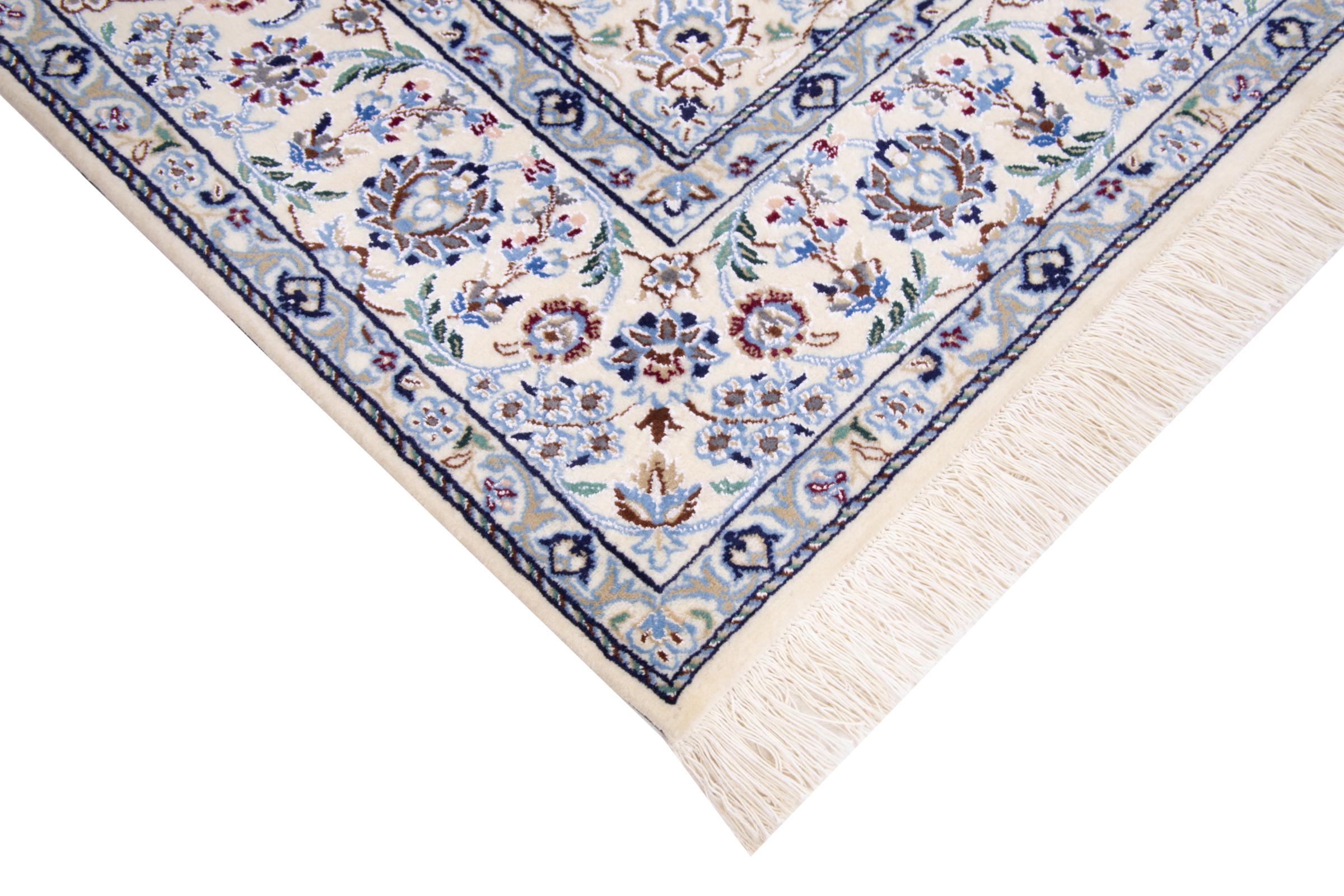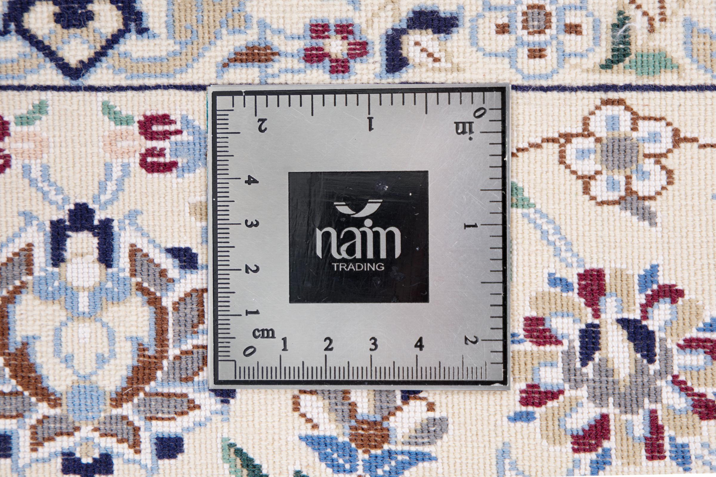 This Nain rug is classified as 9La. The excellent quality, the beautiful oriental design with its curvilinear patterns will delight every buyer. This Persian rug was hand-knotted in the city of Nain, which lies on the western edge of the Dasht-e-Kavir desert, from high-quality wool and natural silk. 9La Nain rugs are significantly finer than a 12La and already show beautiful details.
