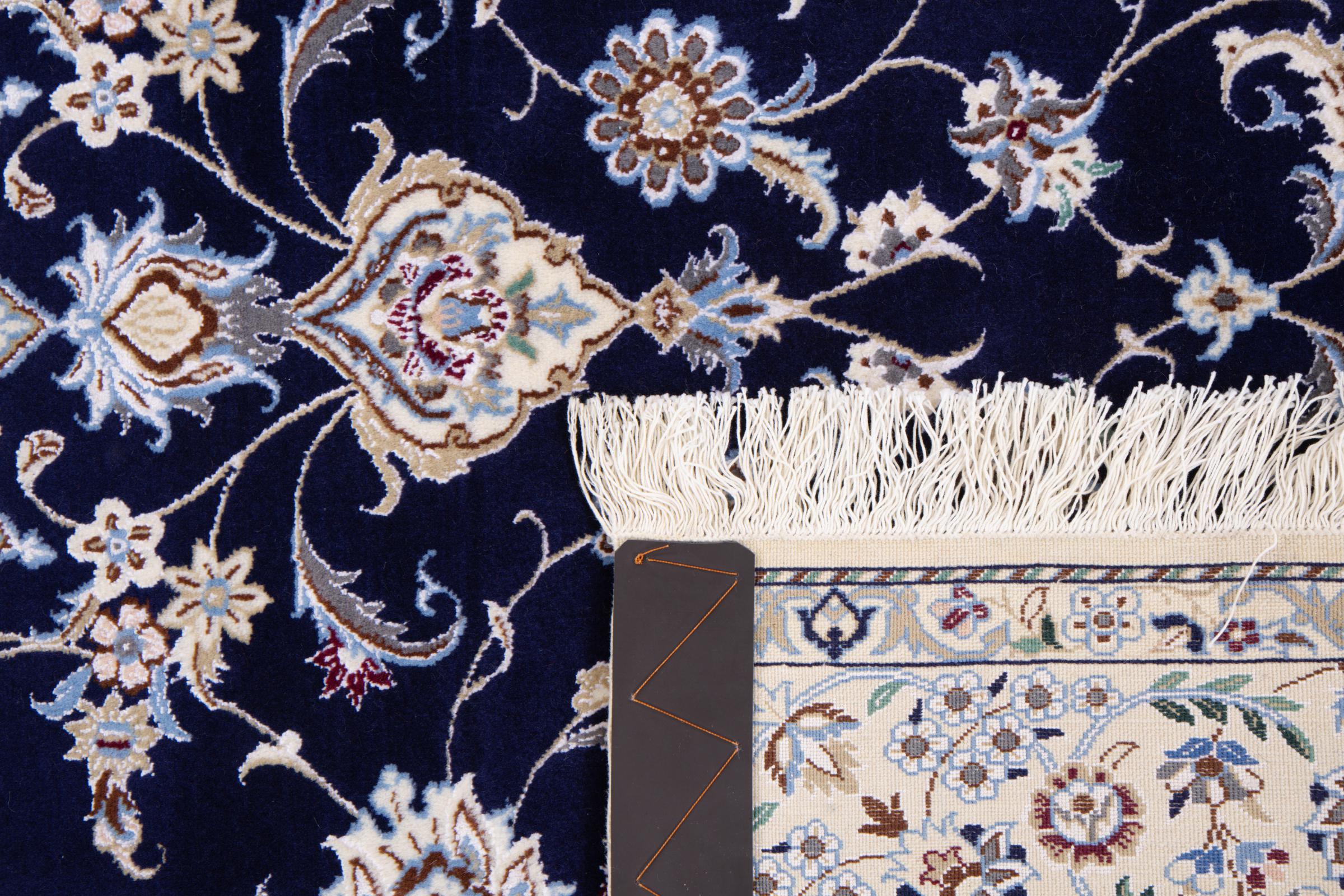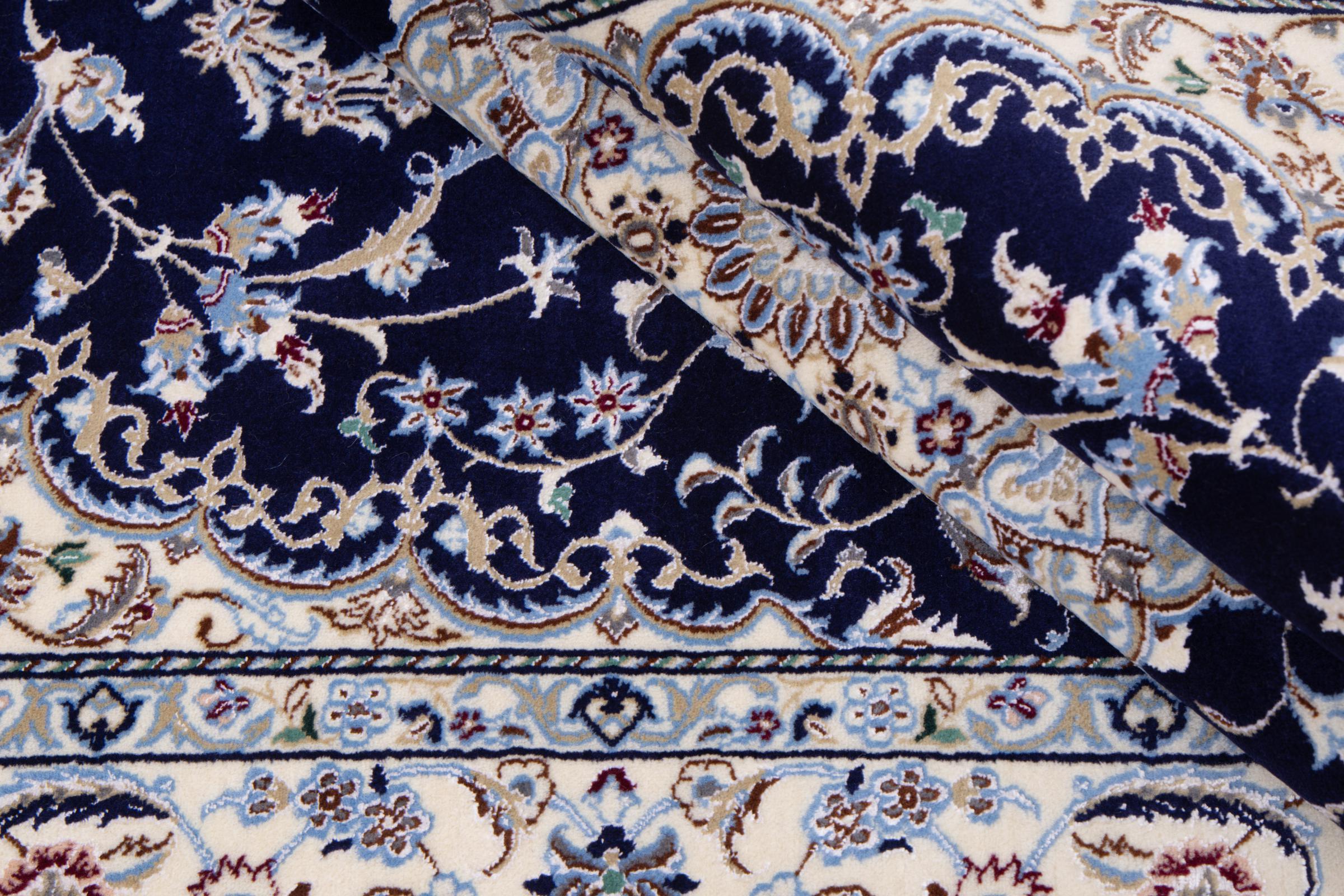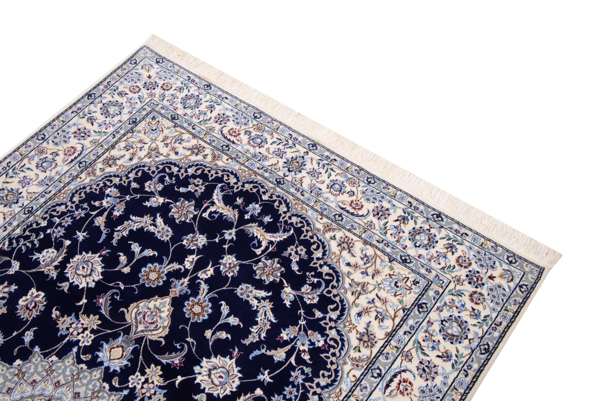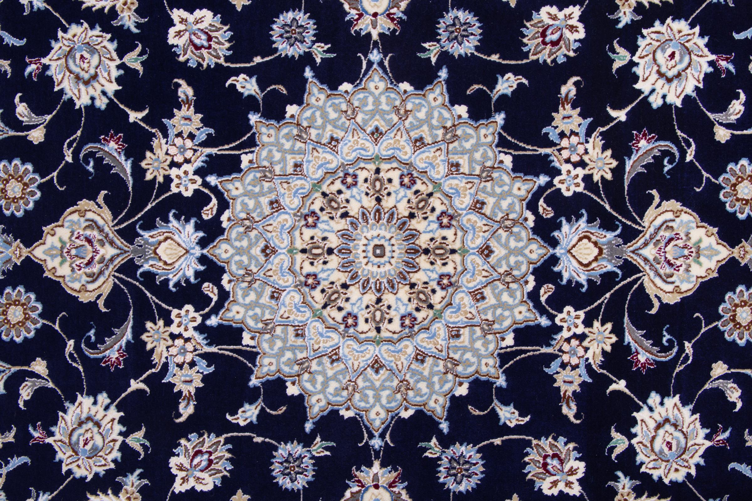 This Nain rug is classified as 9La. The excellent quality, the beautiful oriental design with its curvilinear patterns will delight every buyer. This Persian rug was hand-knotted in the city of Nain, which lies on the western edge of the Dasht-e-Kavir desert, from high-quality wool and natural silk. 9La Nain rugs are significantly finer than a 12La and already show beautiful details.