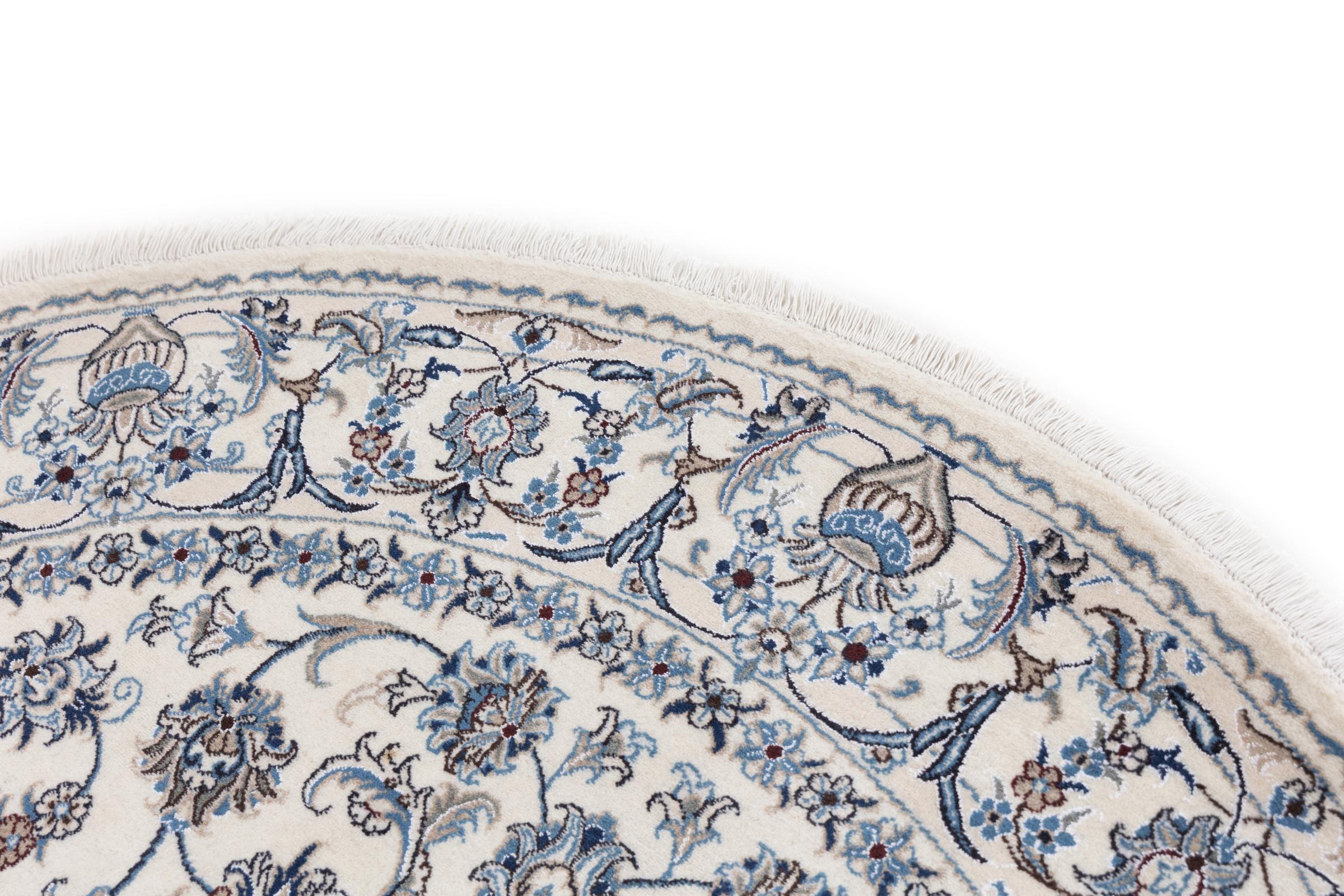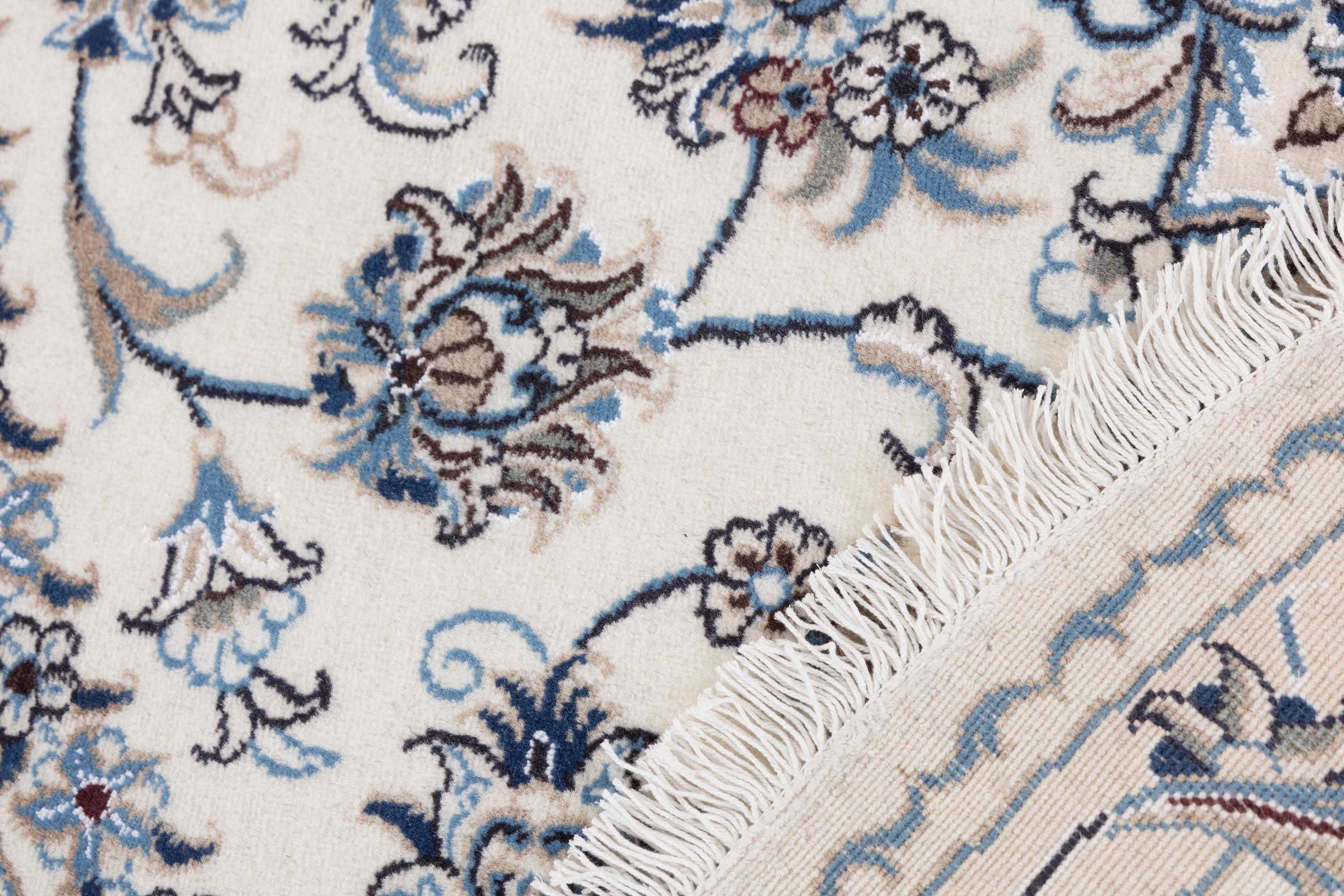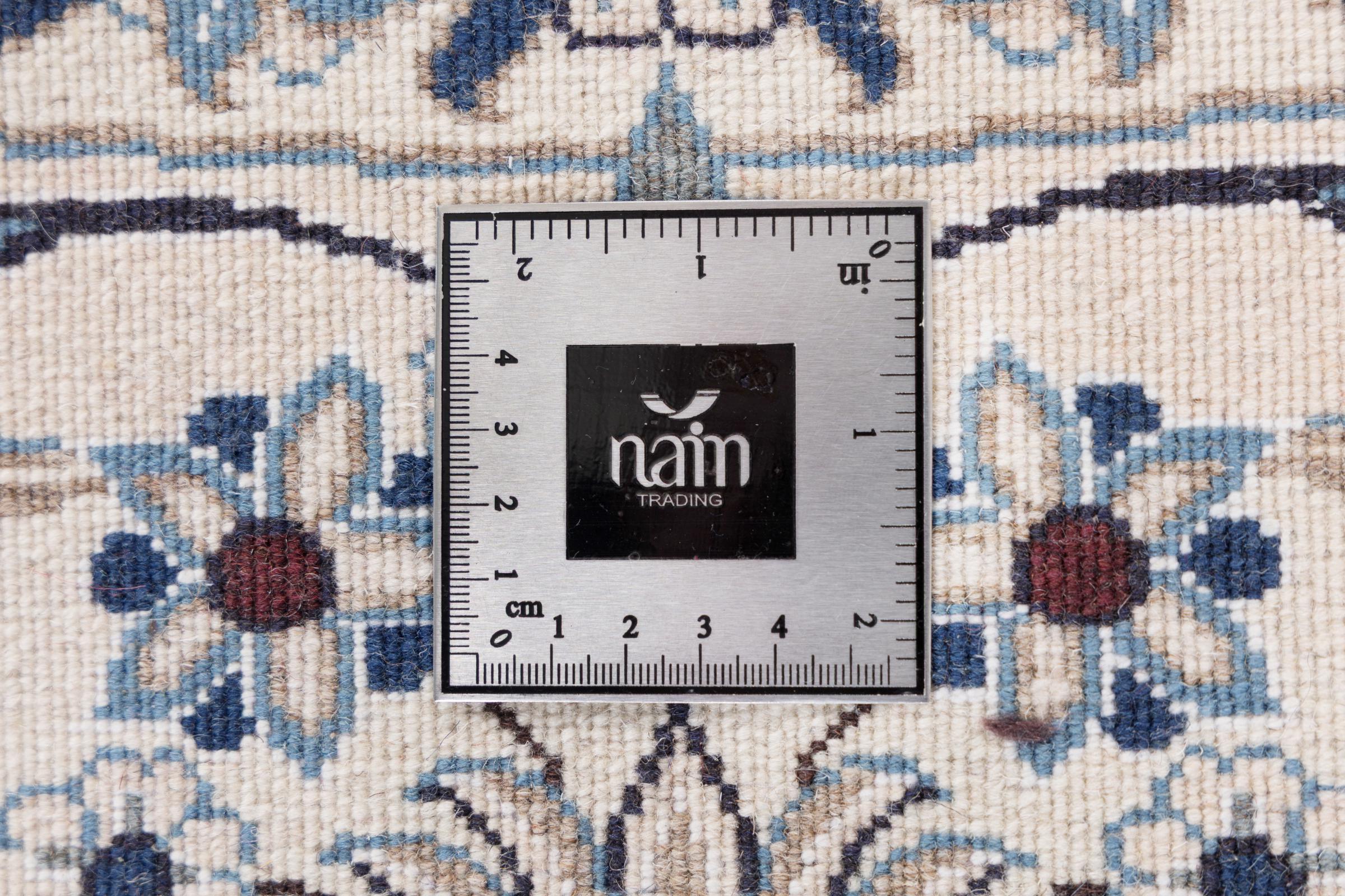This Nain rug is classified as 12La. Its typical Nain colour scheme gives it an elegant and sophisticated look. This Persian rug was hand-knotted in the city of Nain, which lies on the western edge of the Dasht-e-Kavir desert, using high-quality wool and natural silk. At 12La, it is not as finely detailed with ornamentation as a Nain 9La or 6La.