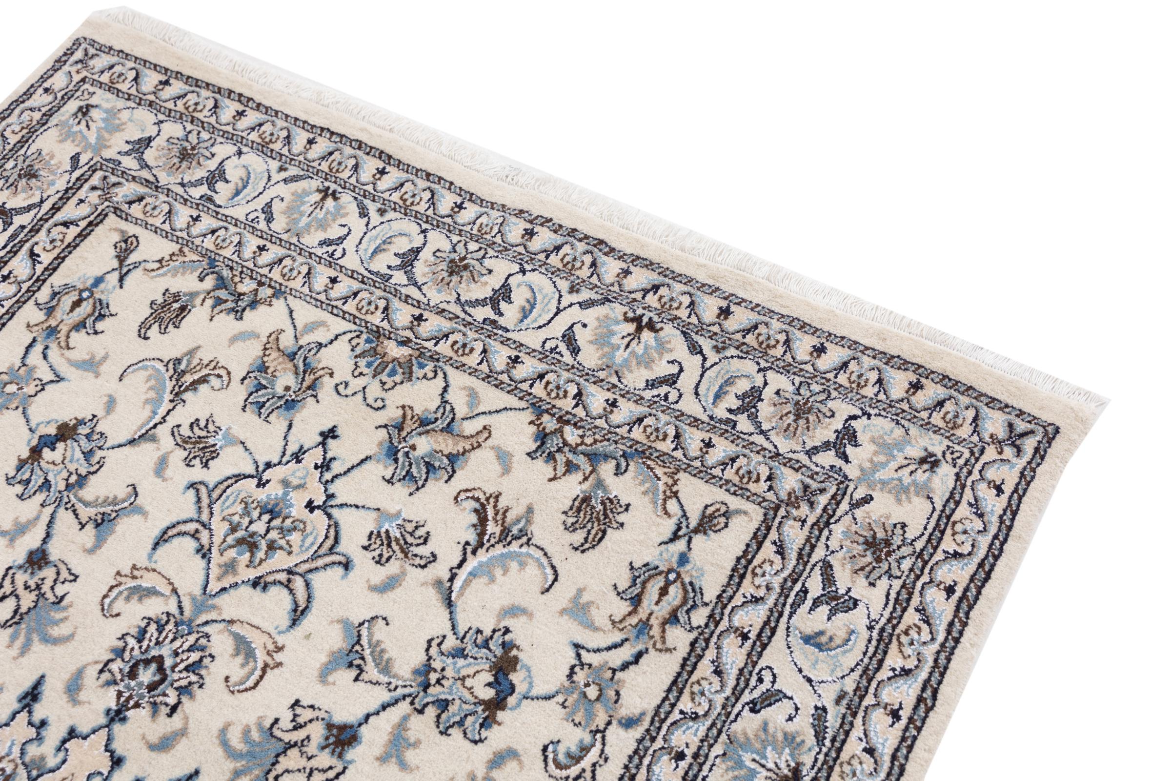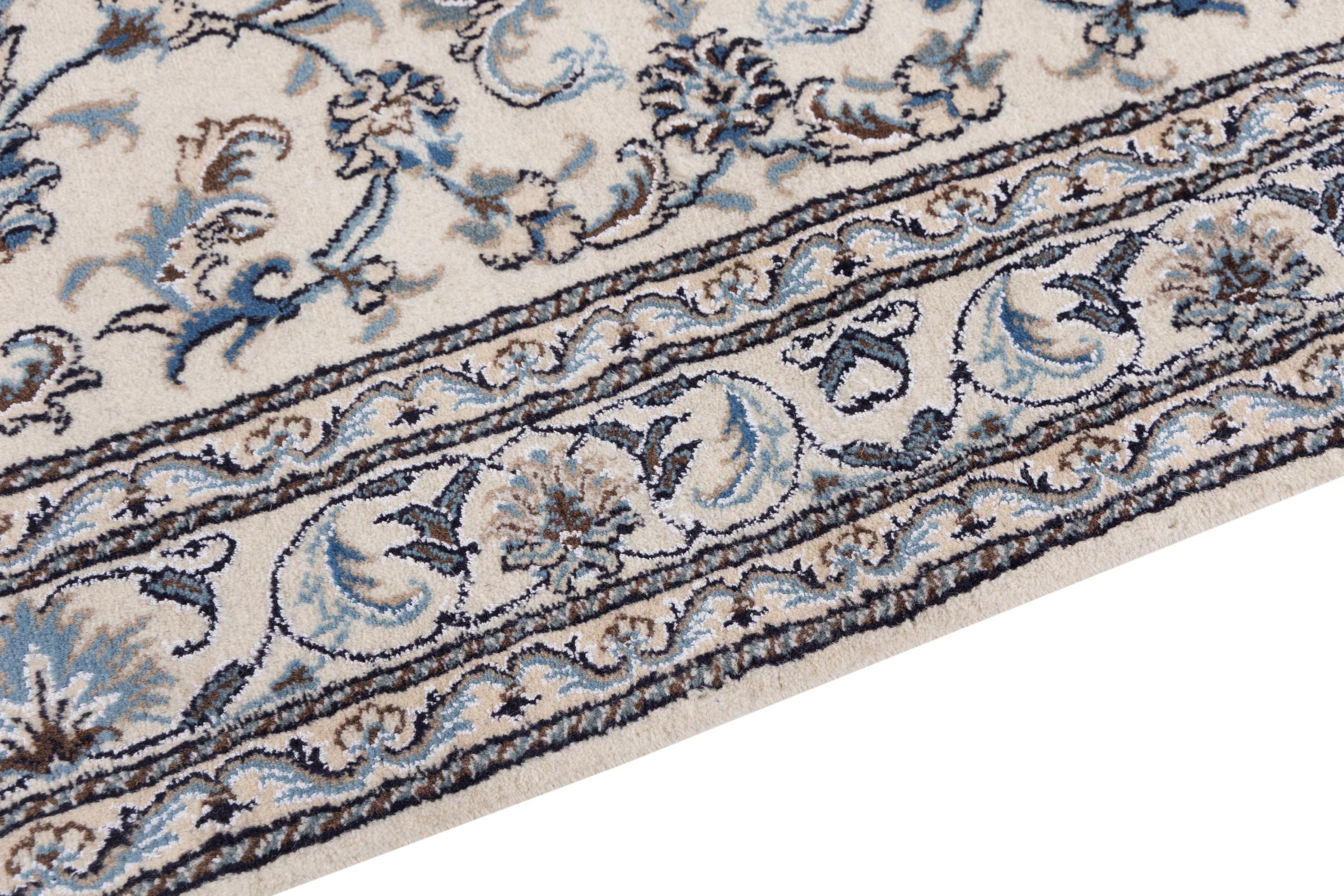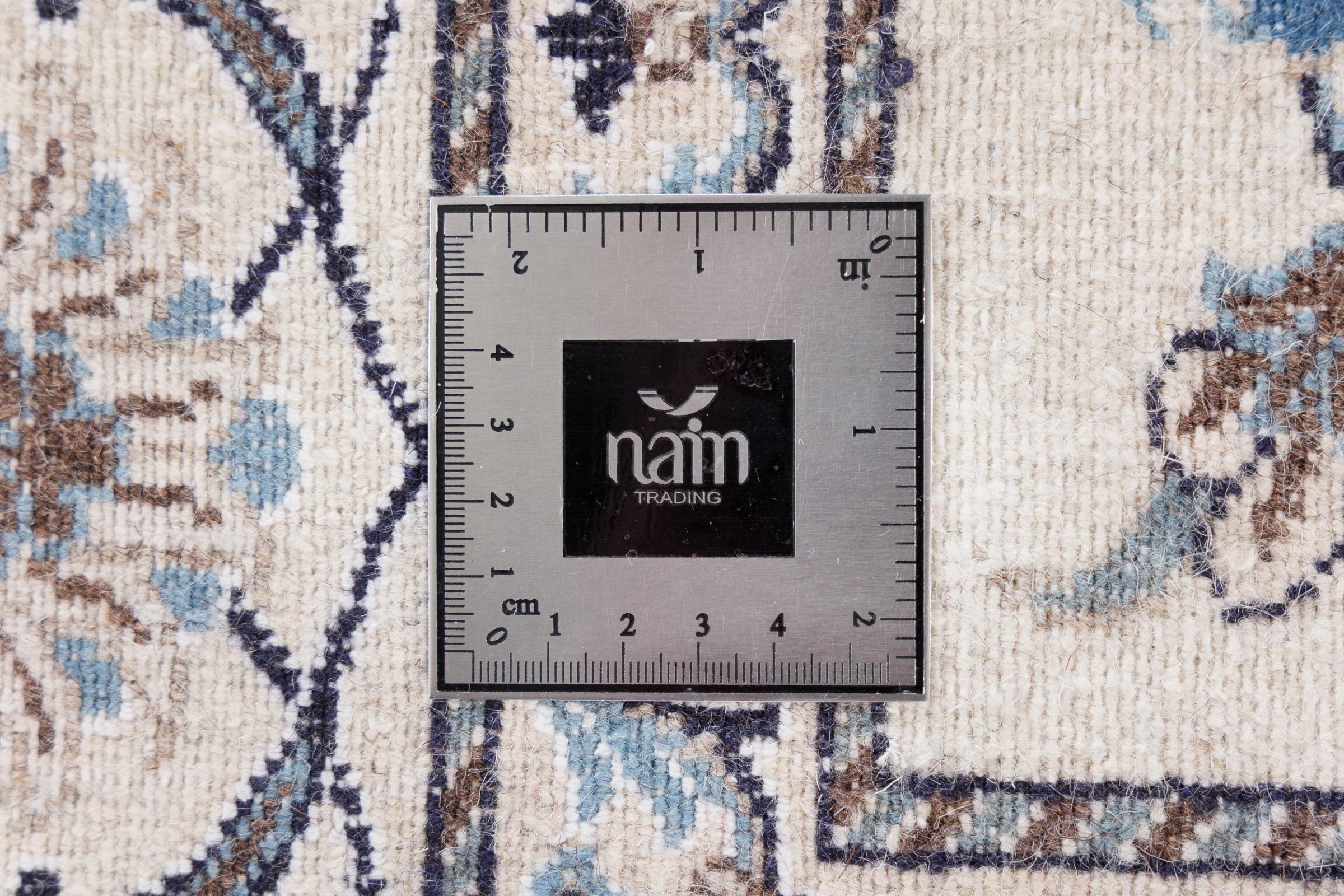 This Nain rug is classified as 12La. Its typical Nain colour scheme gives it an elegant and sophisticated look. This Persian rug was hand-knotted in the city of Nain, which lies on the western edge of the Dasht-e-Kavir desert, using high-quality wool and natural silk. At 12La, it is not as finely detailed with ornamentation as a Nain 9La or 6La.