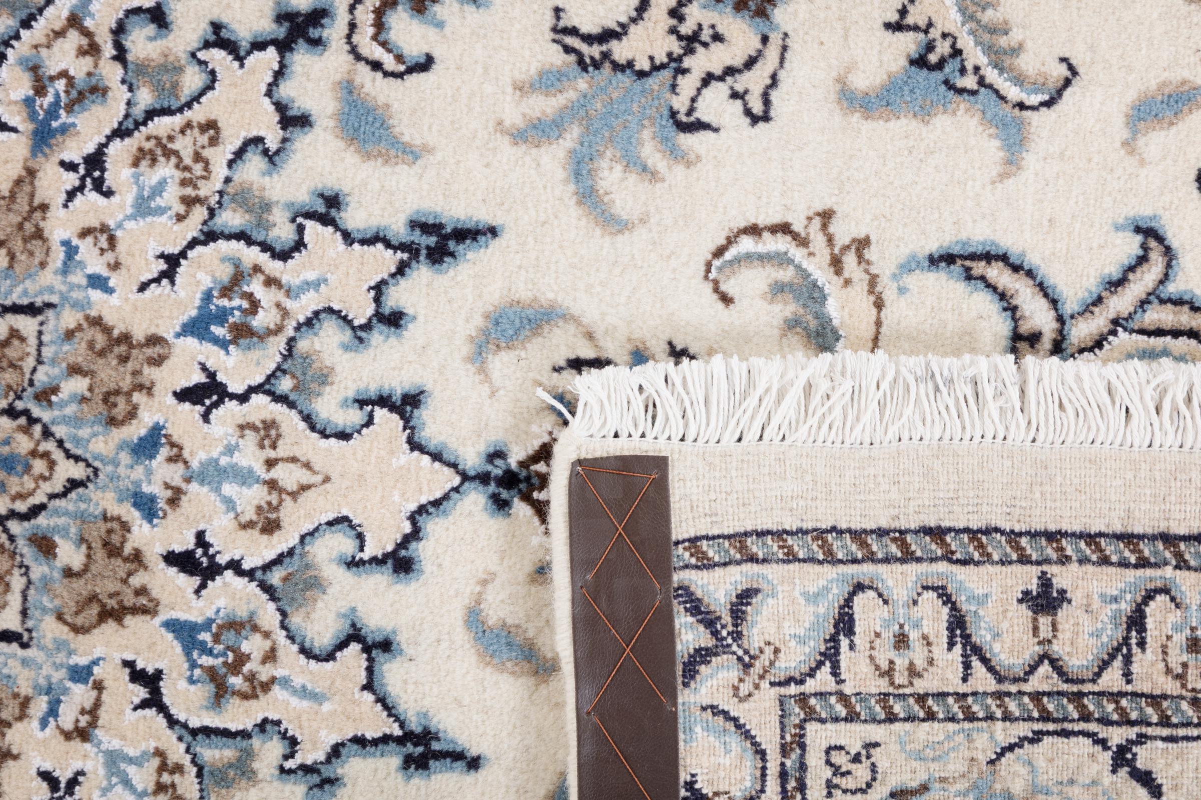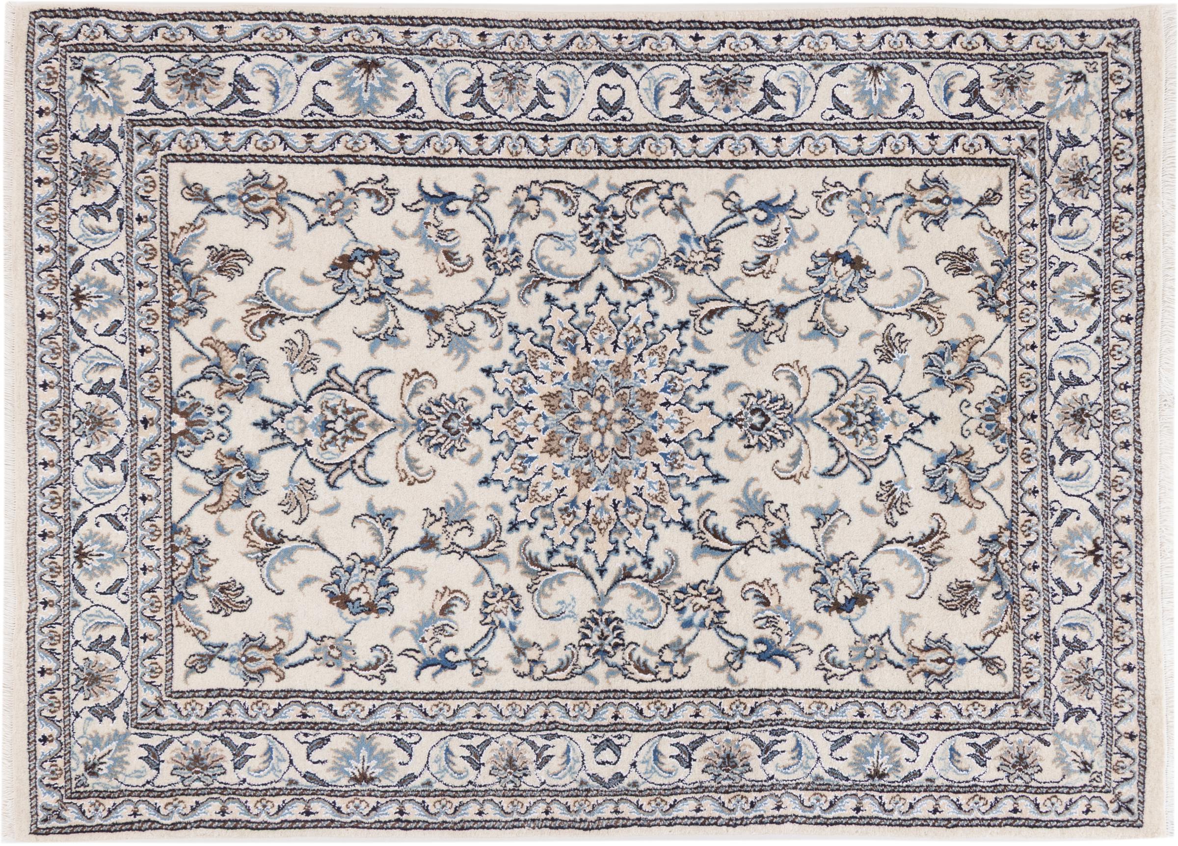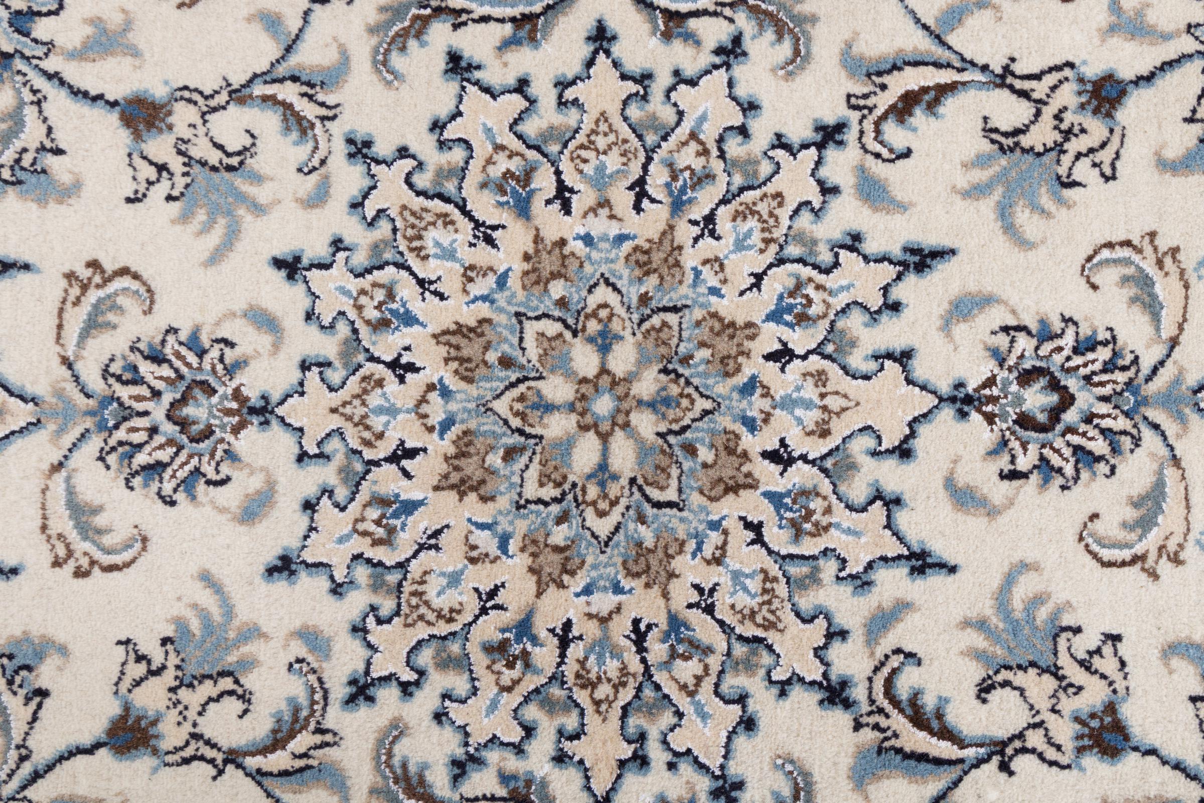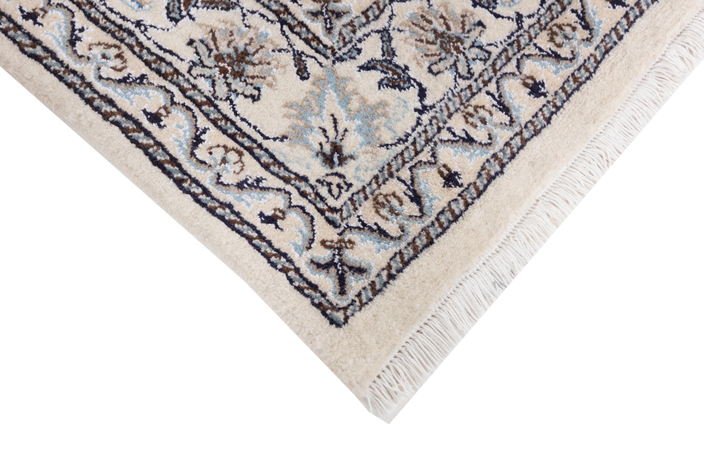 This Nain rug is classified as 12La. Its typical Nain colour scheme gives it an elegant and sophisticated look. This Persian rug was hand-knotted in the city of Nain, which lies on the western edge of the Dasht-e-Kavir desert, using high-quality wool and natural silk. At 12La, it is not as finely detailed with ornamentation as a Nain 9La or 6La.