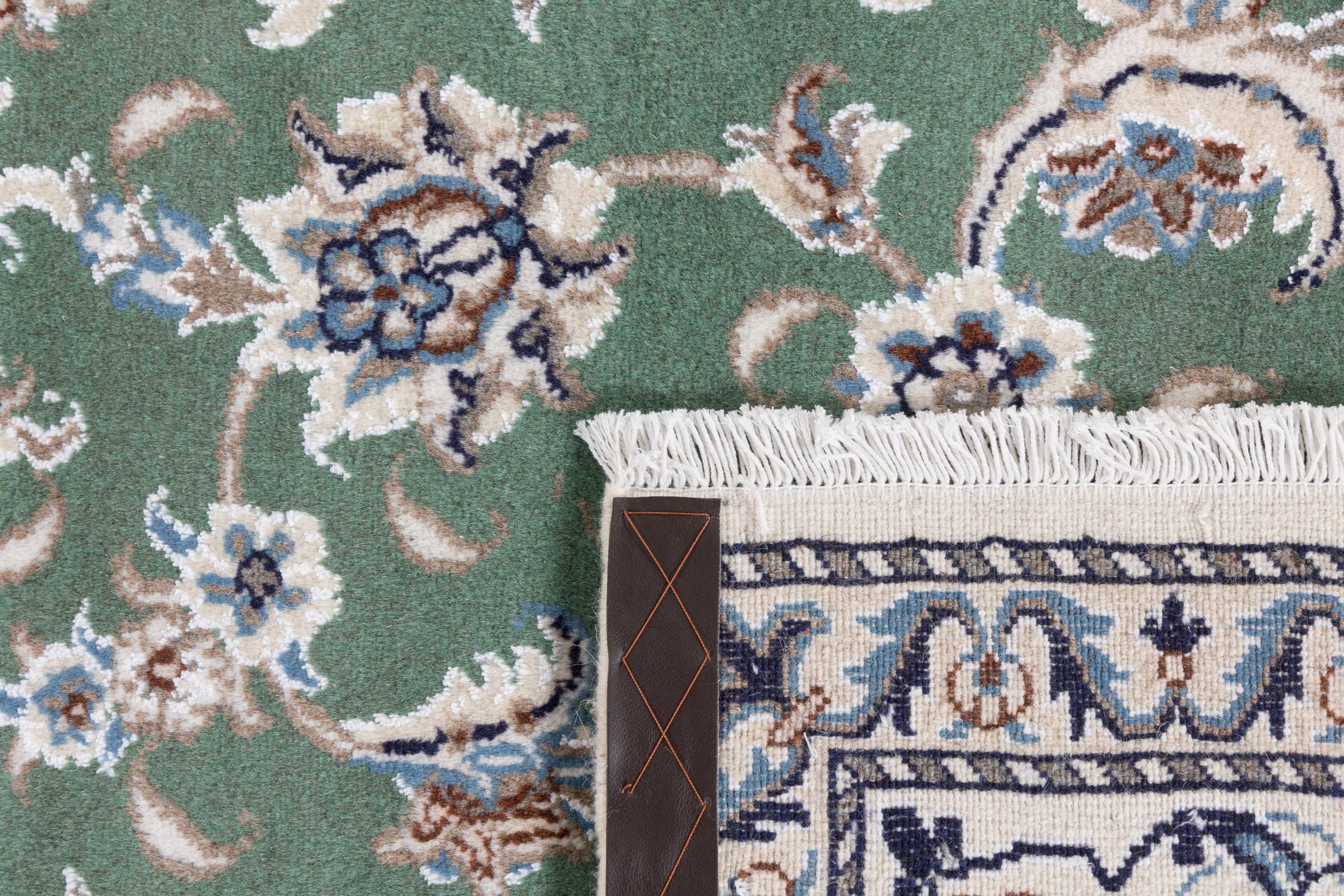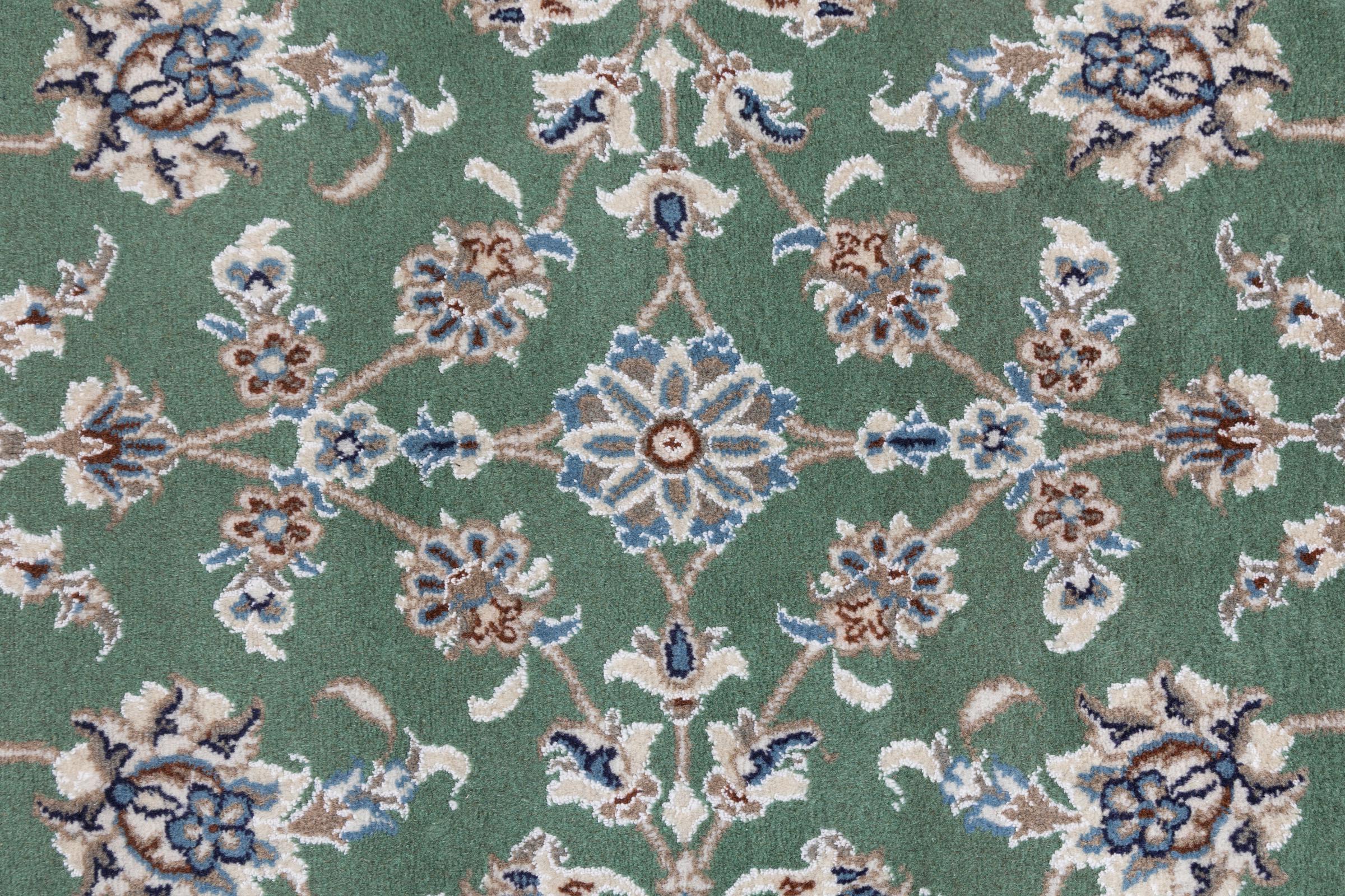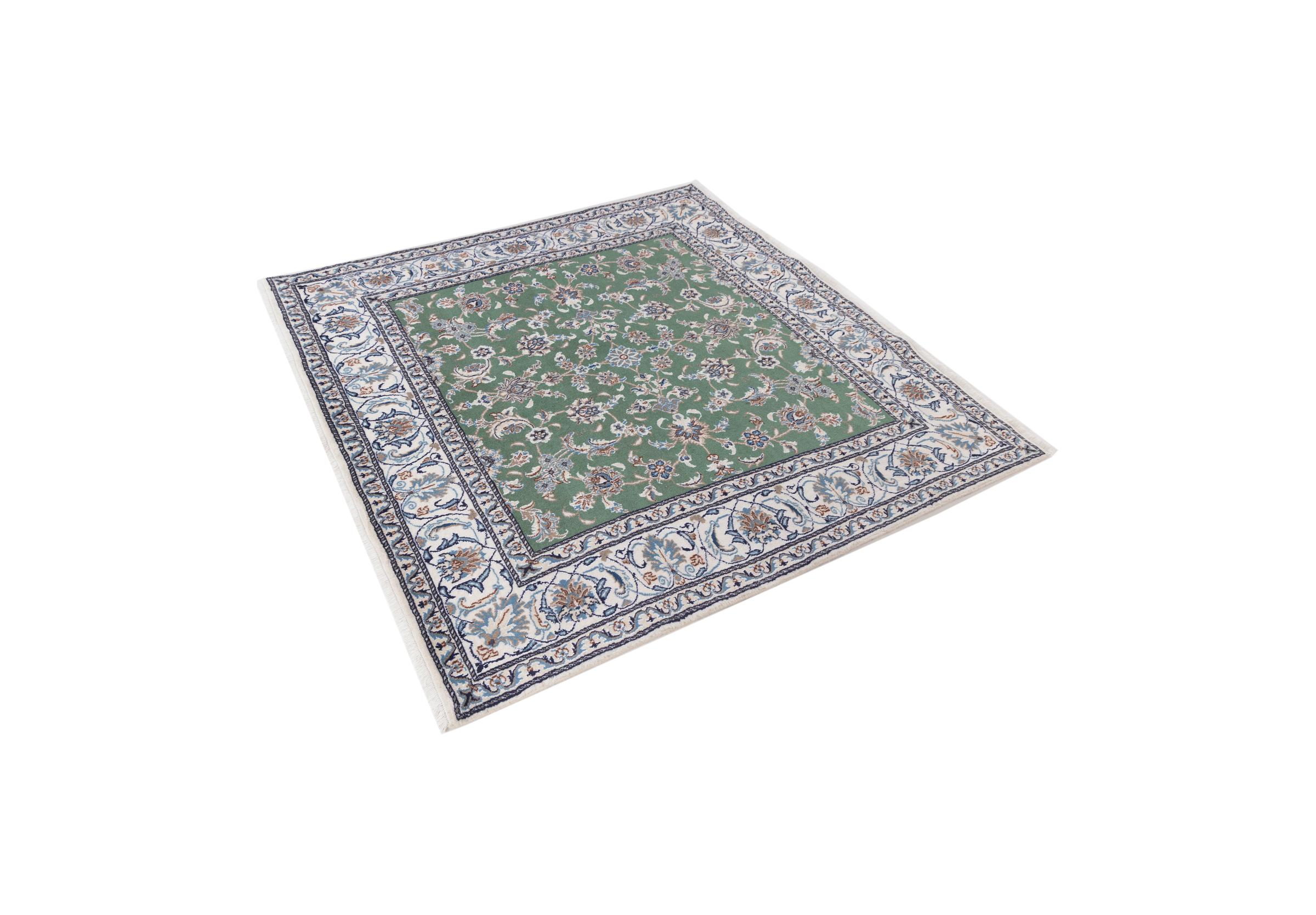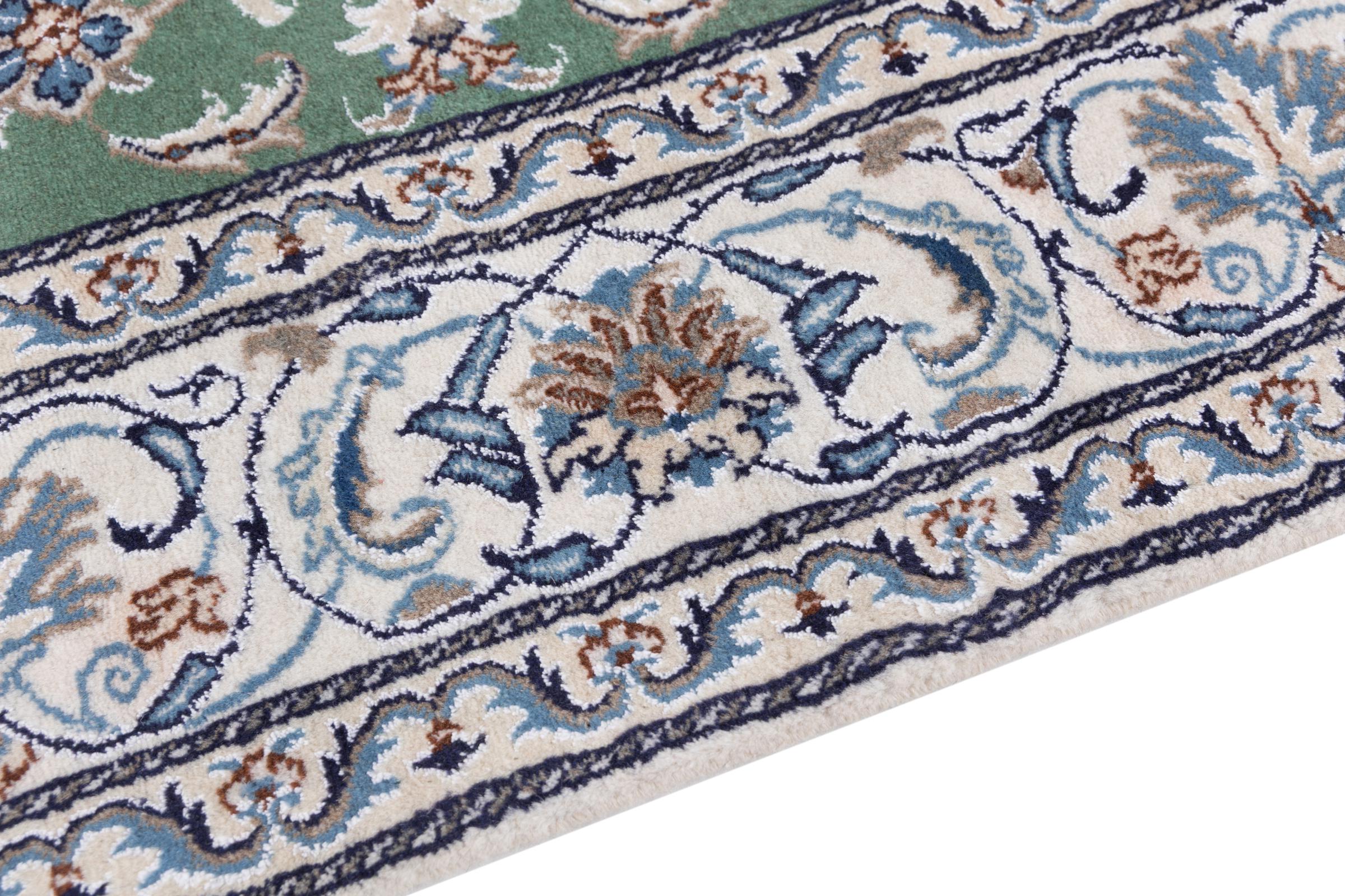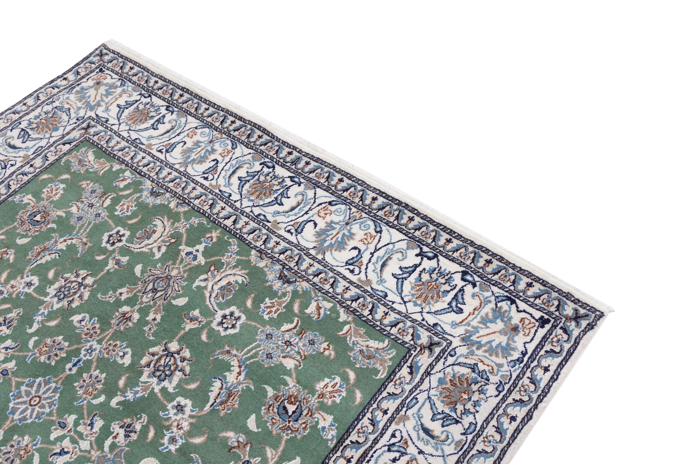 This Nain rug is classified as 12La. Its typical Nain colour scheme gives it an elegant and sophisticated look. This Persian rug was hand-knotted in the city of Nain, which lies on the western edge of the Dasht-e-Kavir desert, using high-quality wool and natural silk. At 12La, it is not as finely detailed with ornamentation as a Nain 9La or 6La.
