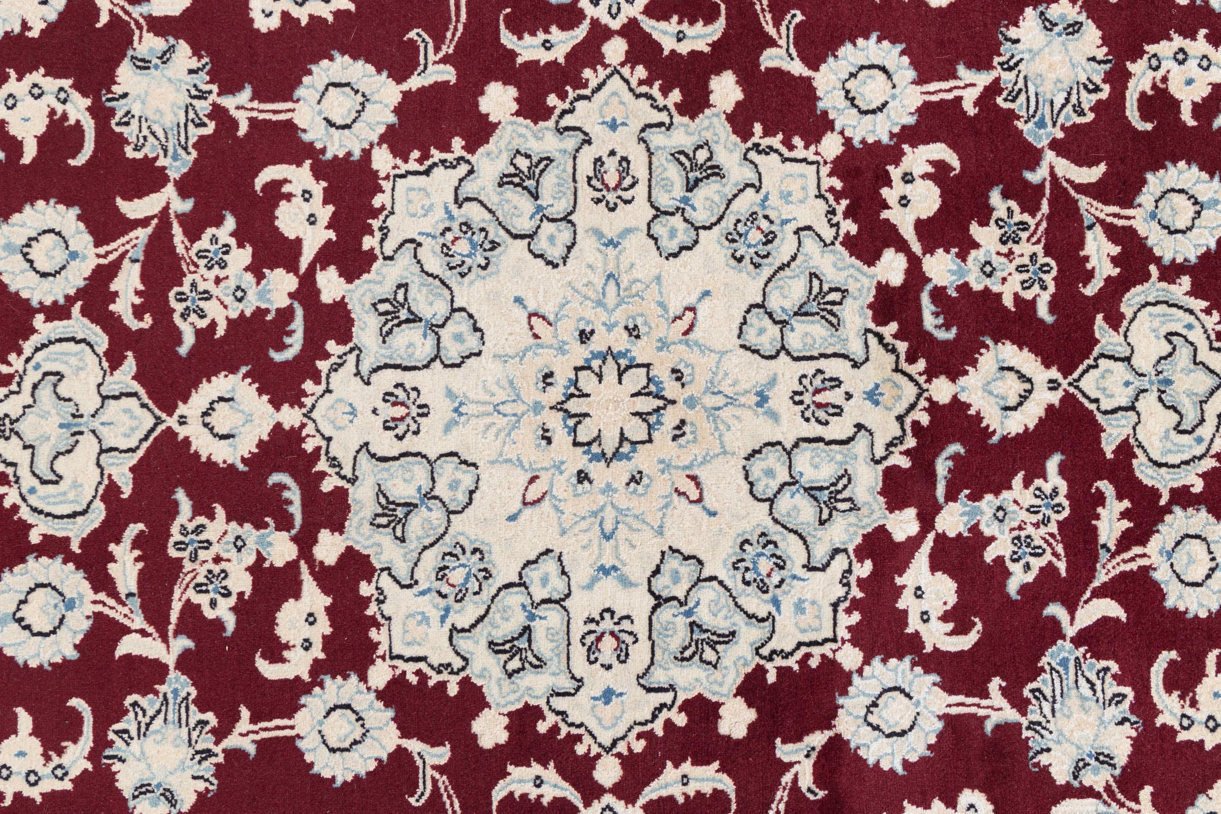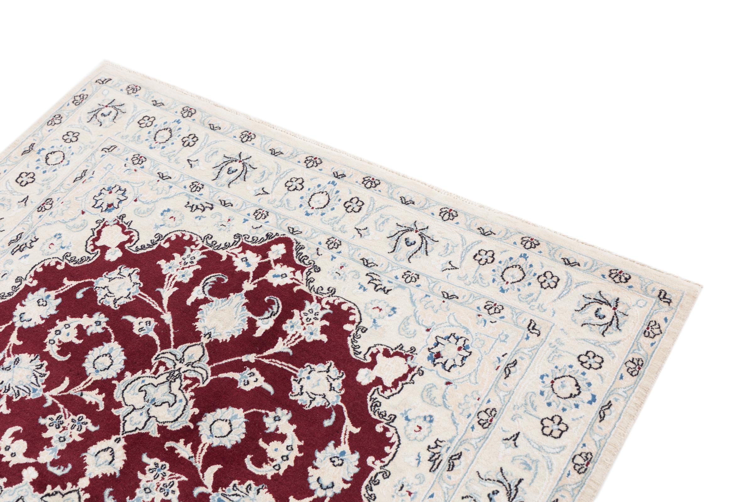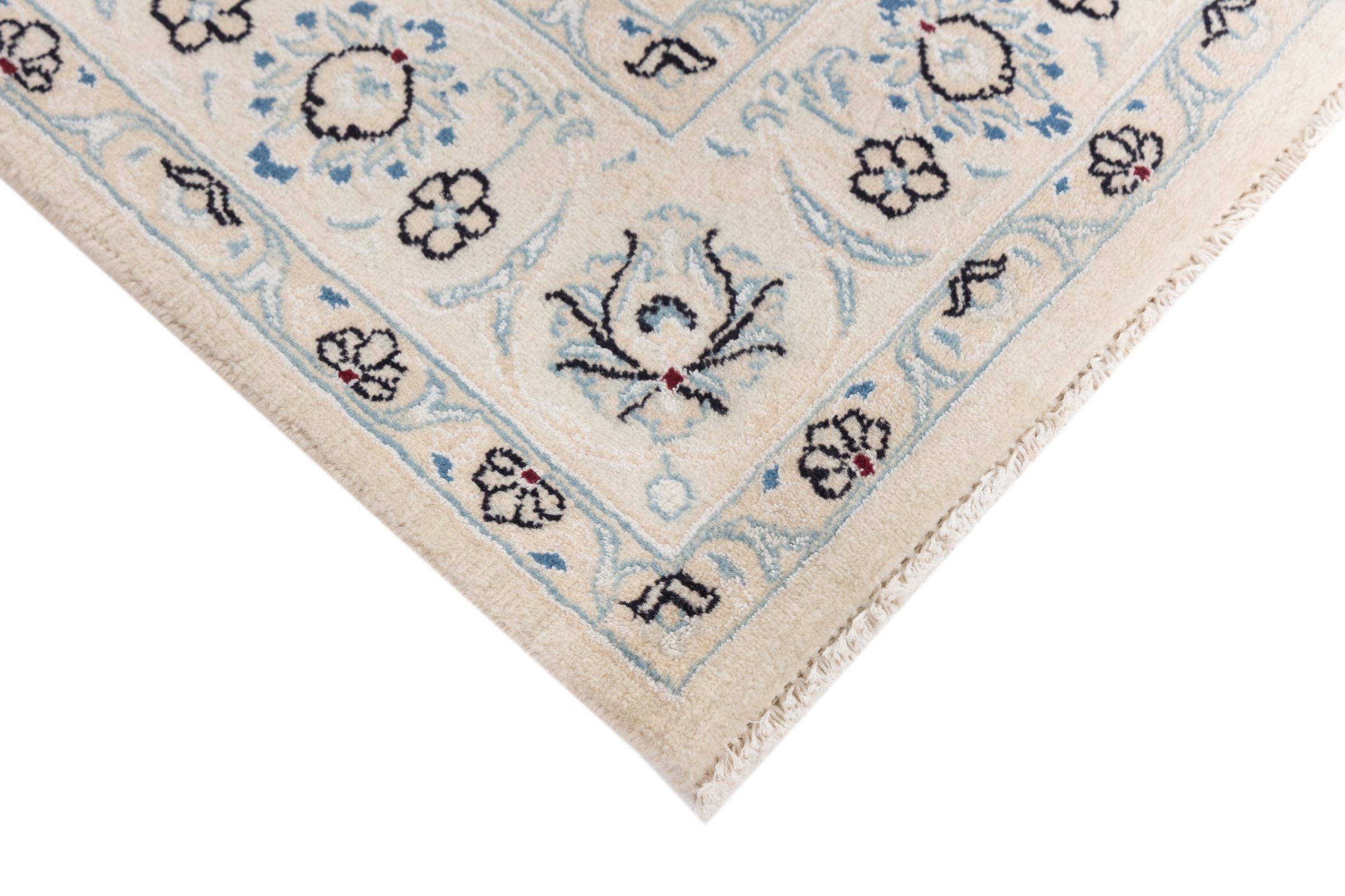 This Nain rug is classified as 9La. The excellent quality, the beautiful oriental design with its curvilinear patterns will delight every buyer. This Persian rug was hand-knotted in the city of Nain, which lies on the western edge of the Dasht-e-Kavir desert, from high-quality wool and natural silk. 9La Nain rugs are significantly finer than a 12La and already show beautiful details.