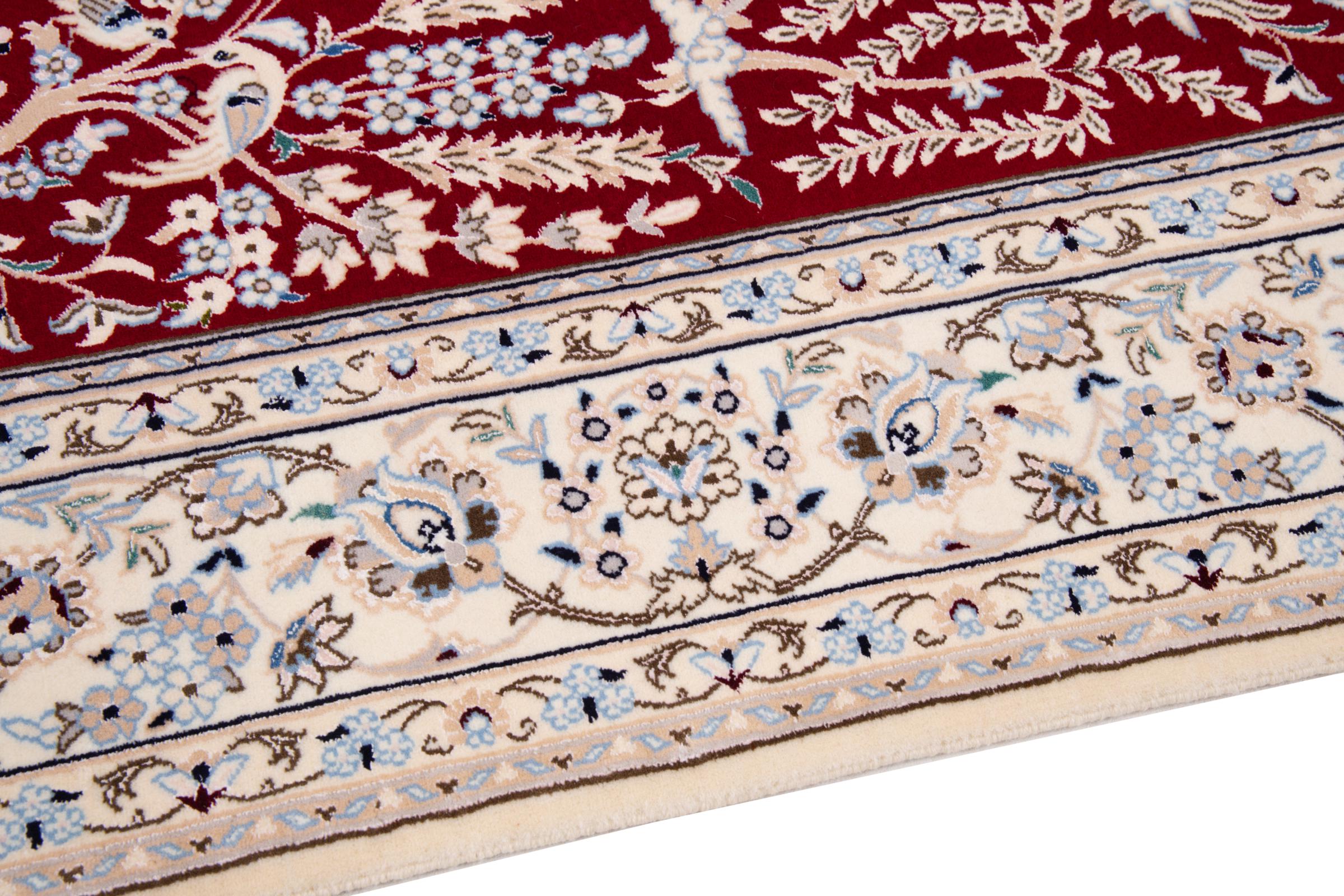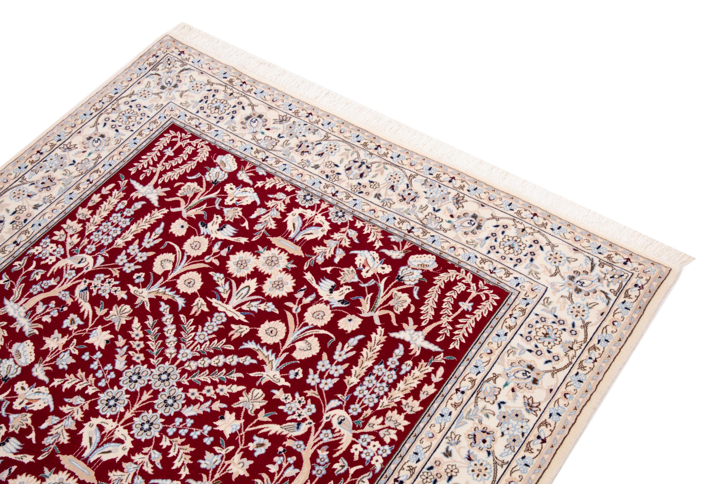 This Nain rug combines quality, tradition and an unmistakable design. It was hand-knotted from high-quality cork wool and natural silk in the desert town of the same name, Nain. Lovers of valuable rugs from Iran will love this Persian rug. With Nain rugs in the 6La and 4La classifications, you have a real work of art with an incredible level of detail that you can really lose yourself in. Nain 4La rugs are almost impossible to find today, as they are extremely elaborate to produce.