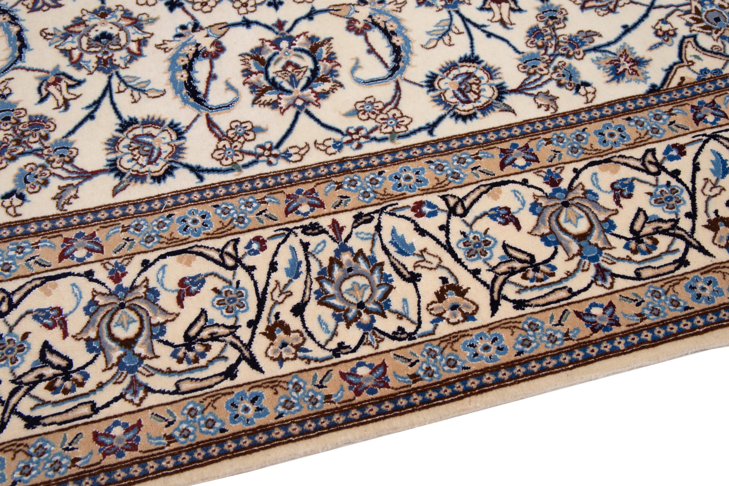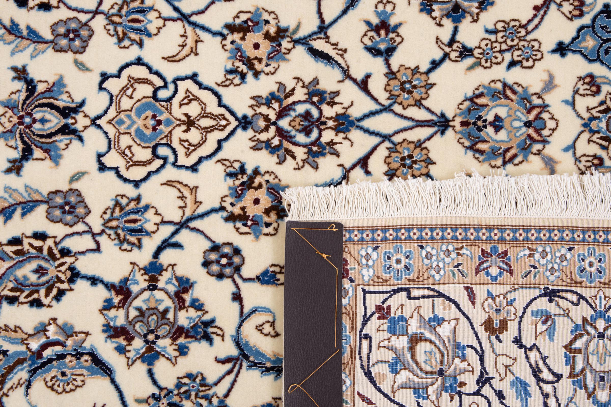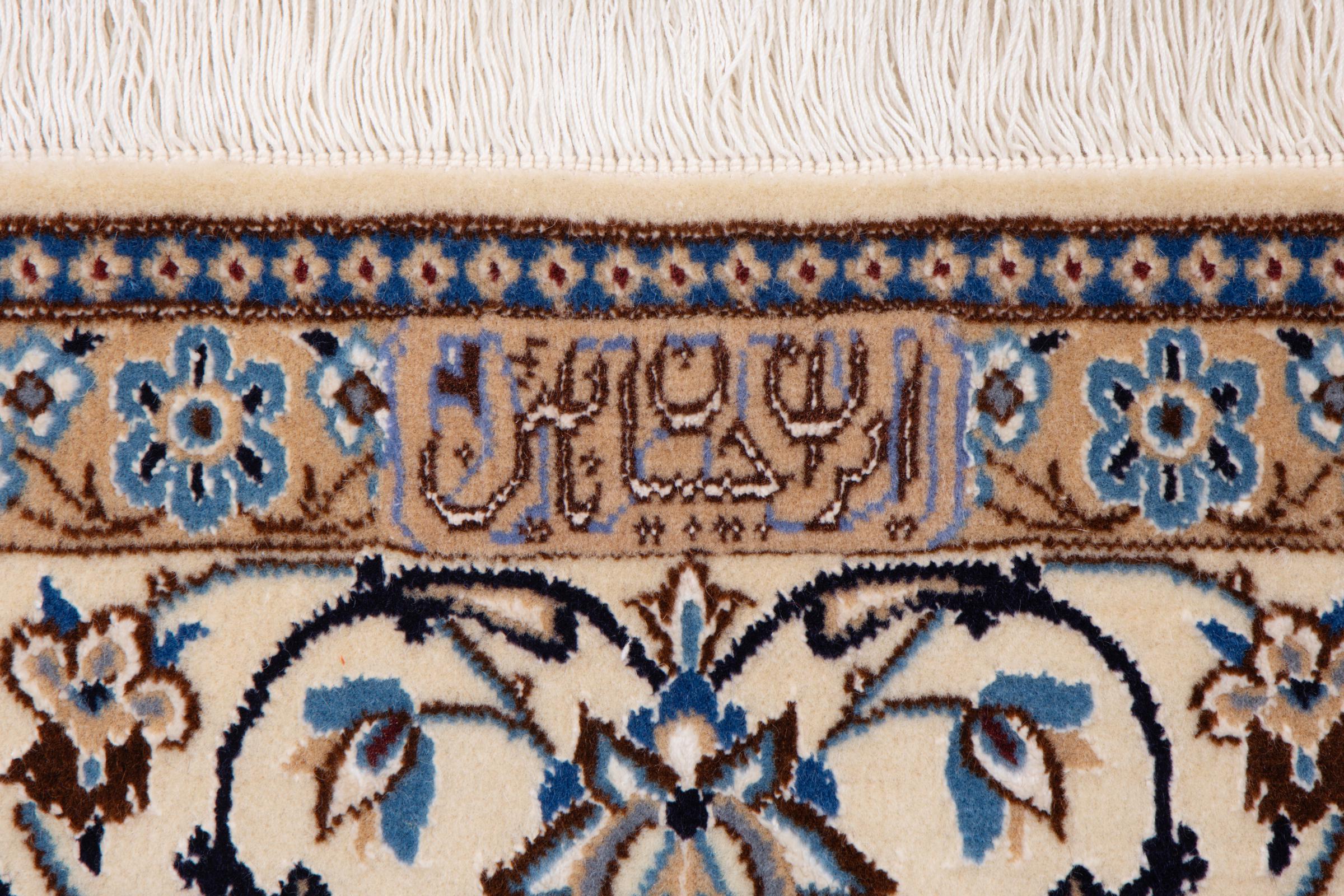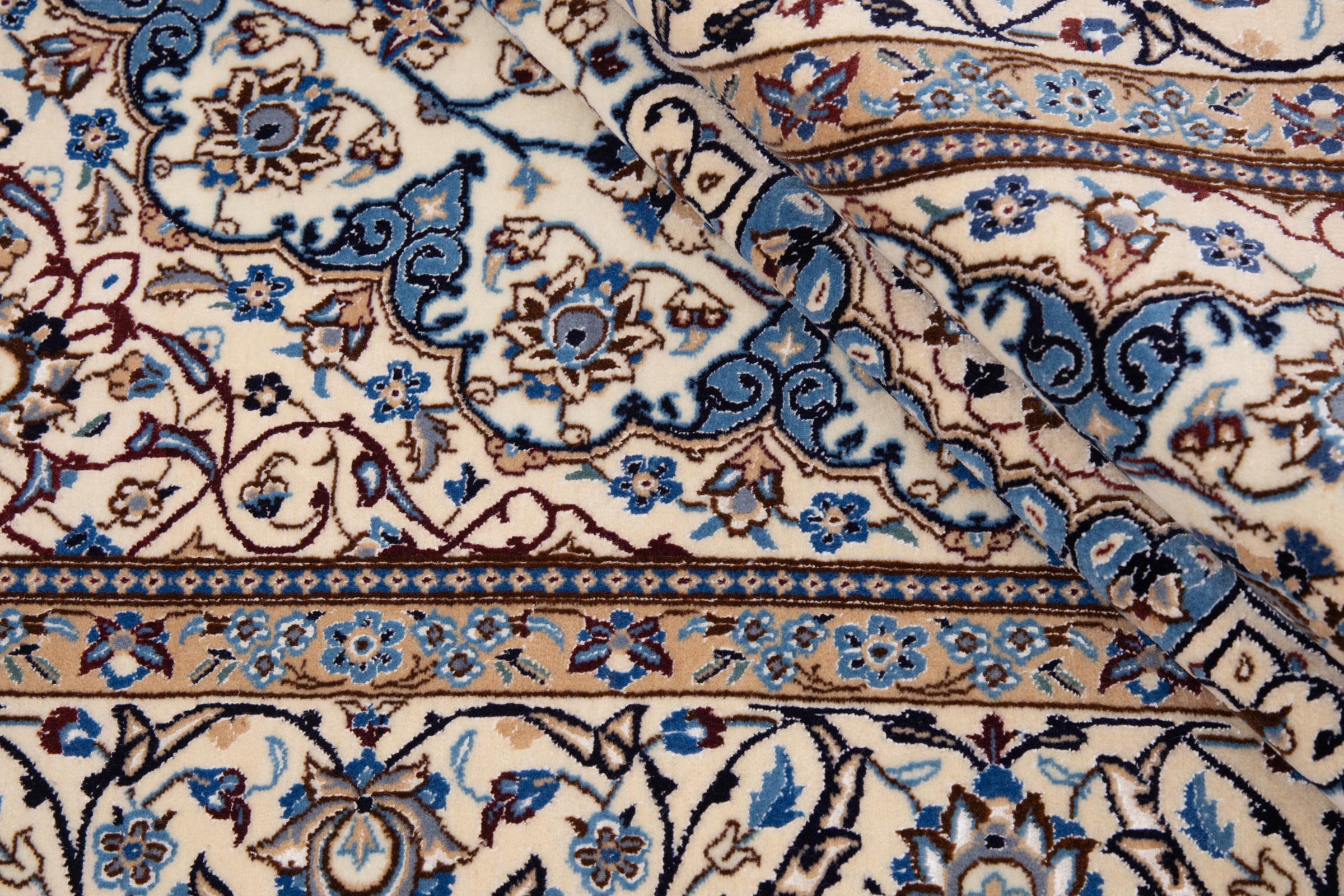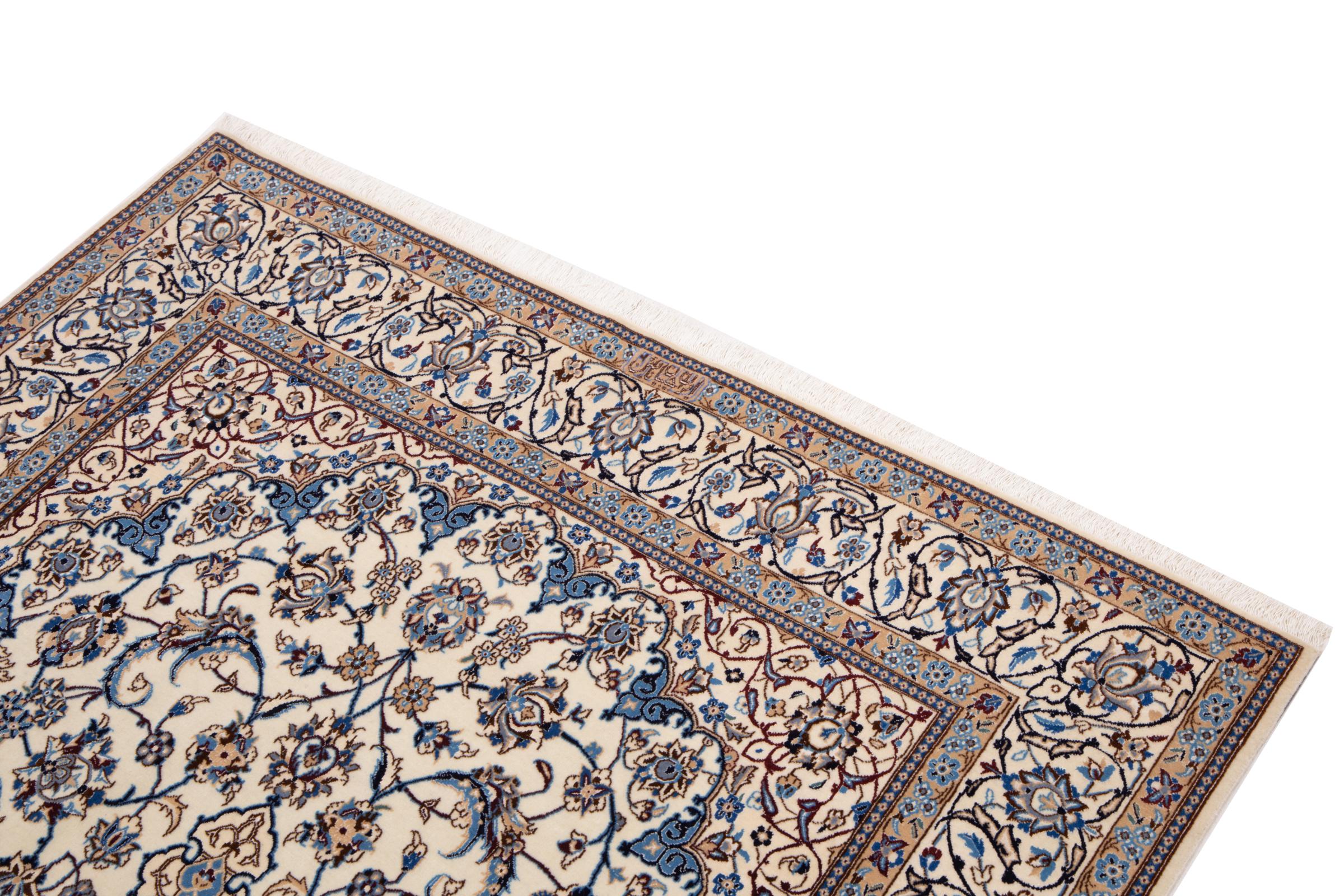 This Nain rug combines quality, tradition and an unmistakable design. It was hand-knotted from high-quality cork wool and natural silk in the desert town of the same name, Nain. Lovers of valuable rugs from Iran will love this Persian rug. With Nain rugs in the 6La and 4La classifications, you have a real work of art with an incredible level of detail that you can really lose yourself in. Nain 4La rugs are almost impossible to find today, as they are extremely elaborate to produce.
