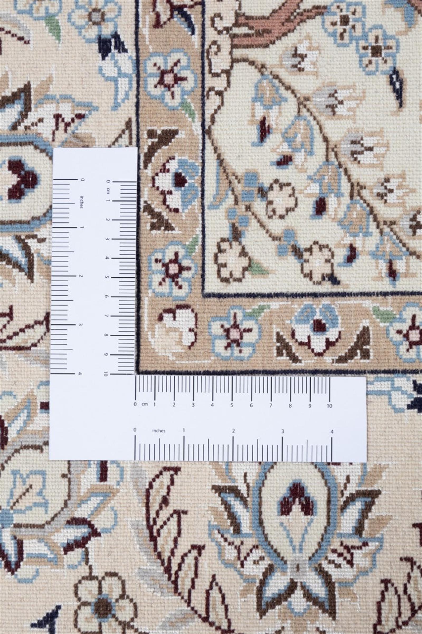 This Nain rug is classified as 9La. The excellent quality, the beautiful oriental design with its curvilinear patterns will delight every buyer. This Persian rug was hand-knotted in the city of Nain, which lies on the western edge of the Dasht-e-Kavir desert, from high-quality wool and natural silk. 9La Nain rugs are significantly finer than a 12La and already show beautiful details.