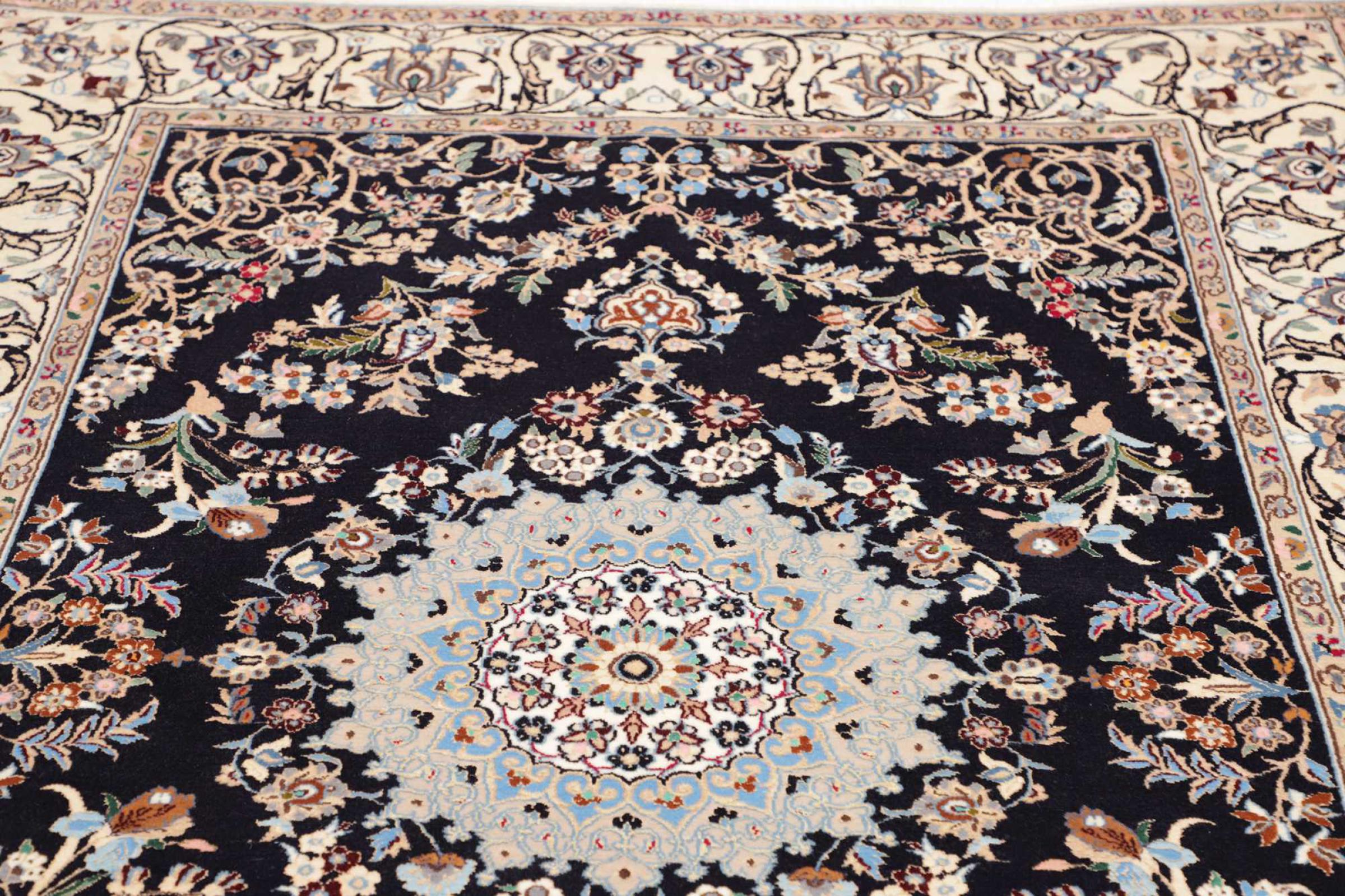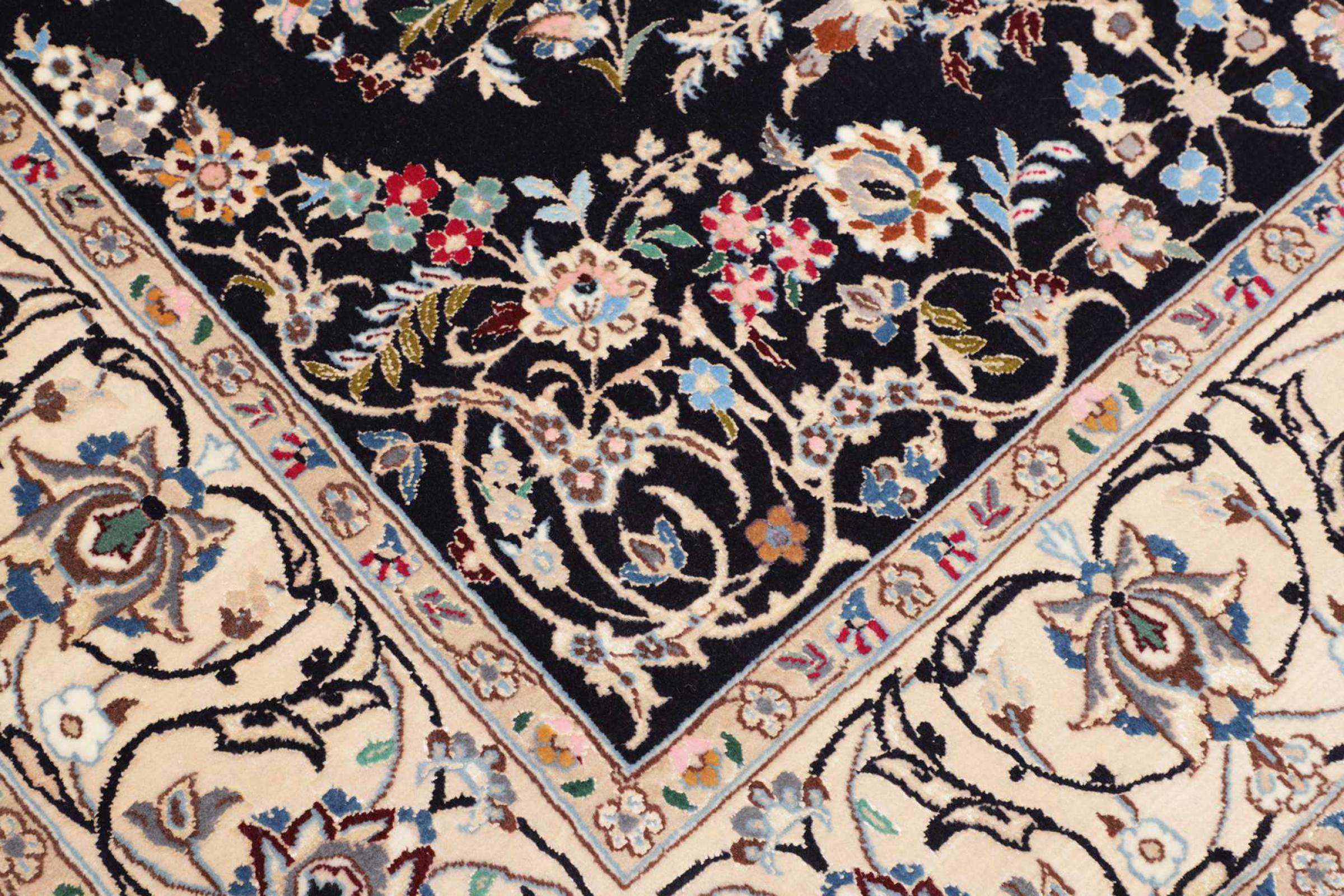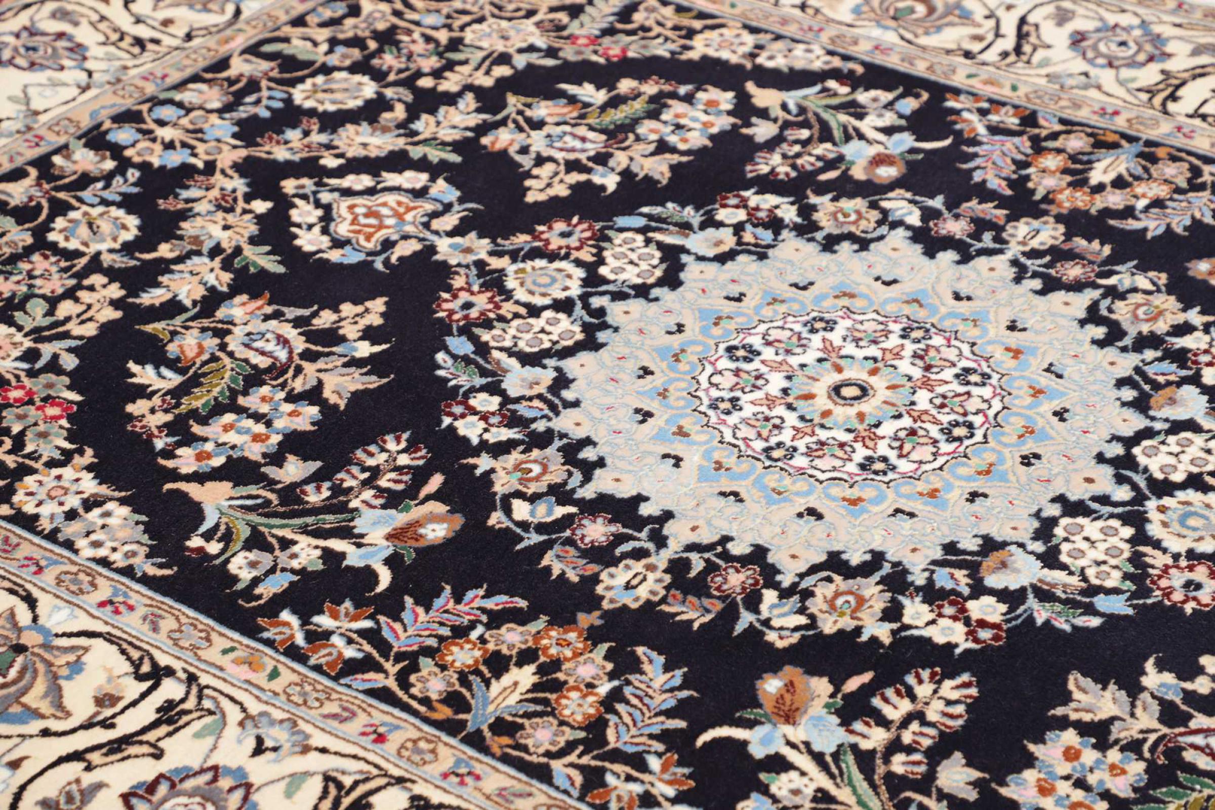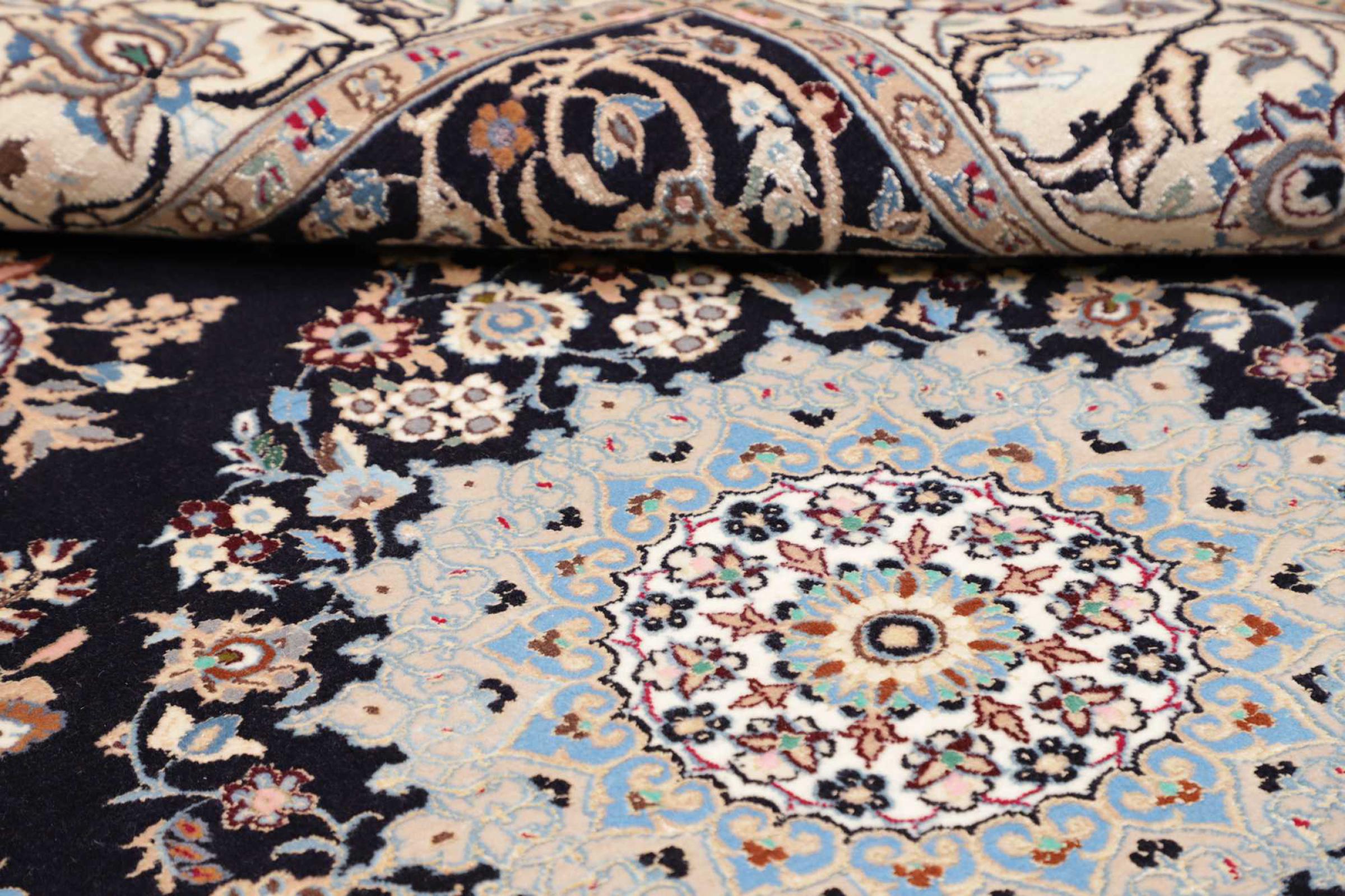 This Nain rug is classified as 9La. The excellent quality, the beautiful oriental design with its curvilinear patterns will delight every buyer. This Persian rug was hand-knotted in the city of Nain, which lies on the western edge of the Dasht-e-Kavir desert, from high-quality wool and natural silk. 9La Nain rugs are significantly finer than a 12La and already show beautiful details.