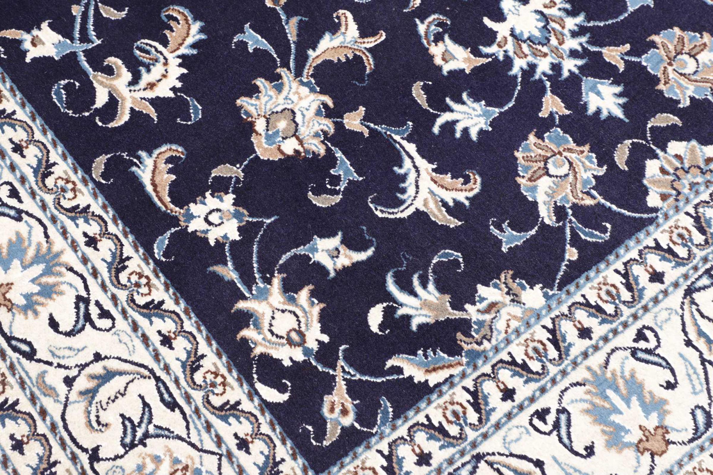 This Nain rug is classified as 12La. Its typical Nain colour scheme gives it an elegant and sophisticated look. This Persian rug was hand-knotted in the city of Nain, which lies on the western edge of the Dasht-e-Kavir desert, using high-quality wool and natural silk. At 12La, it is not as finely detailed with ornamentation as a Nain 9La or 6La.