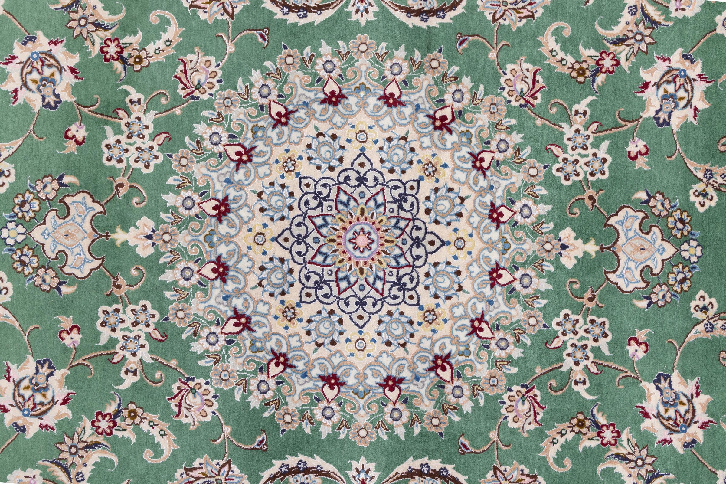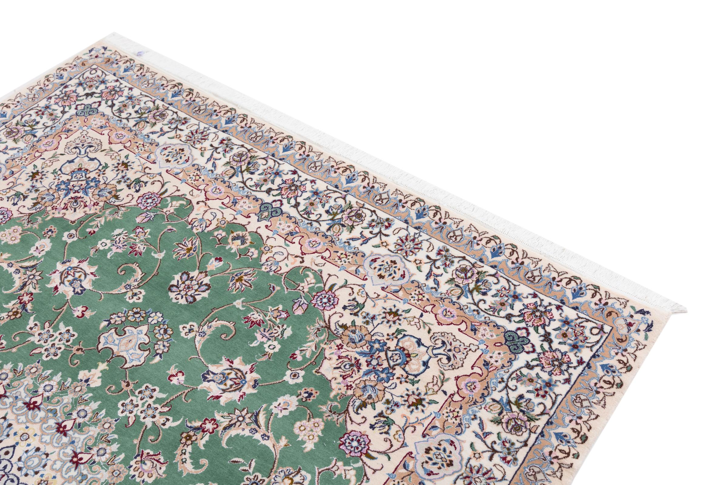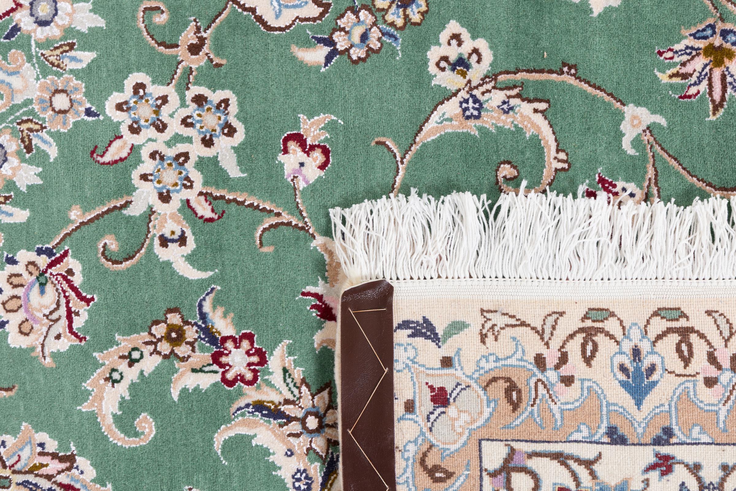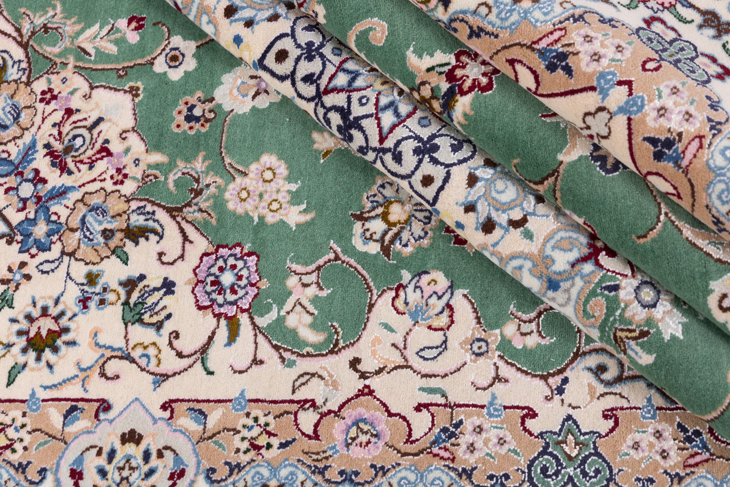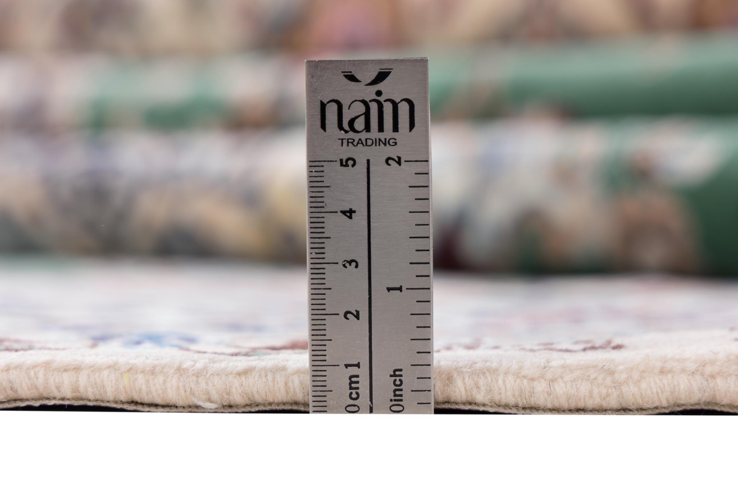 This Nain rug is classified as 9La. The excellent quality, the beautiful oriental design with its curvilinear patterns will delight every buyer. This Persian rug was hand-knotted in the city of Nain, which lies on the western edge of the Dasht-e-Kavir desert, from high-quality wool and natural silk. 9La Nain rugs are significantly finer than a 12La and already show beautiful details.