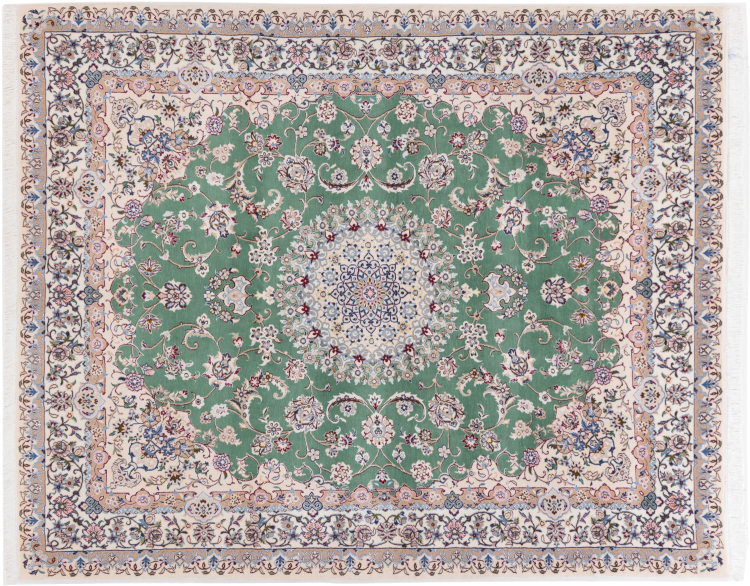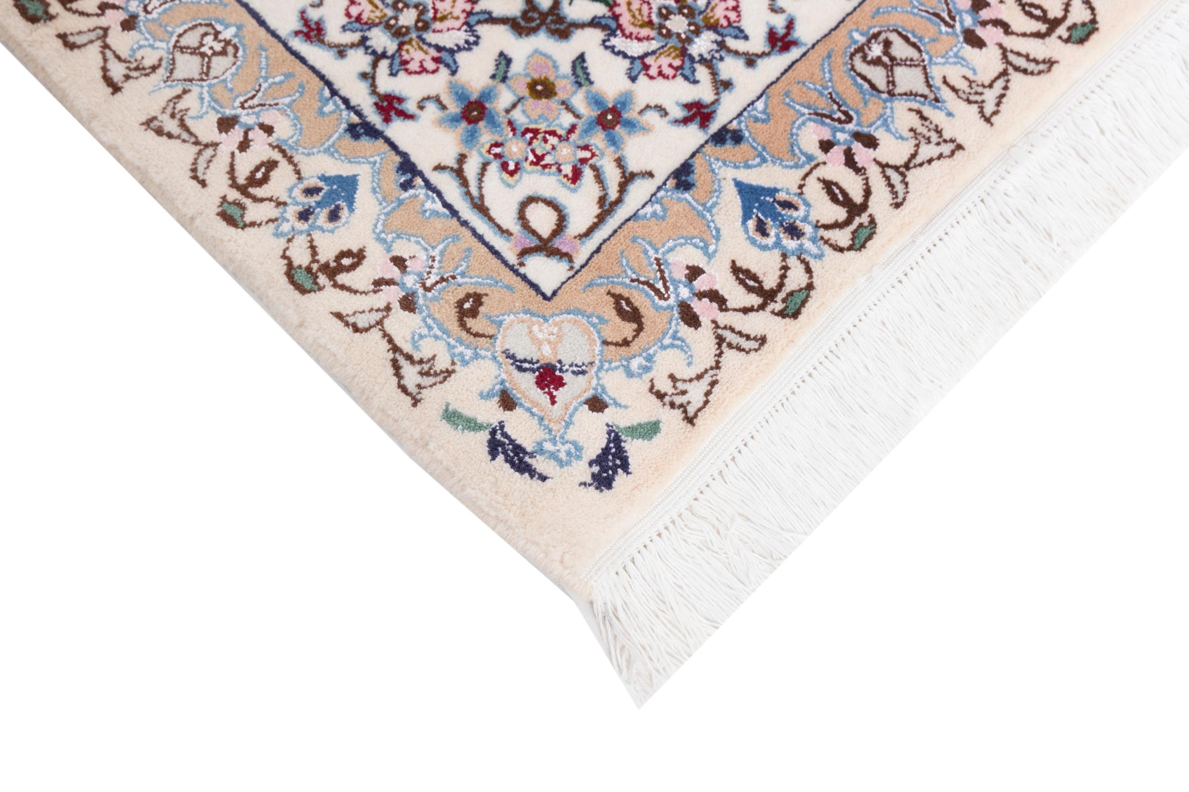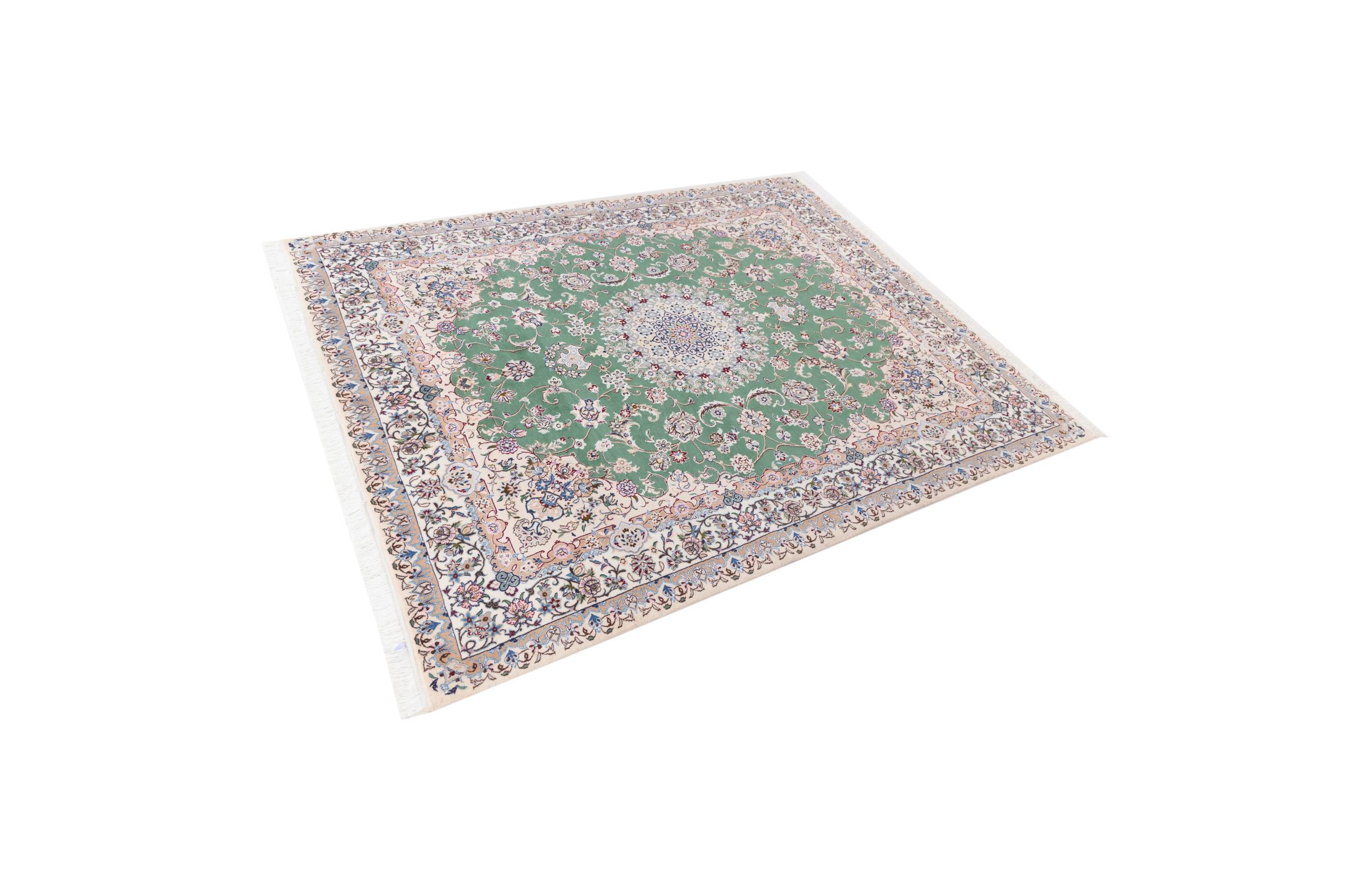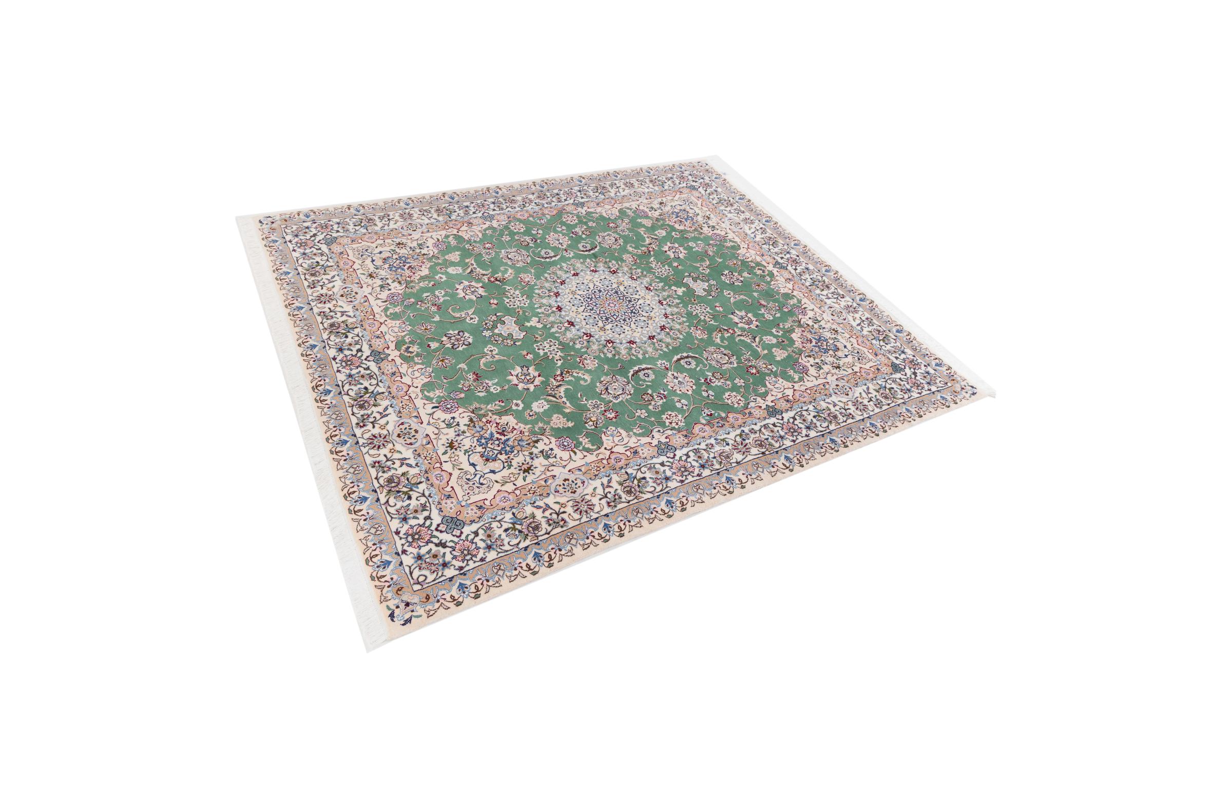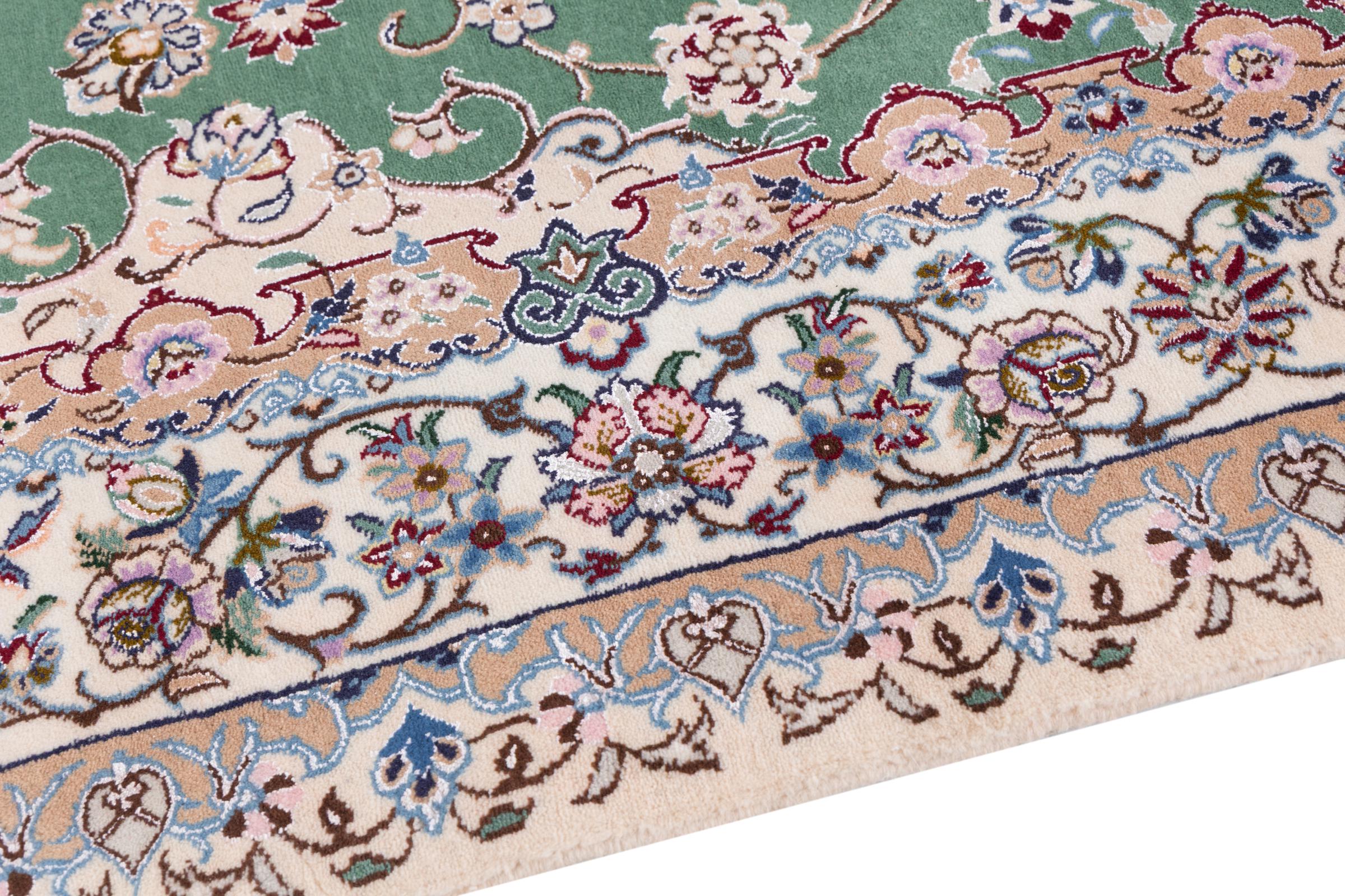 This Nain rug is classified as 9La. The excellent quality, the beautiful oriental design with its curvilinear patterns will delight every buyer. This Persian rug was hand-knotted in the city of Nain, which lies on the western edge of the Dasht-e-Kavir desert, from high-quality wool and natural silk. 9La Nain rugs are significantly finer than a 12La and already show beautiful details.