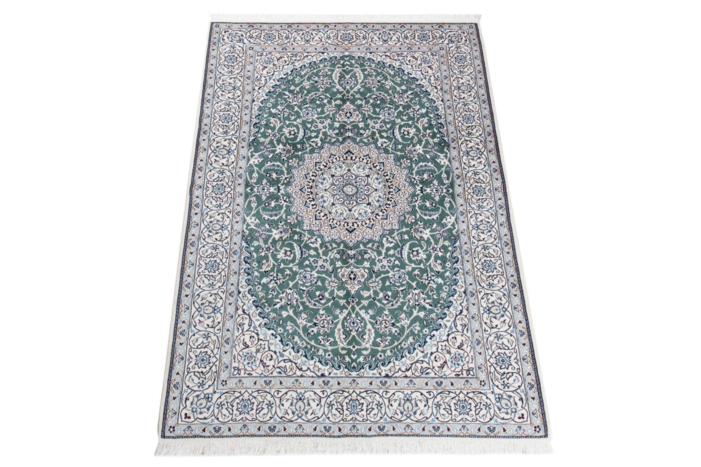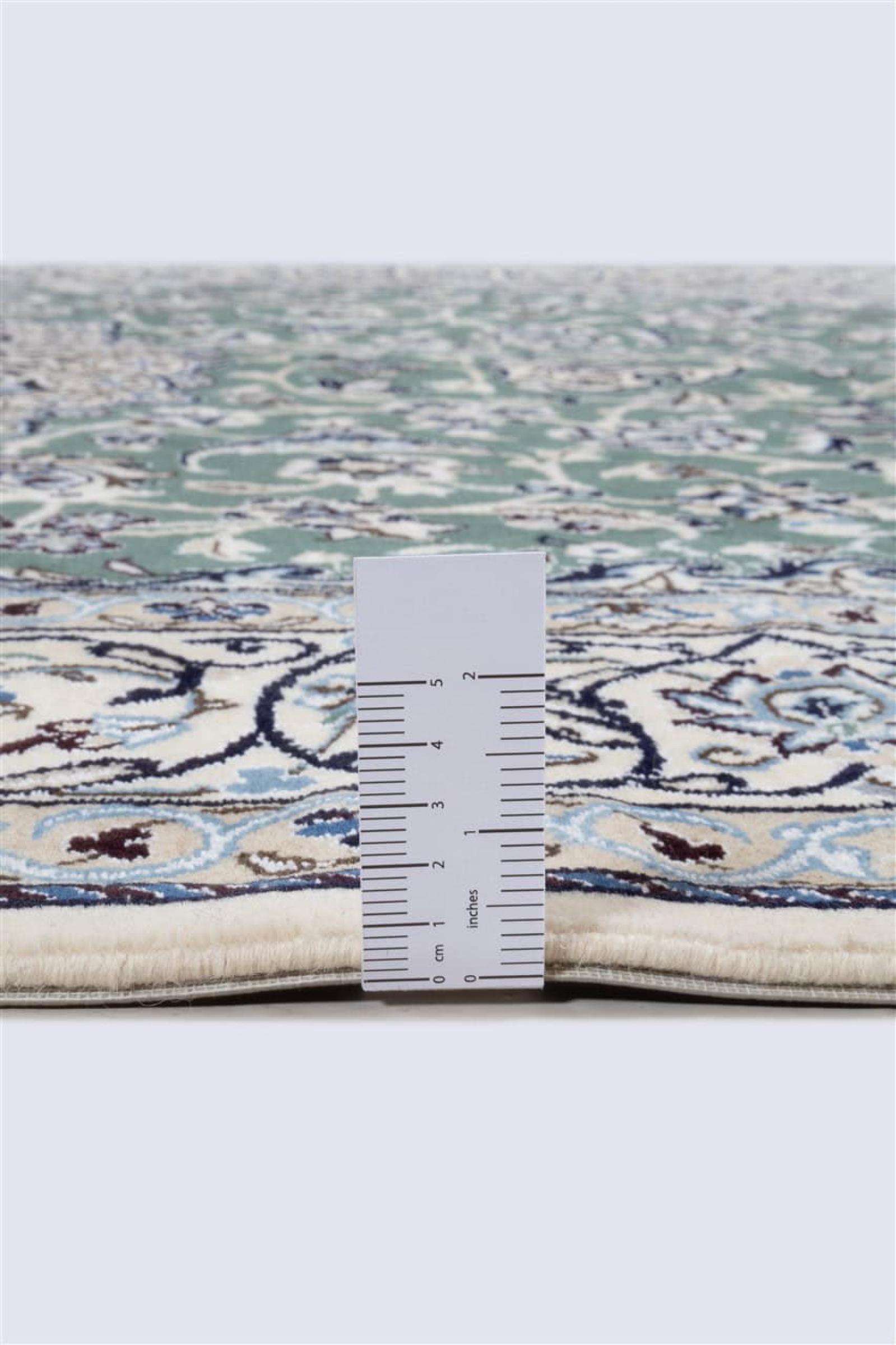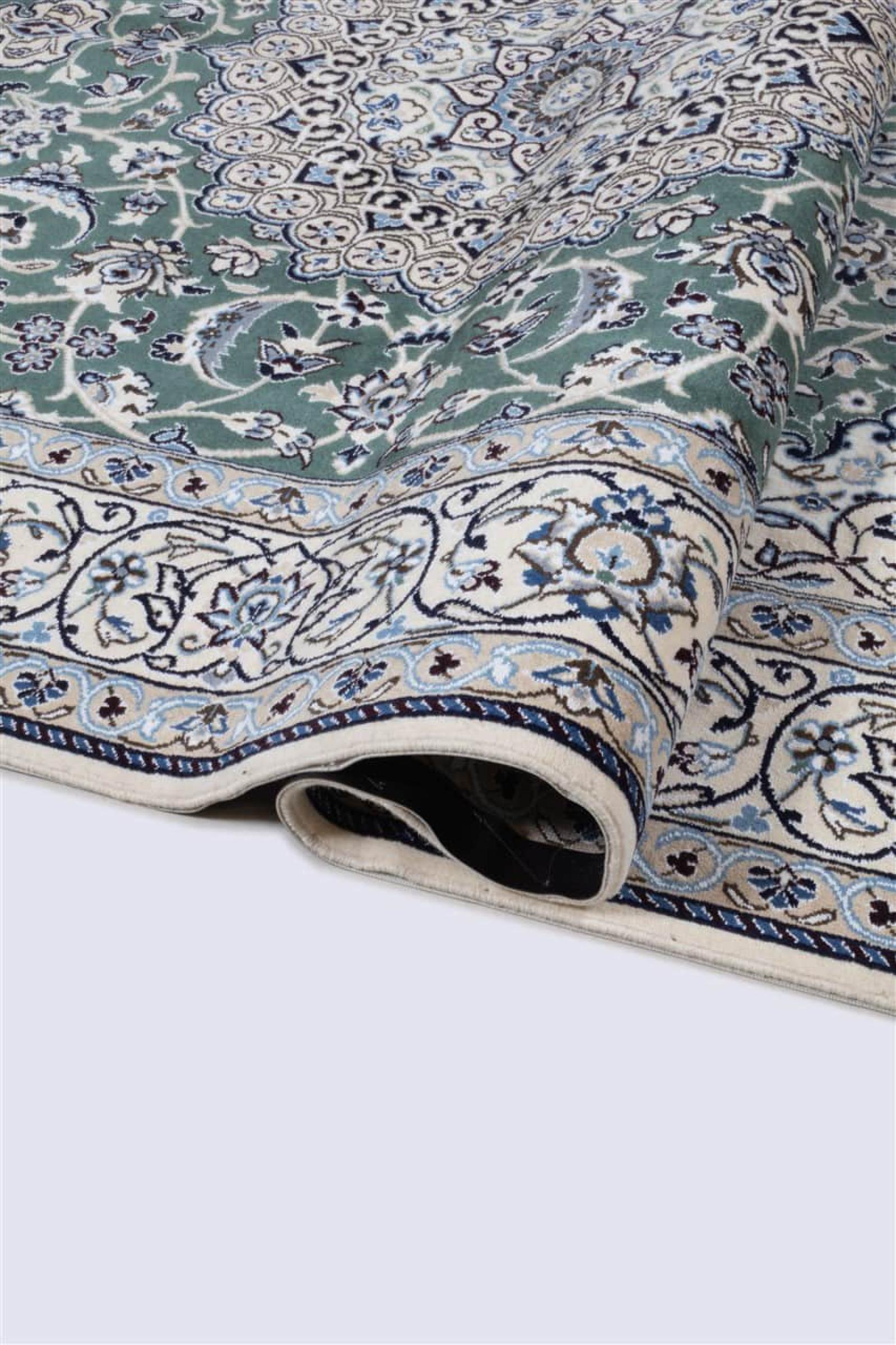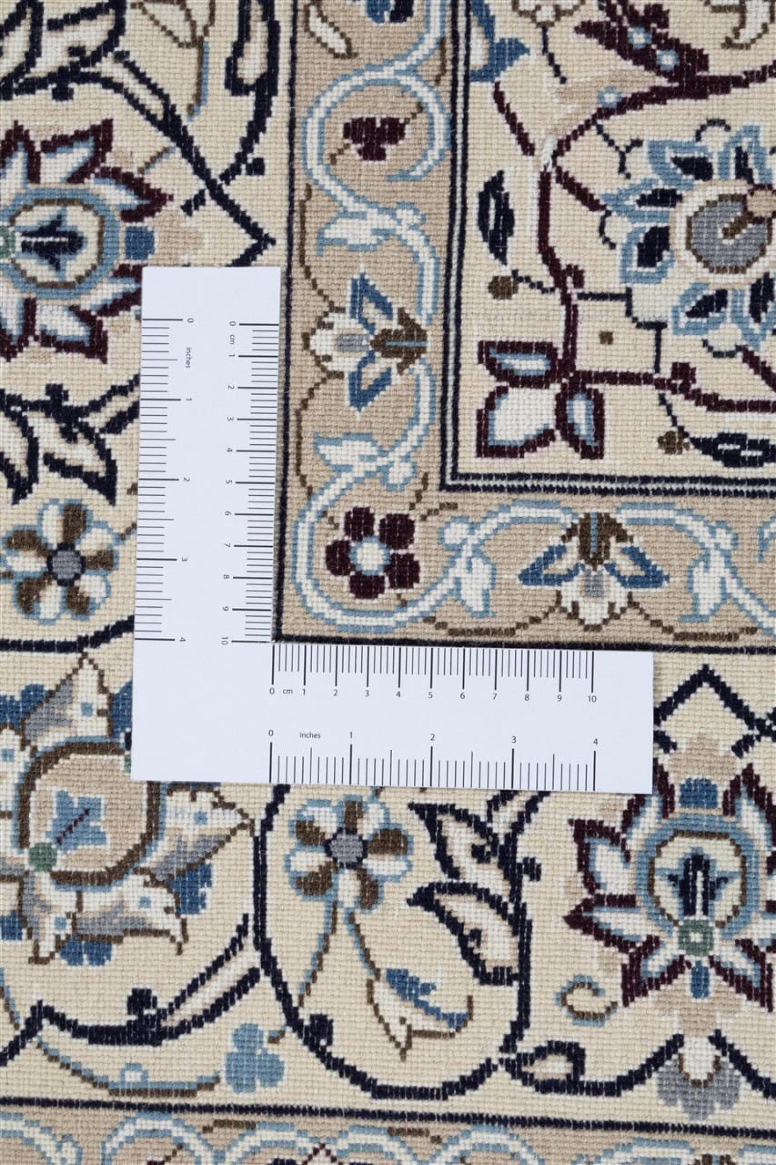 This Nain rug is classified as 9La. The excellent quality, the beautiful oriental design with its curvilinear patterns will delight every buyer. This Persian rug was hand-knotted in the city of Nain, which lies on the western edge of the Dasht-e-Kavir desert, from high-quality wool and natural silk. 9La Nain rugs are significantly finer than a 12La and already show beautiful details.