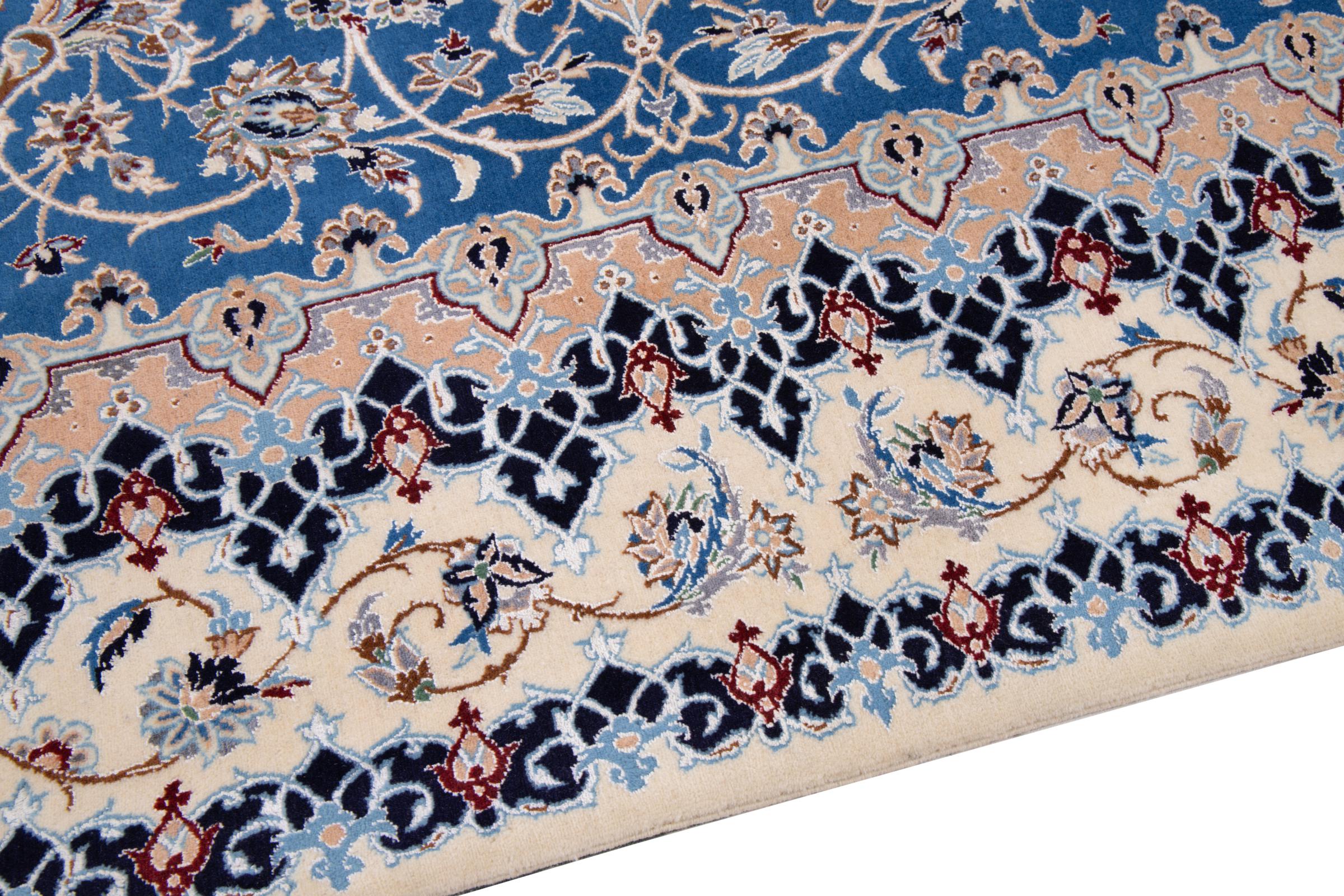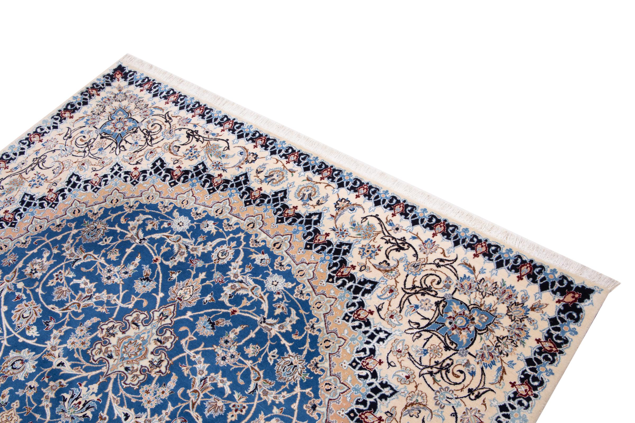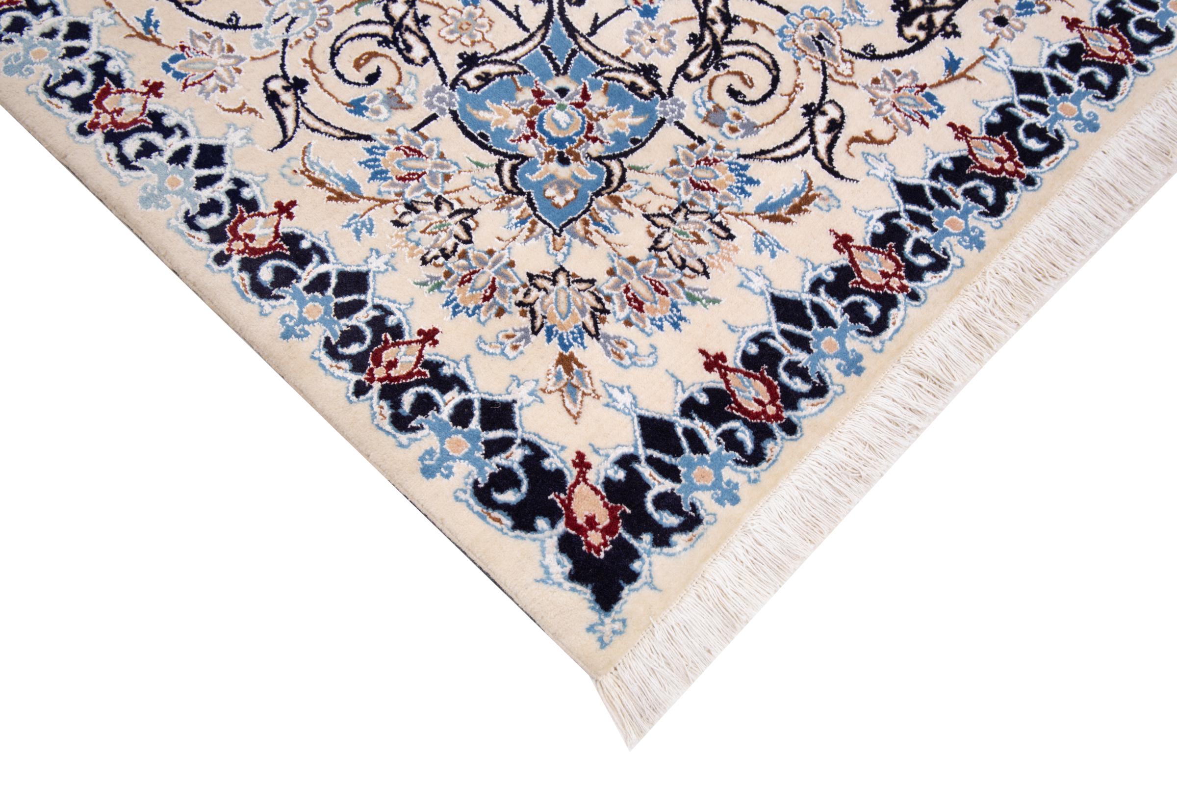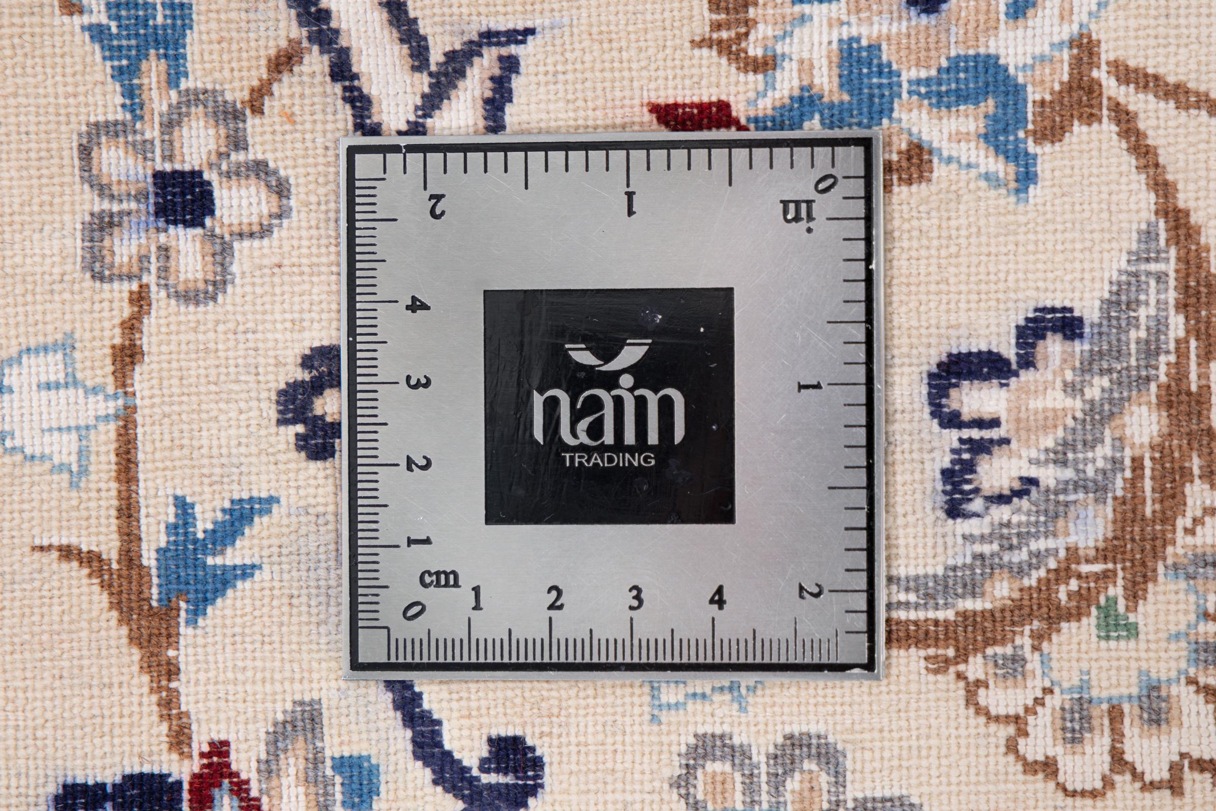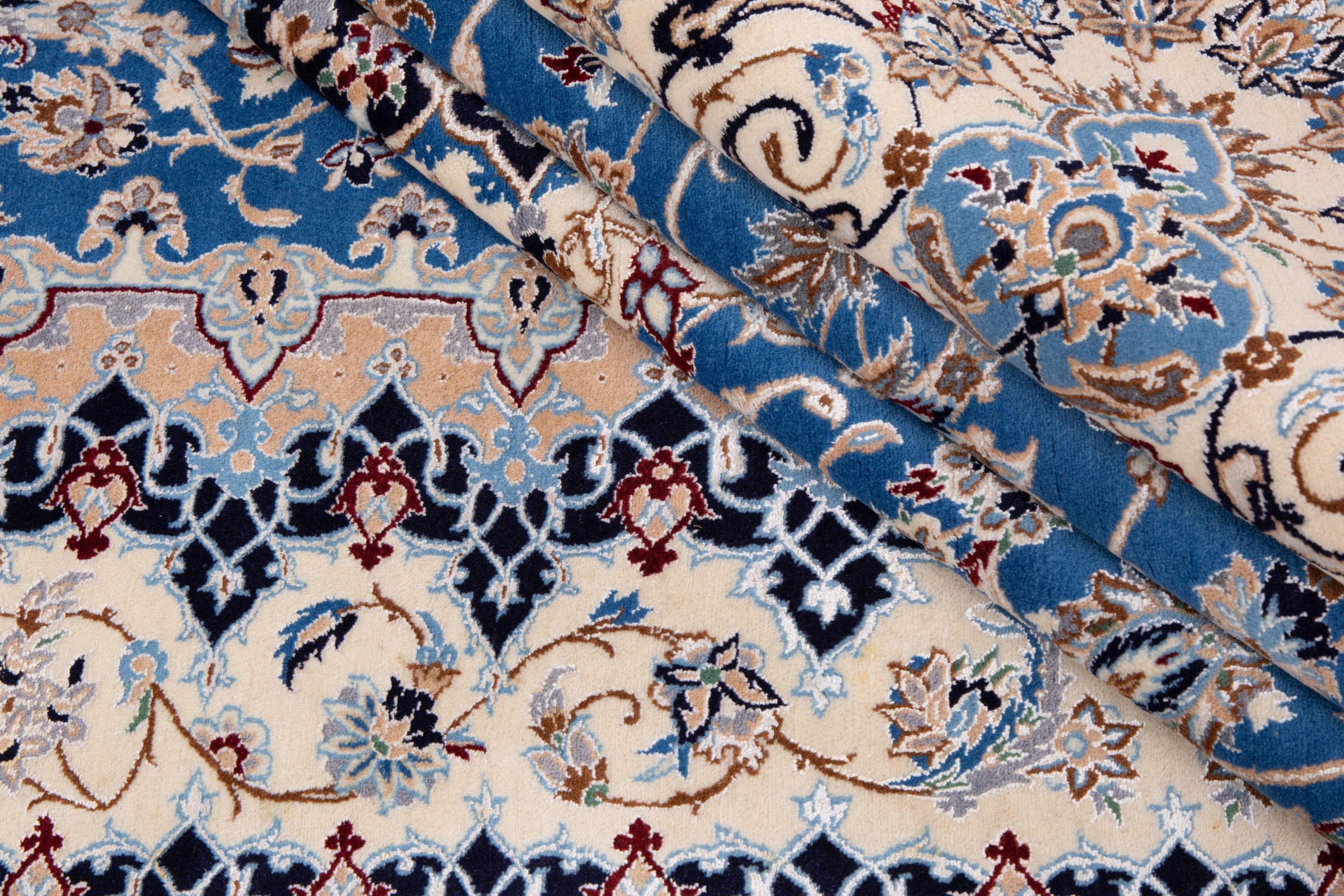 This Nain rug combines quality, tradition and an unmistakable design. It was hand-knotted from high-quality cork wool and natural silk in the desert town of the same name, Nain. Lovers of valuable rugs from Iran will love this Persian rug. With Nain rugs in the 6La and 4La classifications, you have a real work of art with an incredible level of detail that you can really lose yourself in. Nain 4La rugs are almost impossible to find today, as they are extremely elaborate to produce.