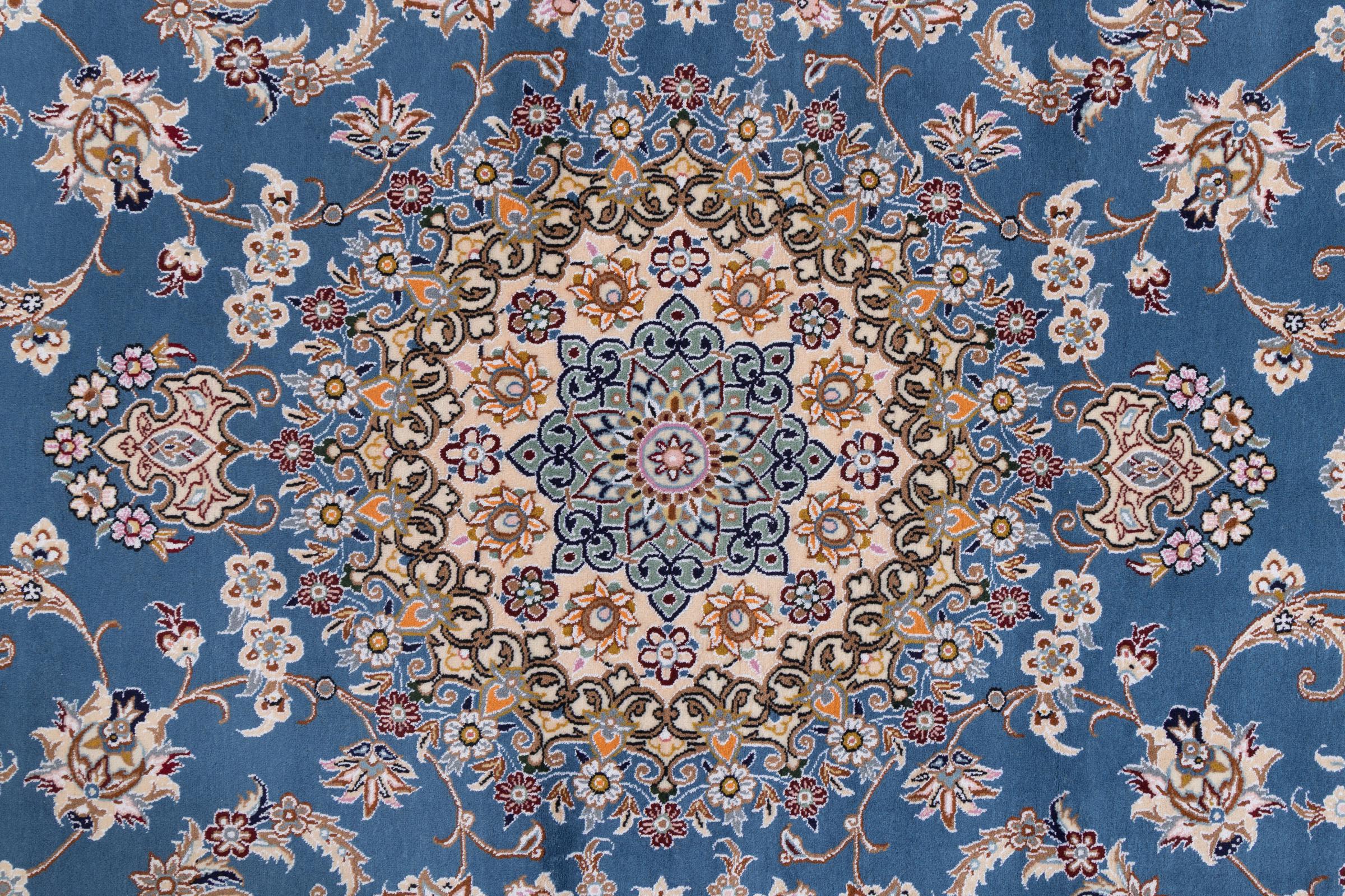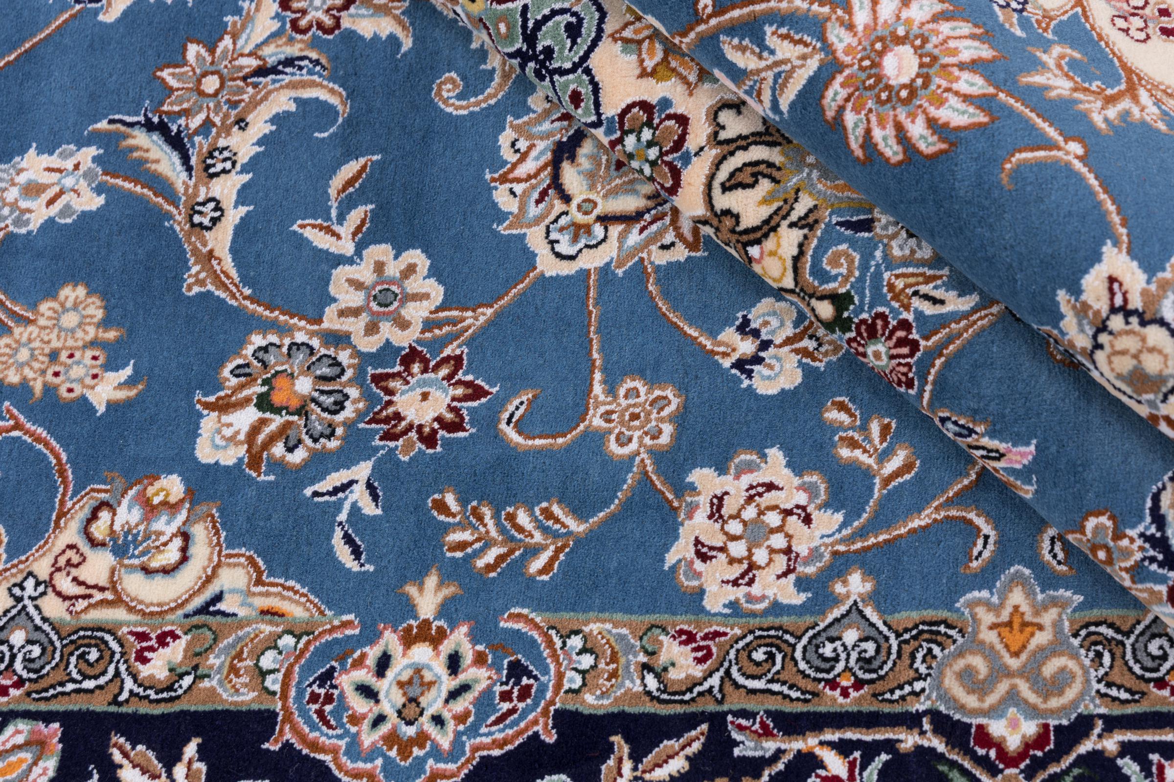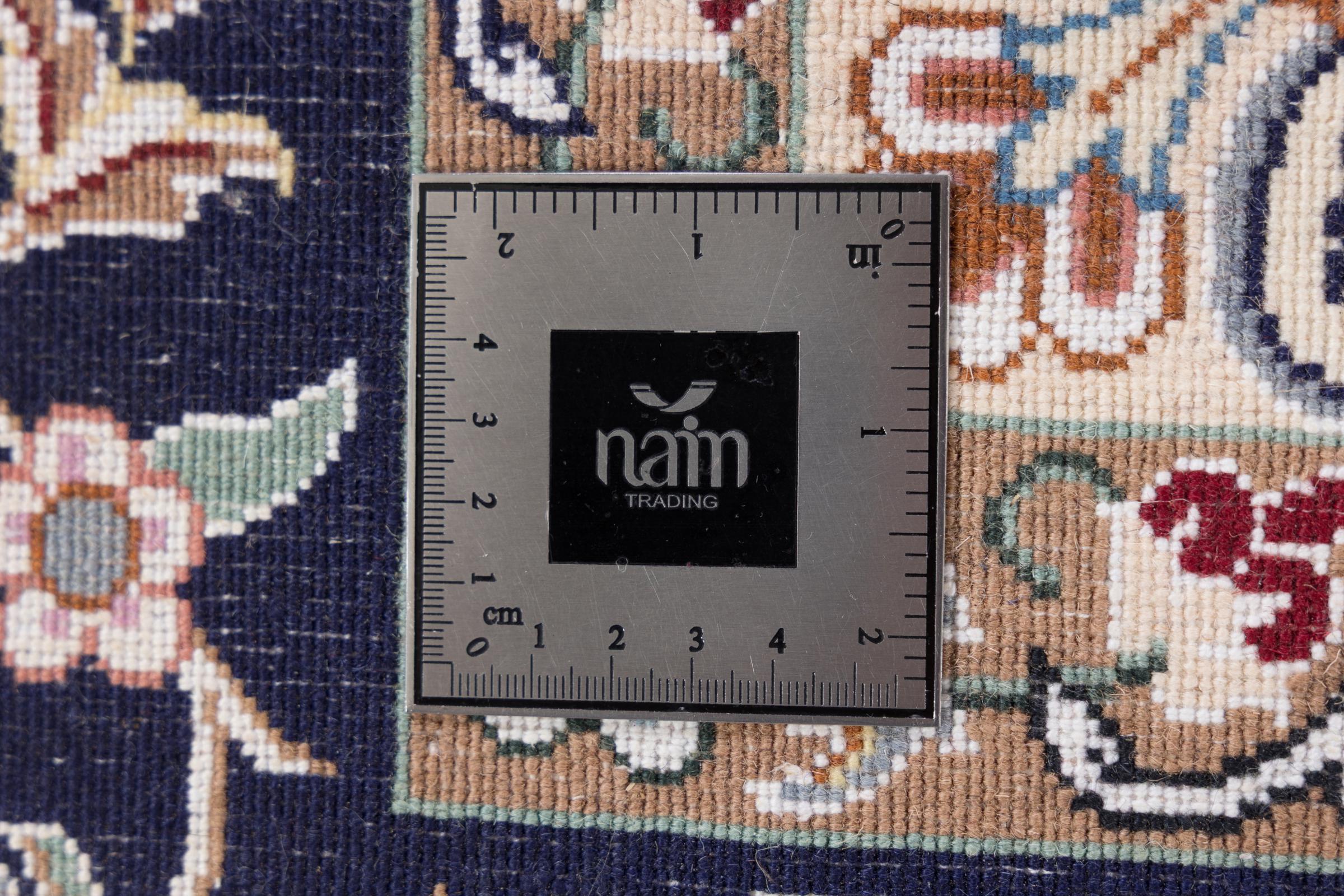 This Nain rug is classified as 9La. The excellent quality, the beautiful oriental design with its curvilinear patterns will delight every buyer. This Persian rug was hand-knotted in the city of Nain, which lies on the western edge of the Dasht-e-Kavir desert, from high-quality wool and natural silk. 9La Nain rugs are significantly finer than a 12La and already show beautiful details.