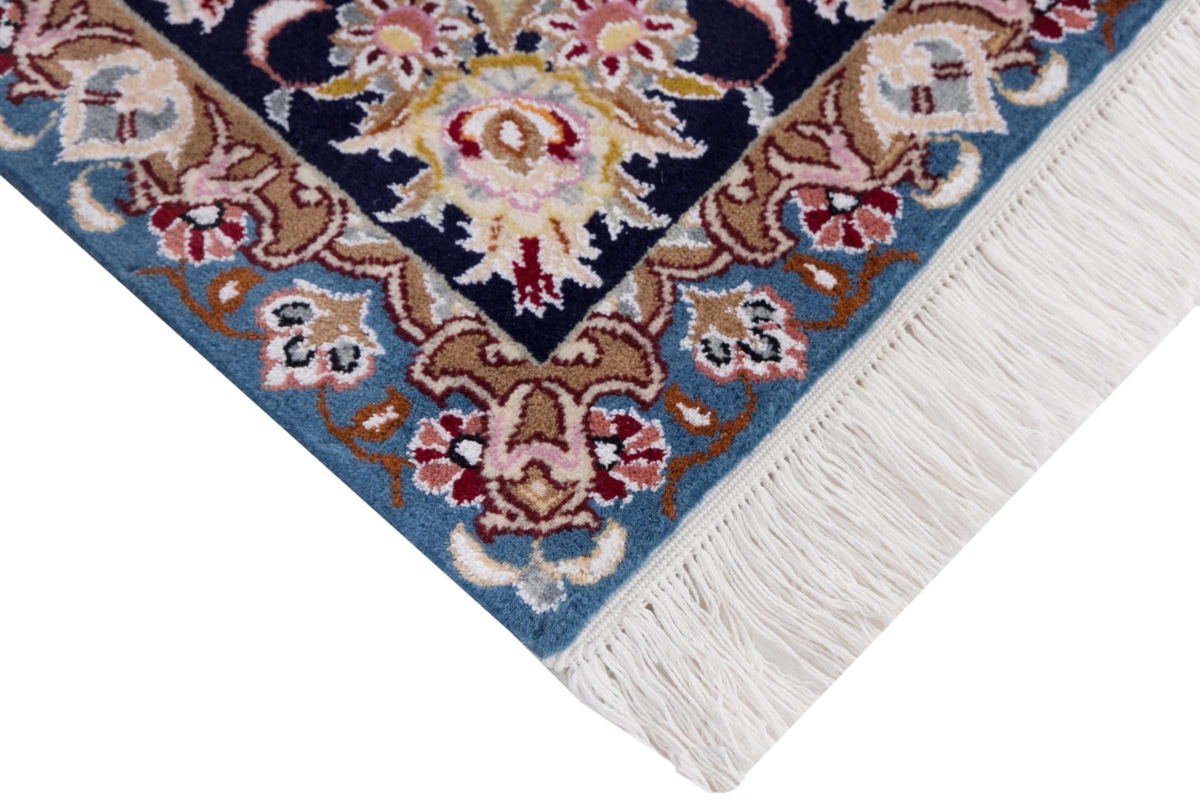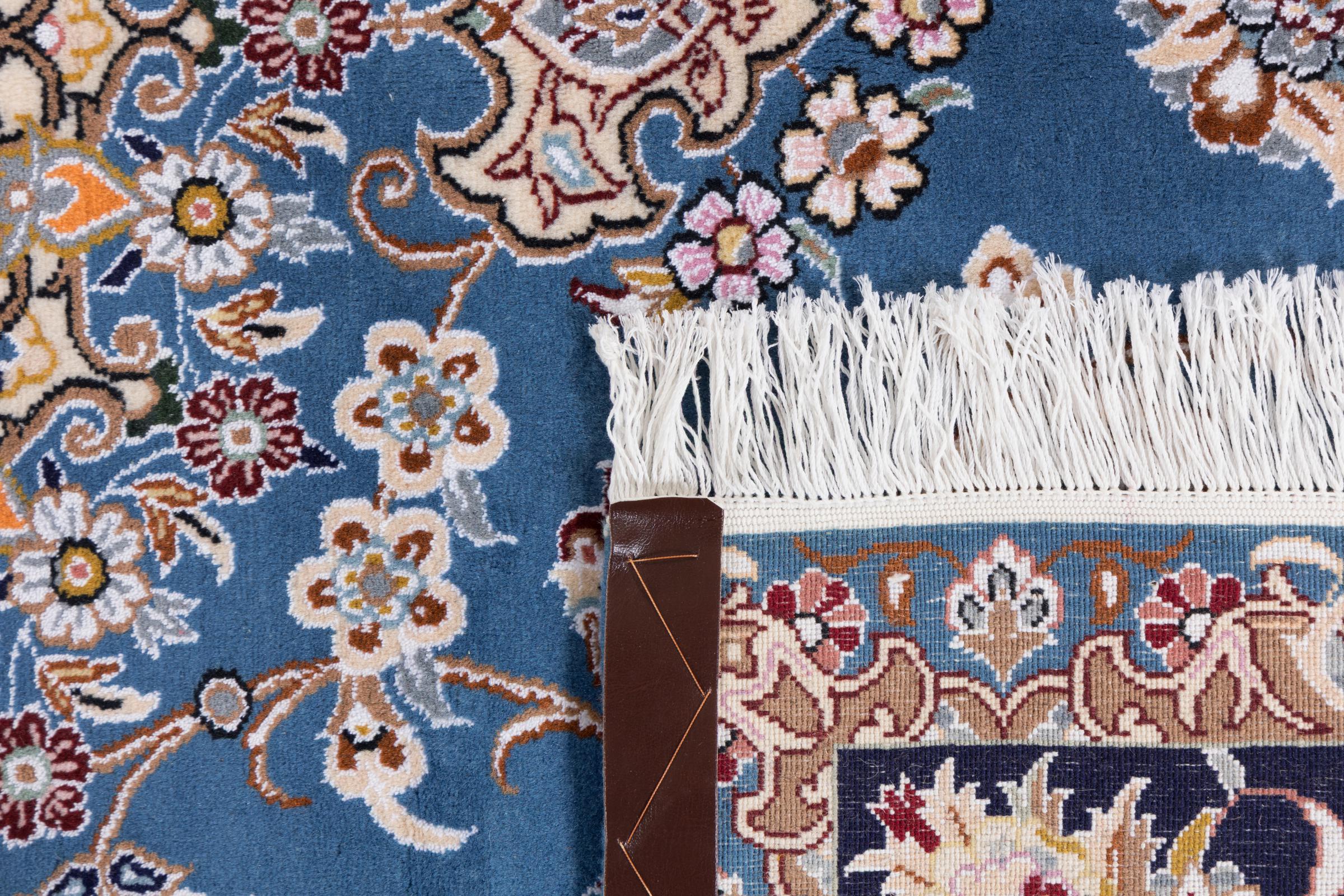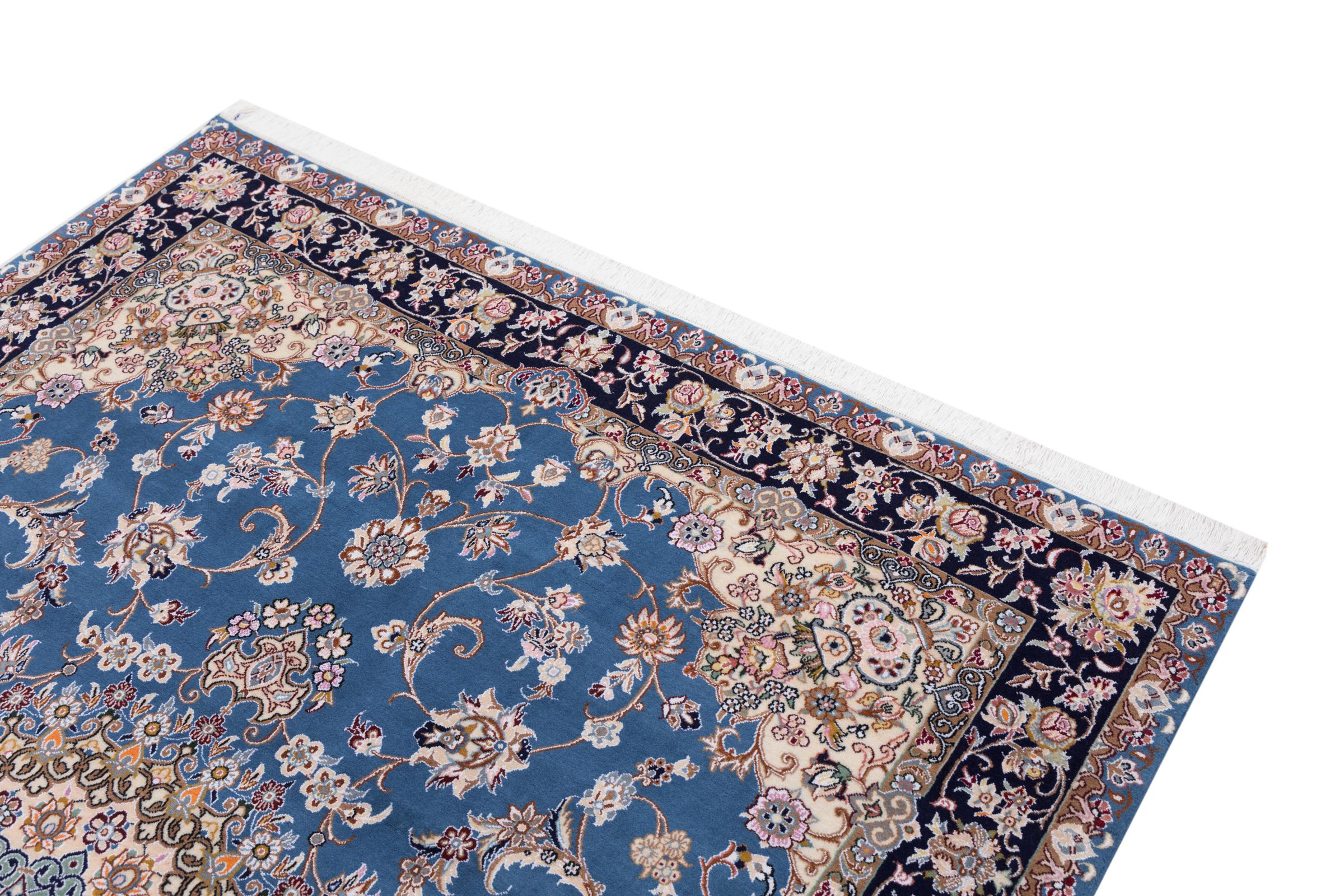 This Nain rug is classified as 9La. The excellent quality, the beautiful oriental design with its curvilinear patterns will delight every buyer. This Persian rug was hand-knotted in the city of Nain, which lies on the western edge of the Dasht-e-Kavir desert, from high-quality wool and natural silk. 9La Nain rugs are significantly finer than a 12La and already show beautiful details.