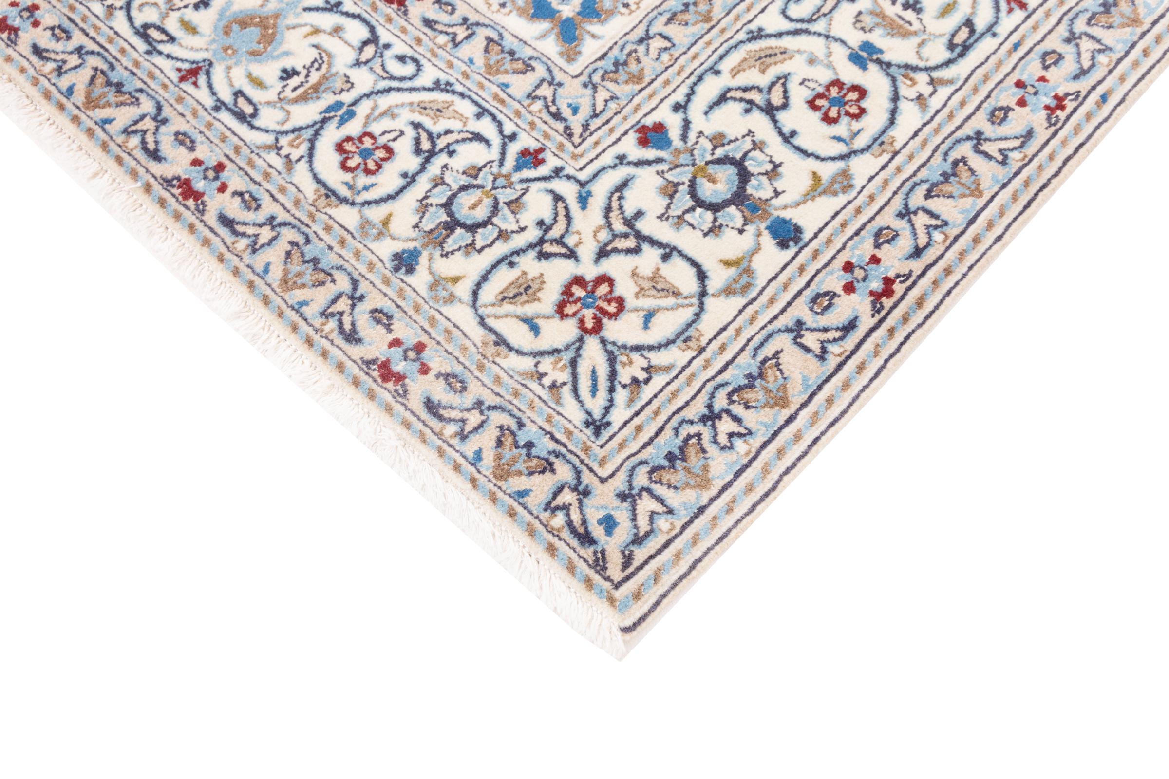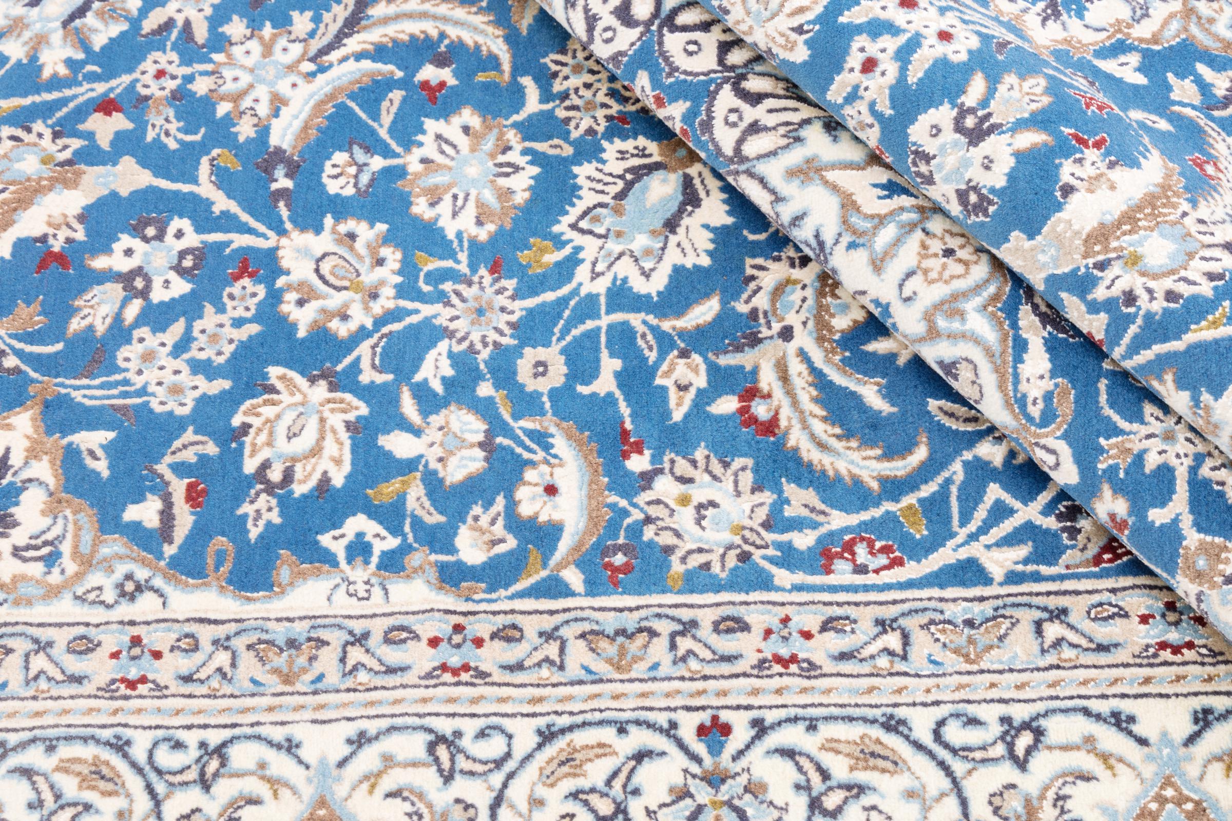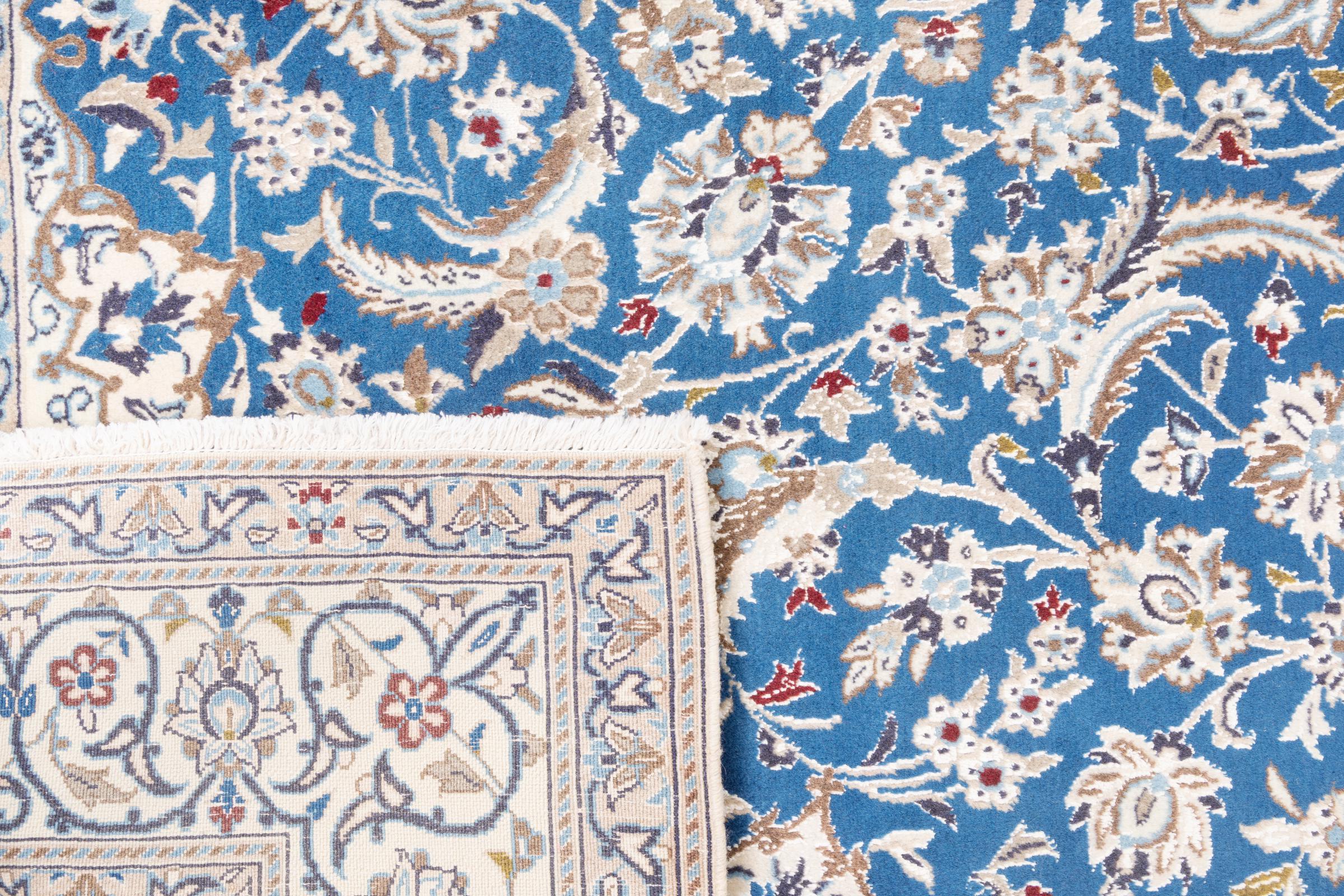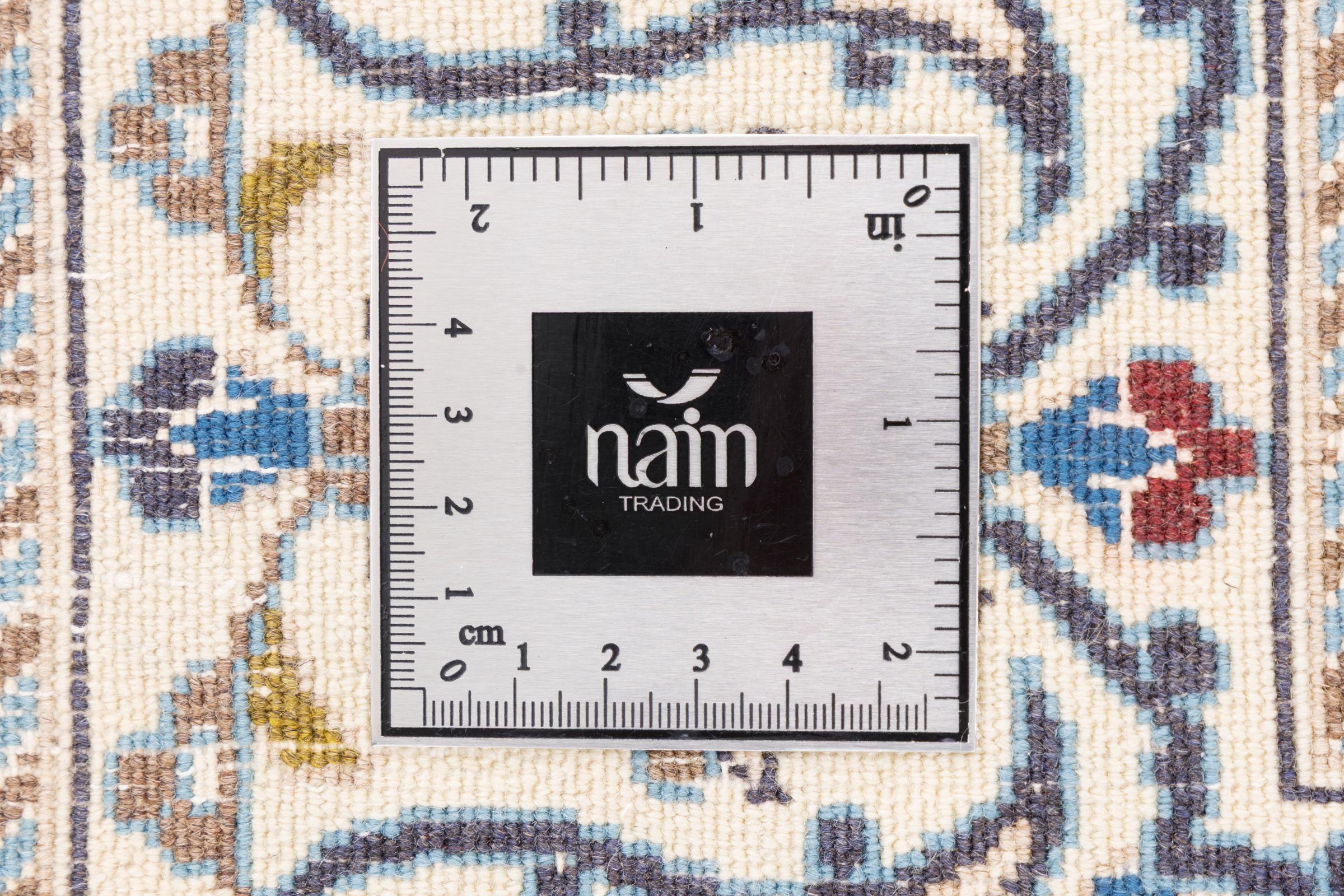 This Nain rug is classified as 9La. The excellent quality, the beautiful oriental design with its curvilinear patterns will delight every buyer. This Persian rug was hand-knotted in the city of Nain, which lies on the western edge of the Dasht-e-Kavir desert, from high-quality wool and natural silk. 9La Nain rugs are significantly finer than a 12La and already show beautiful details.