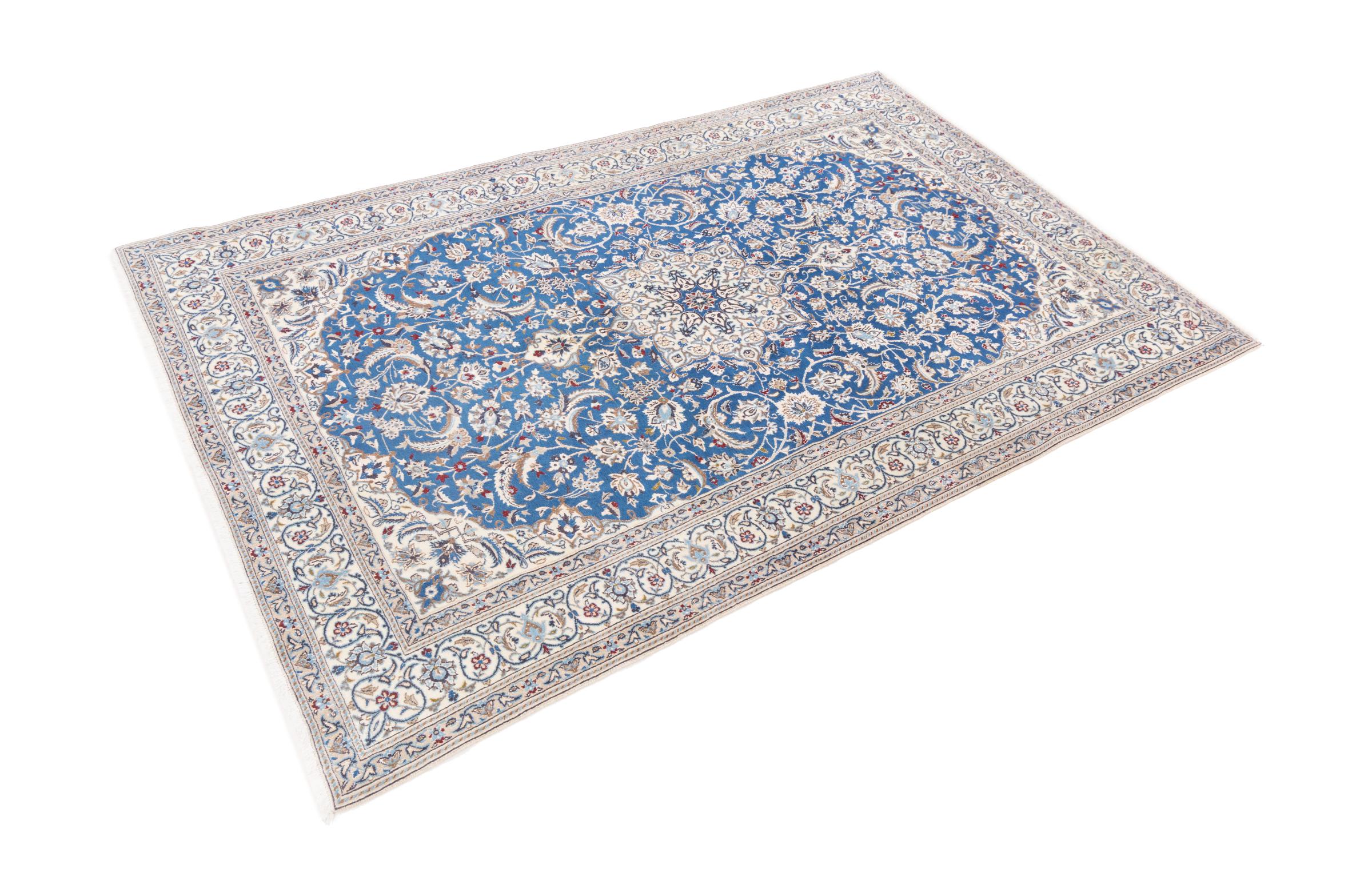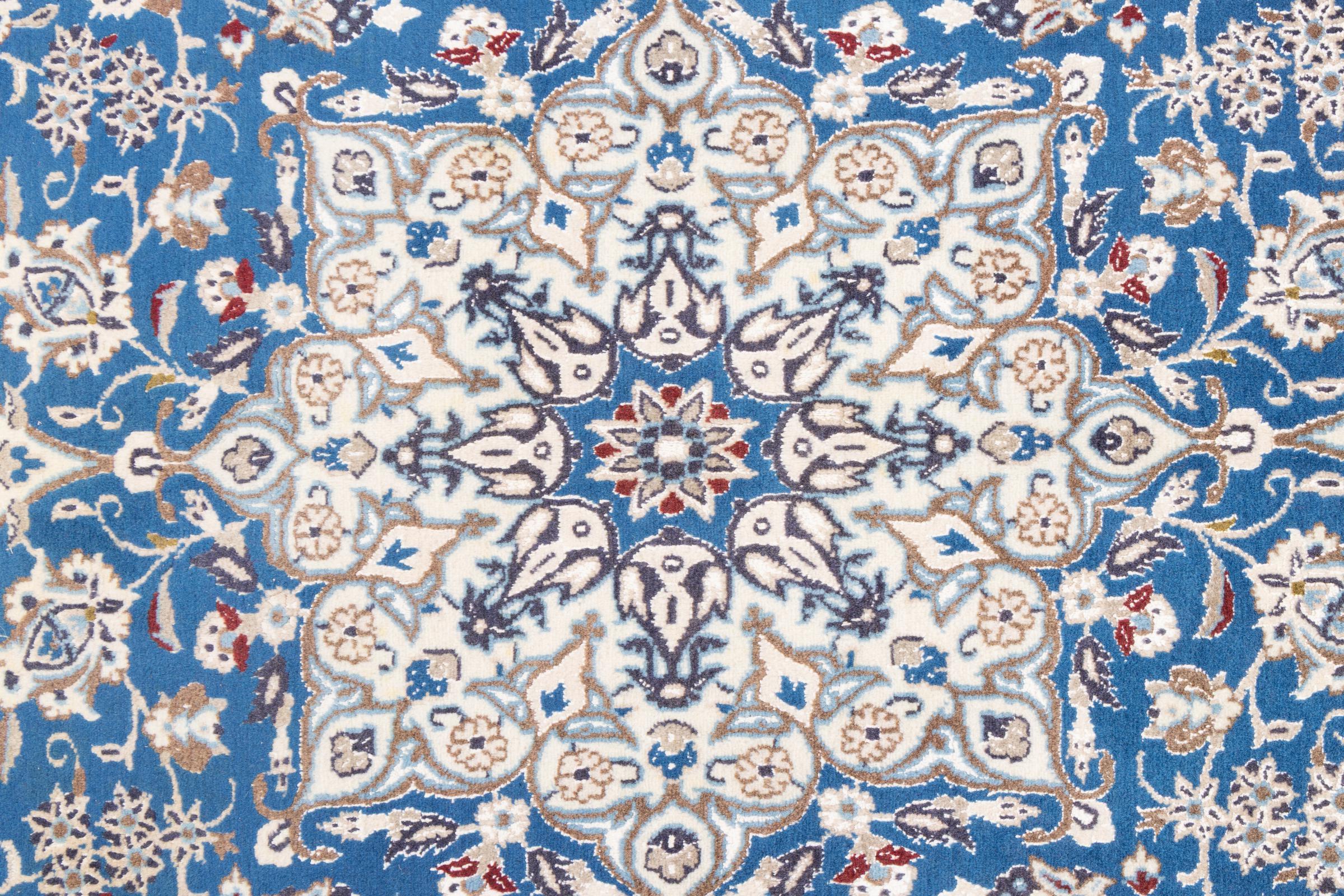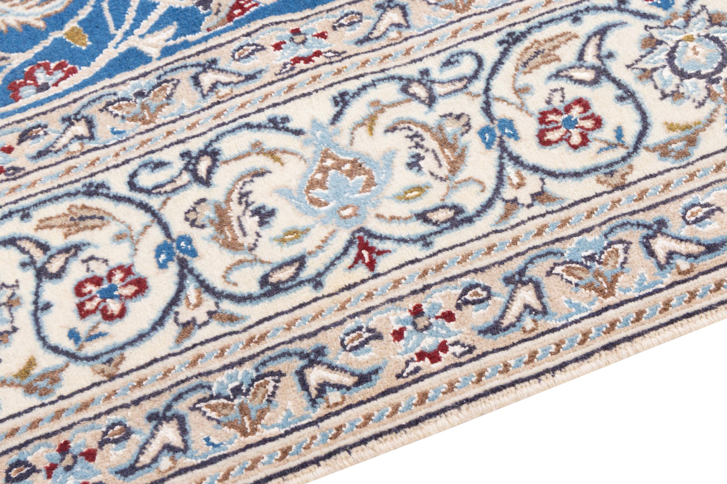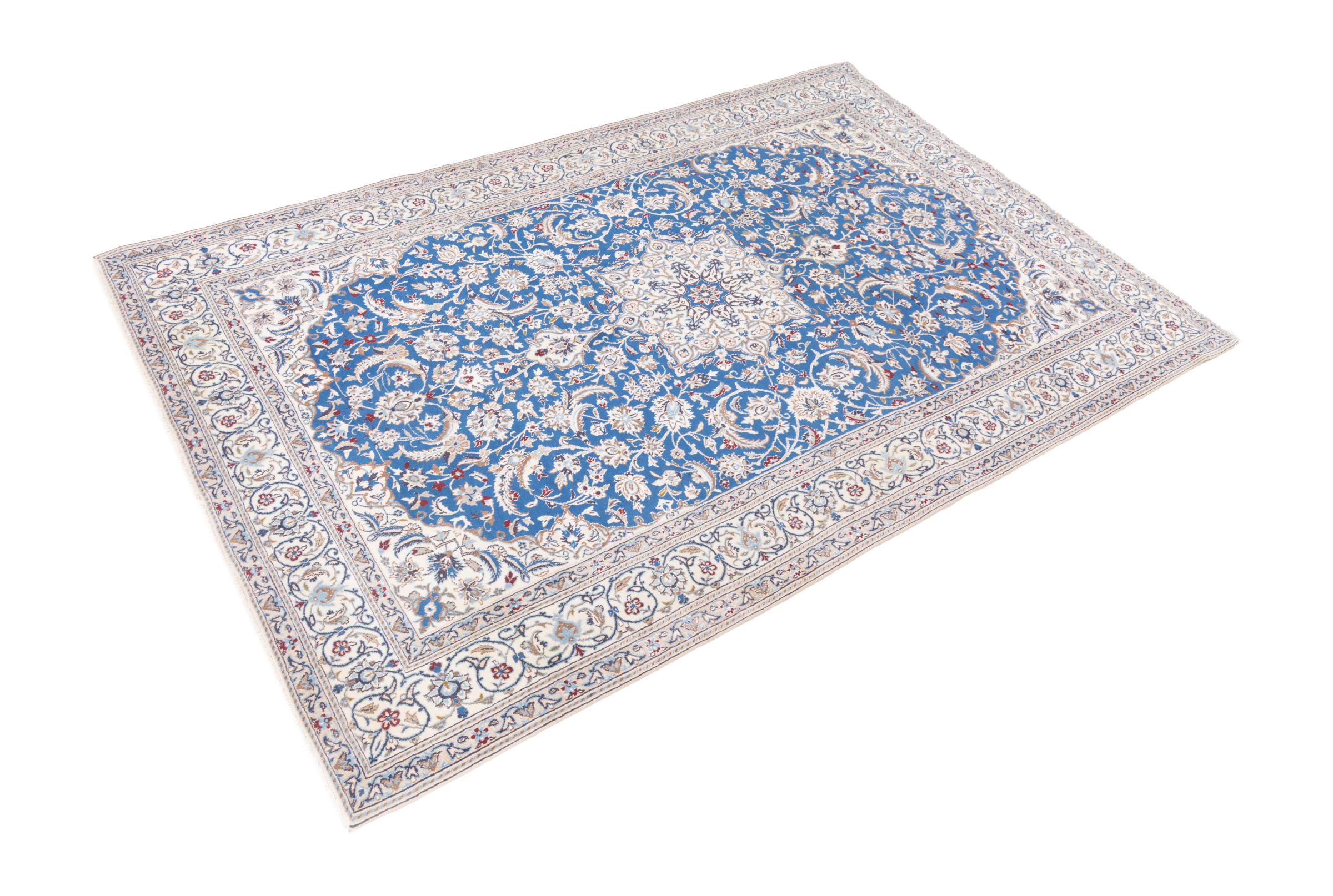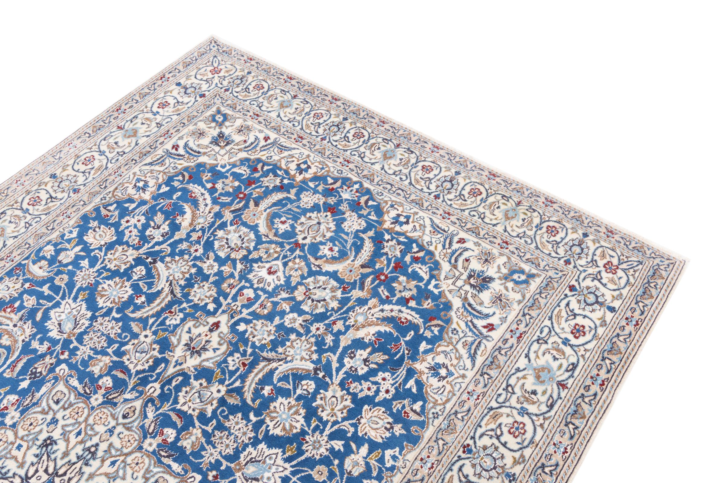 This Nain rug is classified as 9La. The excellent quality, the beautiful oriental design with its curvilinear patterns will delight every buyer. This Persian rug was hand-knotted in the city of Nain, which lies on the western edge of the Dasht-e-Kavir desert, from high-quality wool and natural silk. 9La Nain rugs are significantly finer than a 12La and already show beautiful details.
