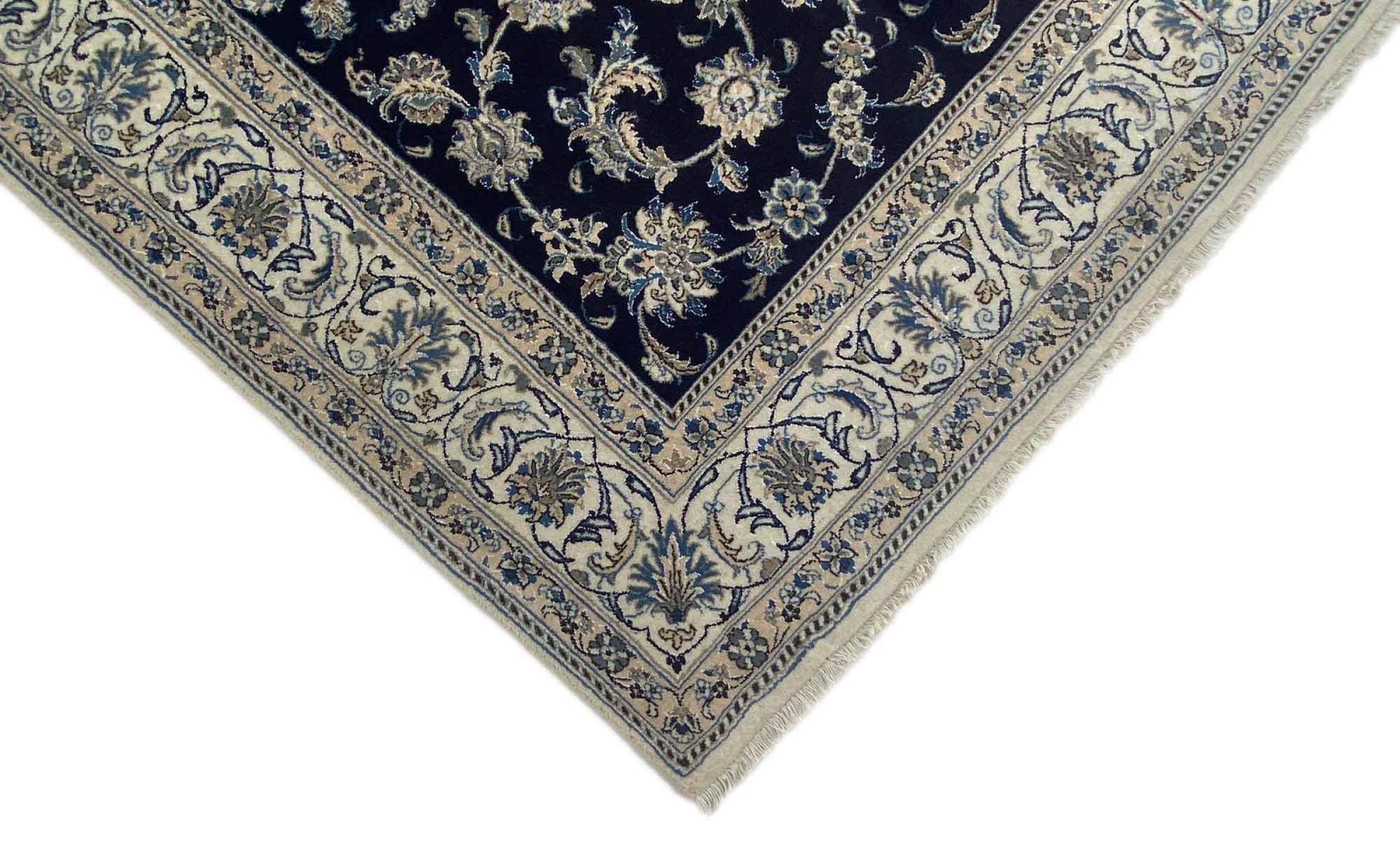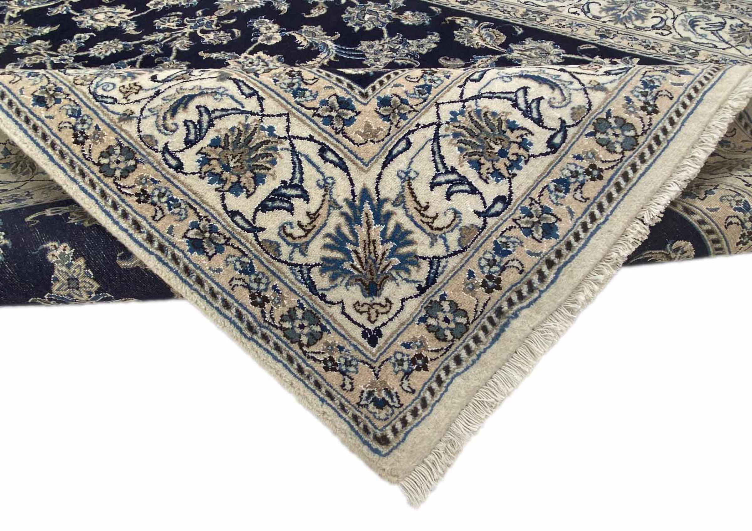 This Nain rug is classified as 12La. Its typical Nain colour scheme gives it an elegant and sophisticated look. This Persian rug was hand-knotted in the city of Nain, which lies on the western edge of the Dasht-e-Kavir desert, using high-quality wool and natural silk. At 12La, it is not as finely detailed with ornamentation as a Nain 9La or 6La.