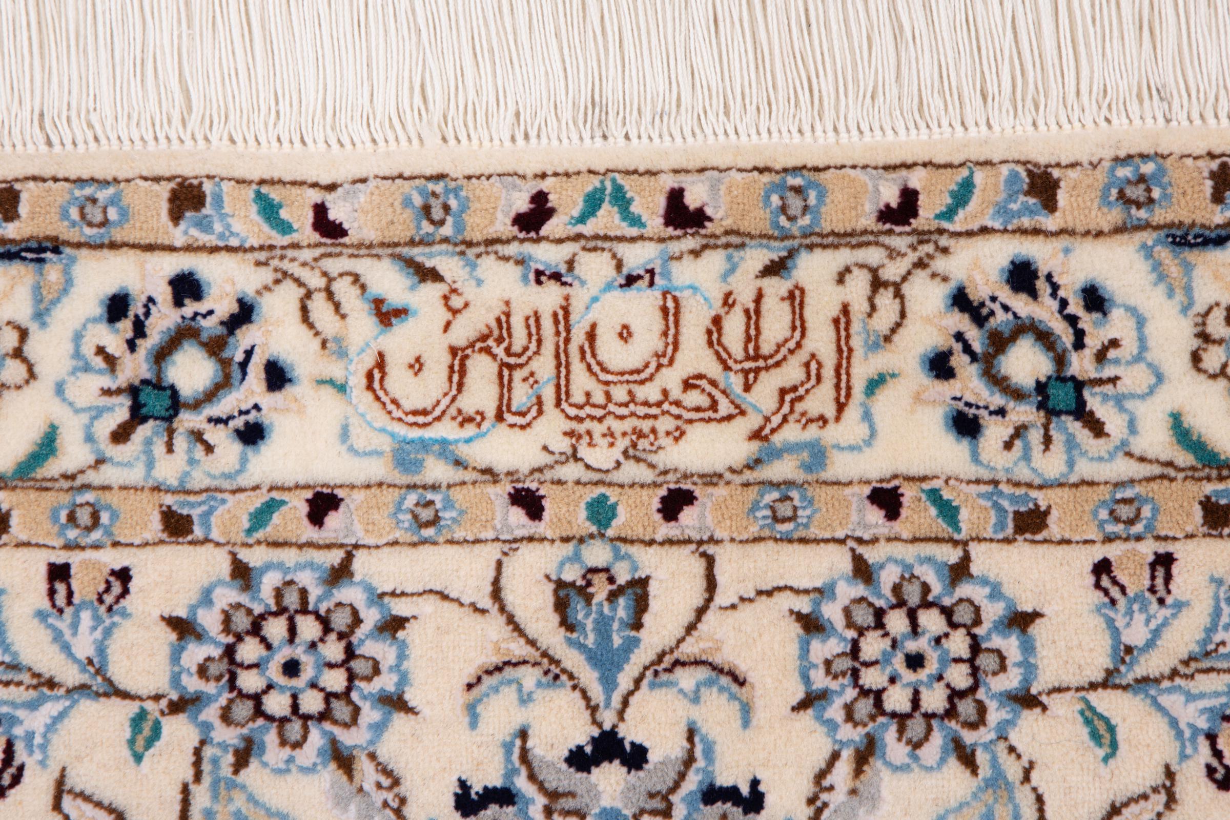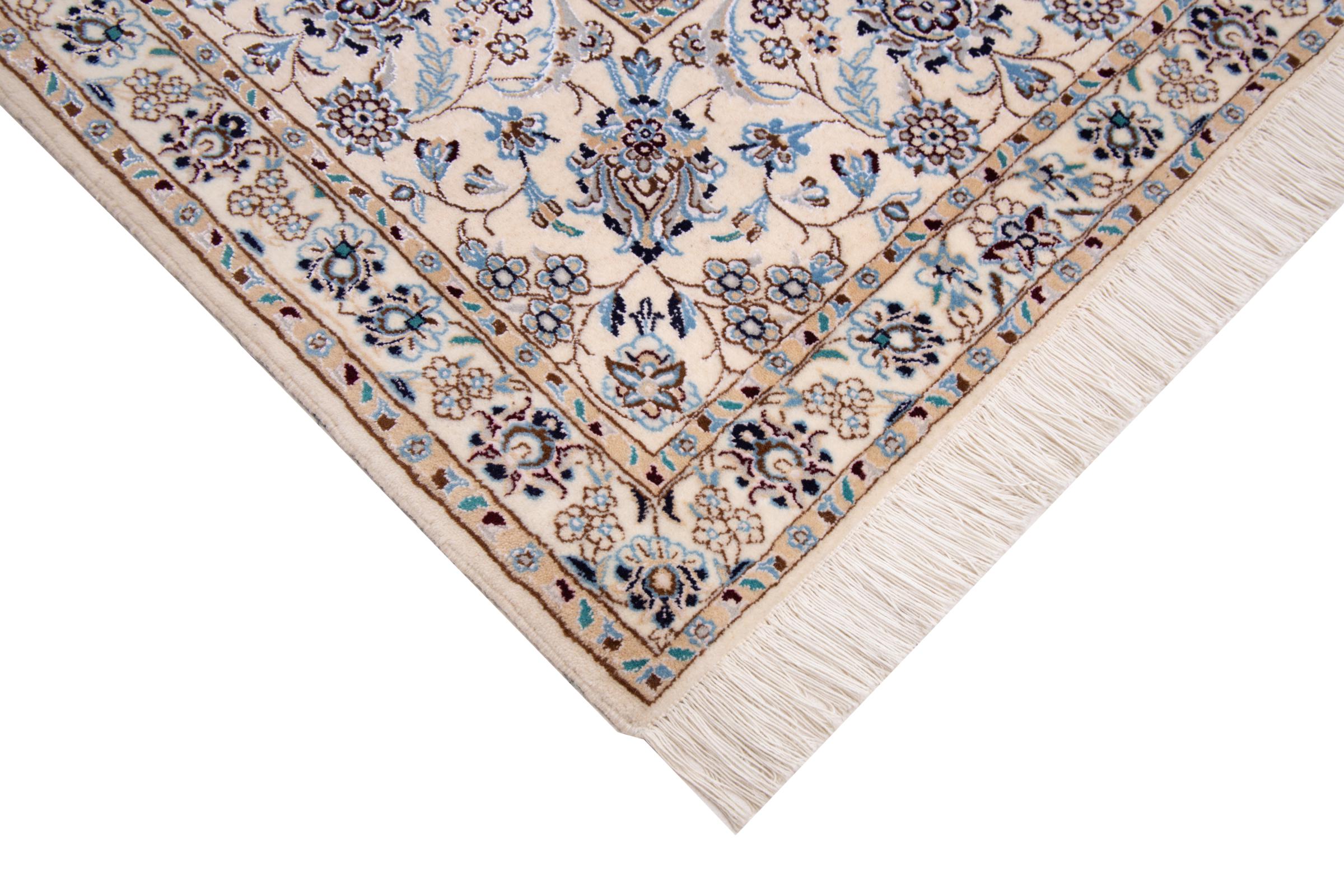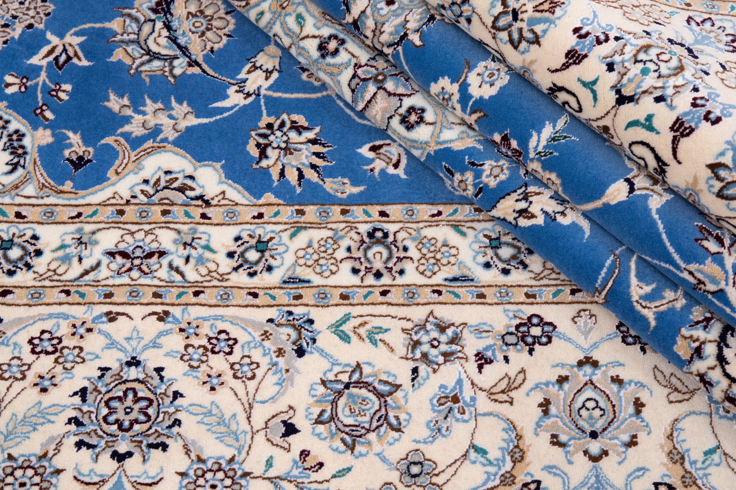 This Nain rug combines quality, tradition and an unmistakable design. It was hand-knotted from high-quality cork wool and natural silk in the desert town of the same name, Nain. Lovers of valuable rugs from Iran will love this Persian rug. With Nain rugs in the 6La and 4La classifications, you have a real work of art with an incredible level of detail that you can really lose yourself in. Nain 4La rugs are almost impossible to find today, as they are extremely elaborate to produce.
