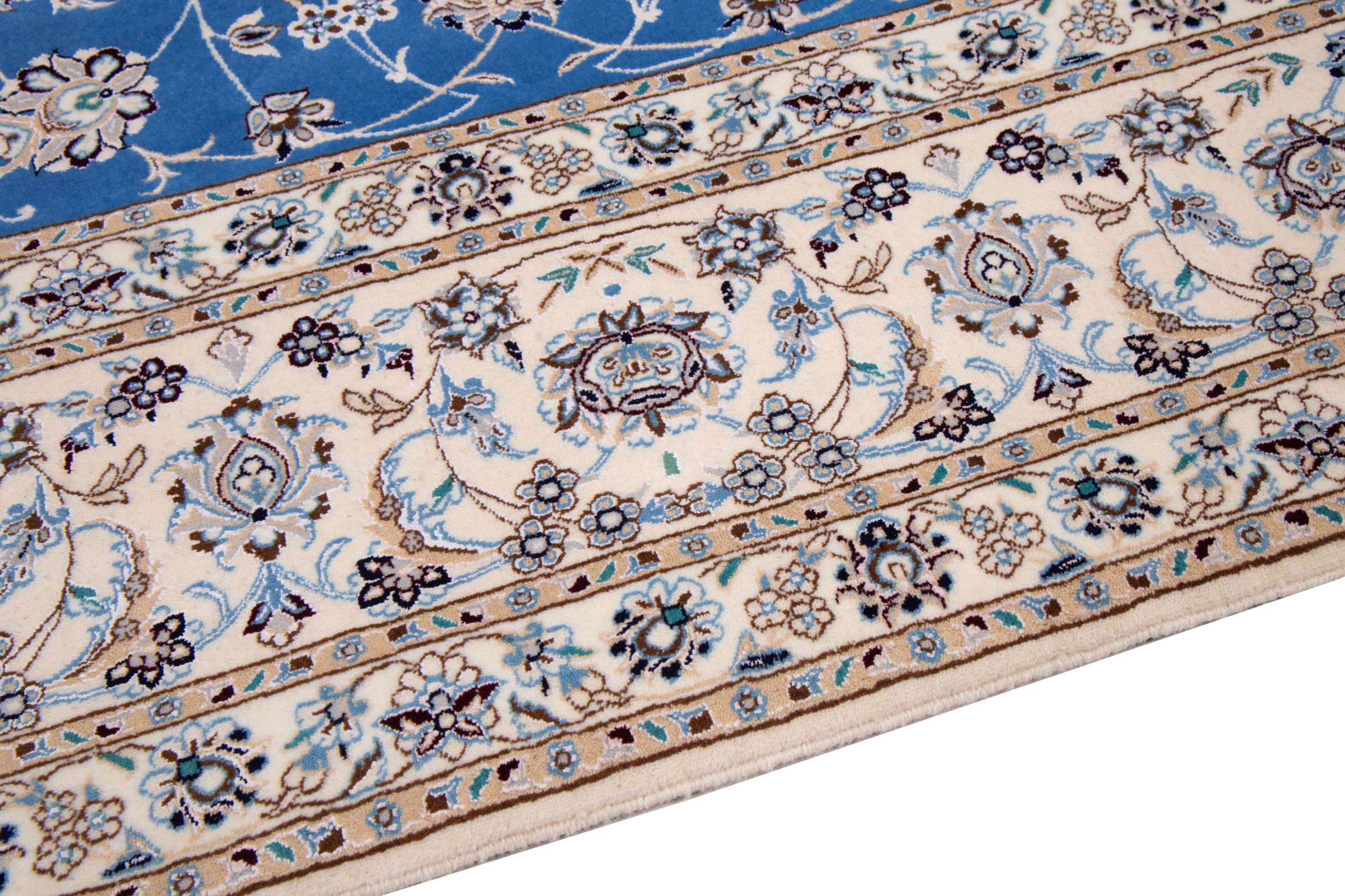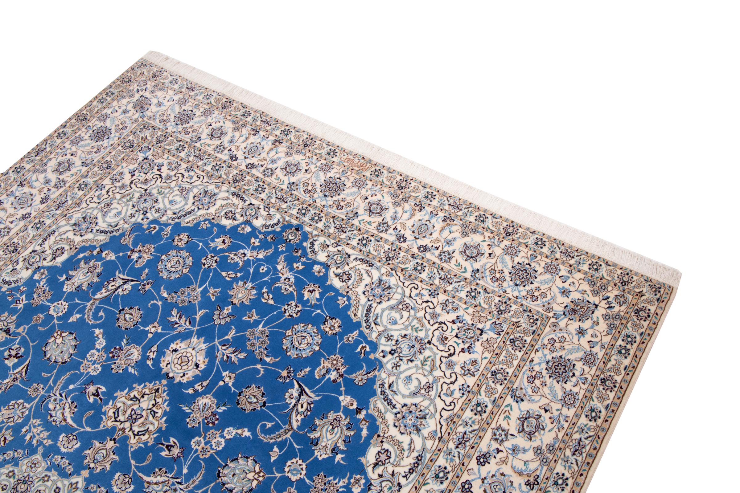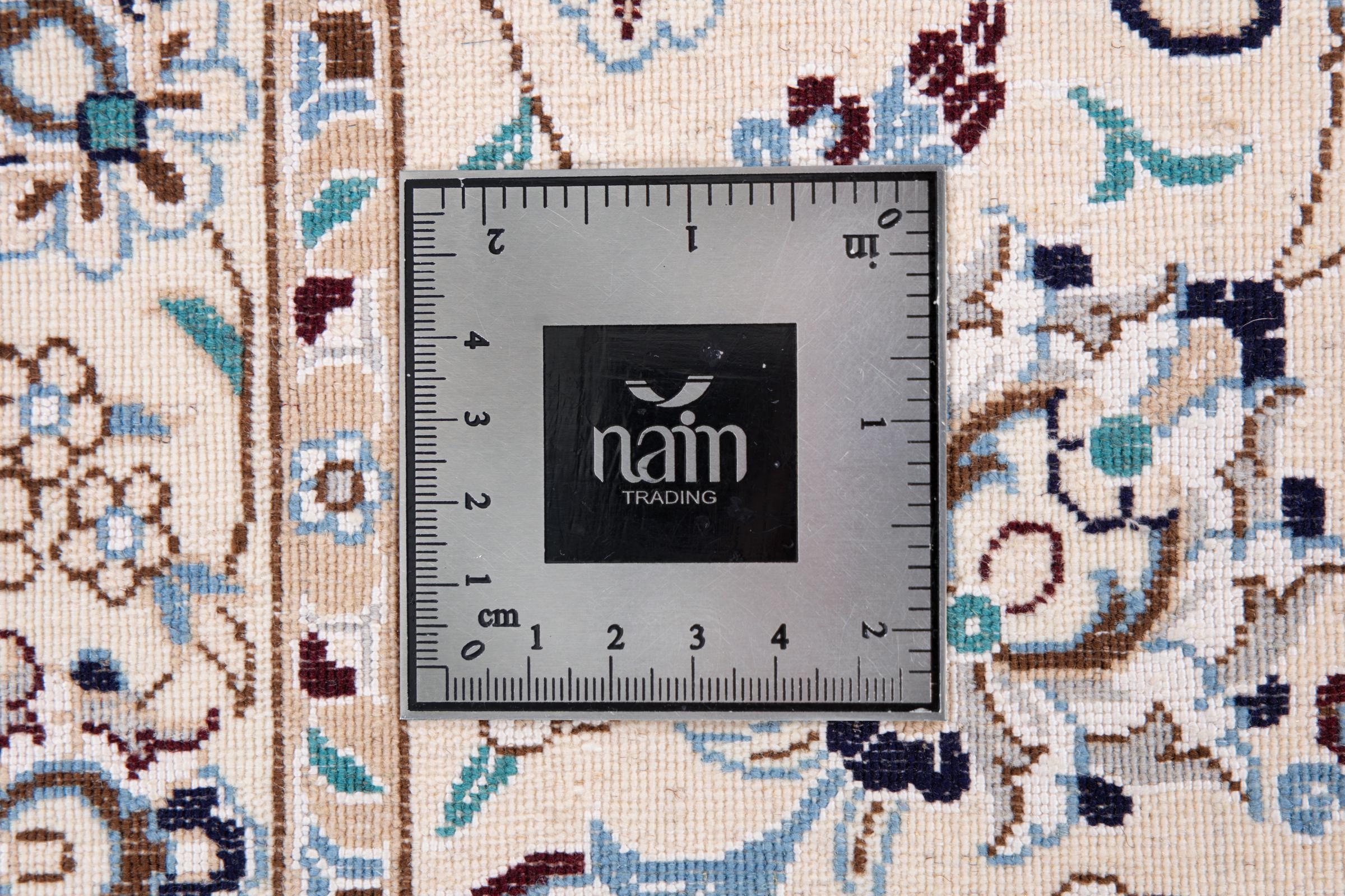 This Nain rug combines quality, tradition and an unmistakable design. It was hand-knotted from high-quality cork wool and natural silk in the desert town of the same name, Nain. Lovers of valuable rugs from Iran will love this Persian rug. With Nain rugs in the 6La and 4La classifications, you have a real work of art with an incredible level of detail that you can really lose yourself in. Nain 4La rugs are almost impossible to find today, as they are extremely elaborate to produce.