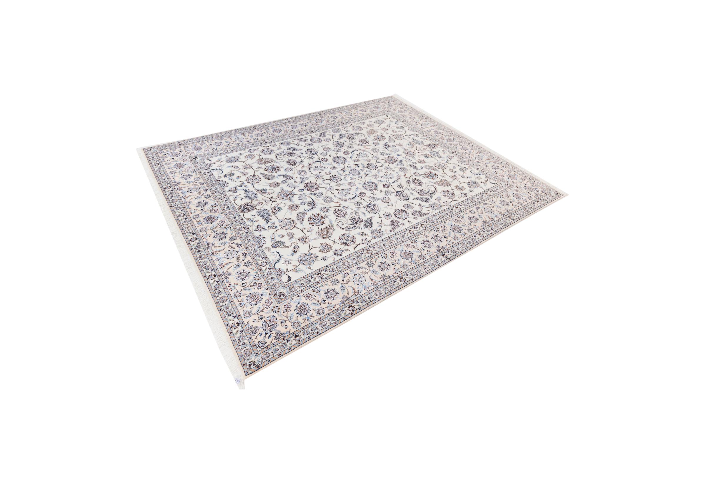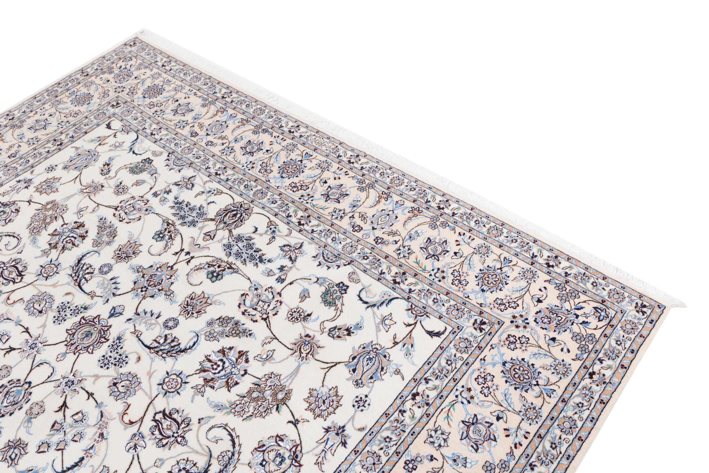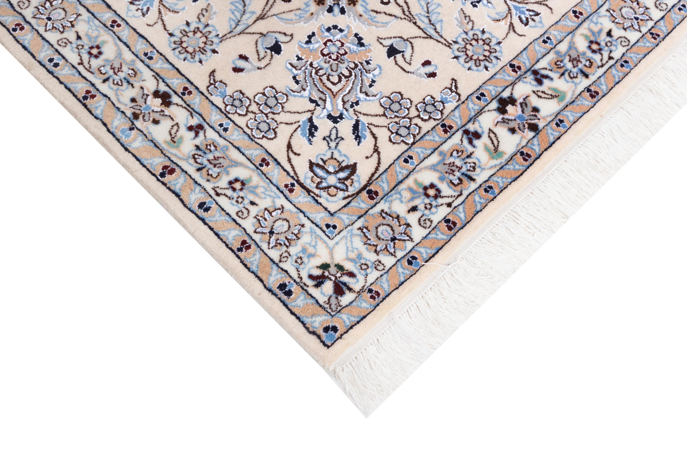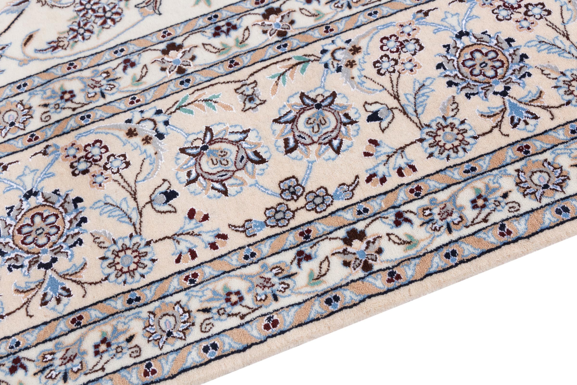 This Nain rug combines quality, tradition and an unmistakable design. It was hand-knotted from high-quality cork wool and natural silk in the desert town of the same name, Nain. Lovers of valuable rugs from Iran will love this Persian rug. With Nain rugs in the 6La and 4La classifications, you have a real work of art with an incredible level of detail that you can really lose yourself in. Nain 4La rugs are almost impossible to find today, as they are extremely elaborate to produce.