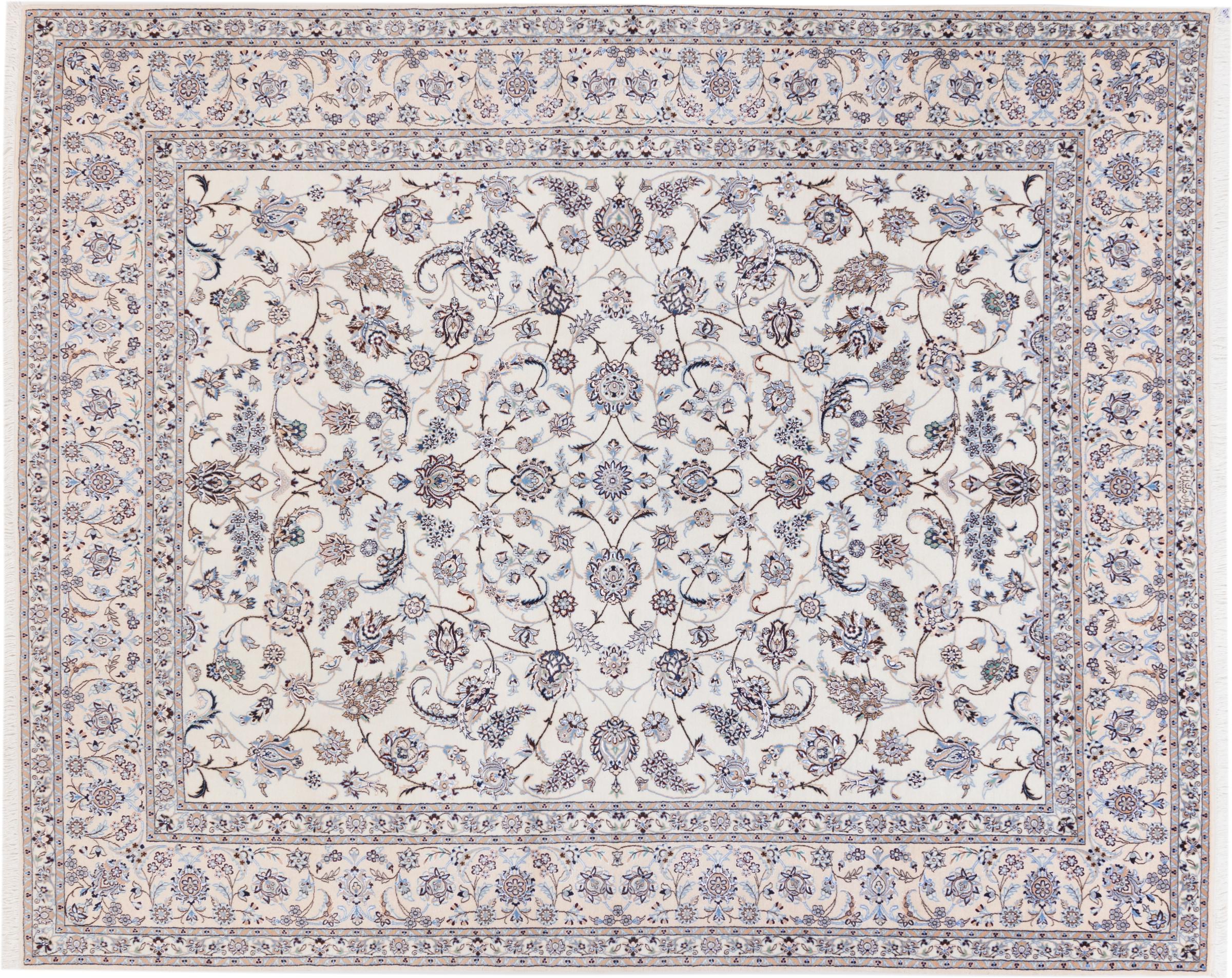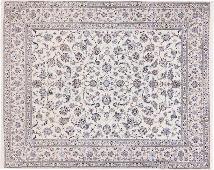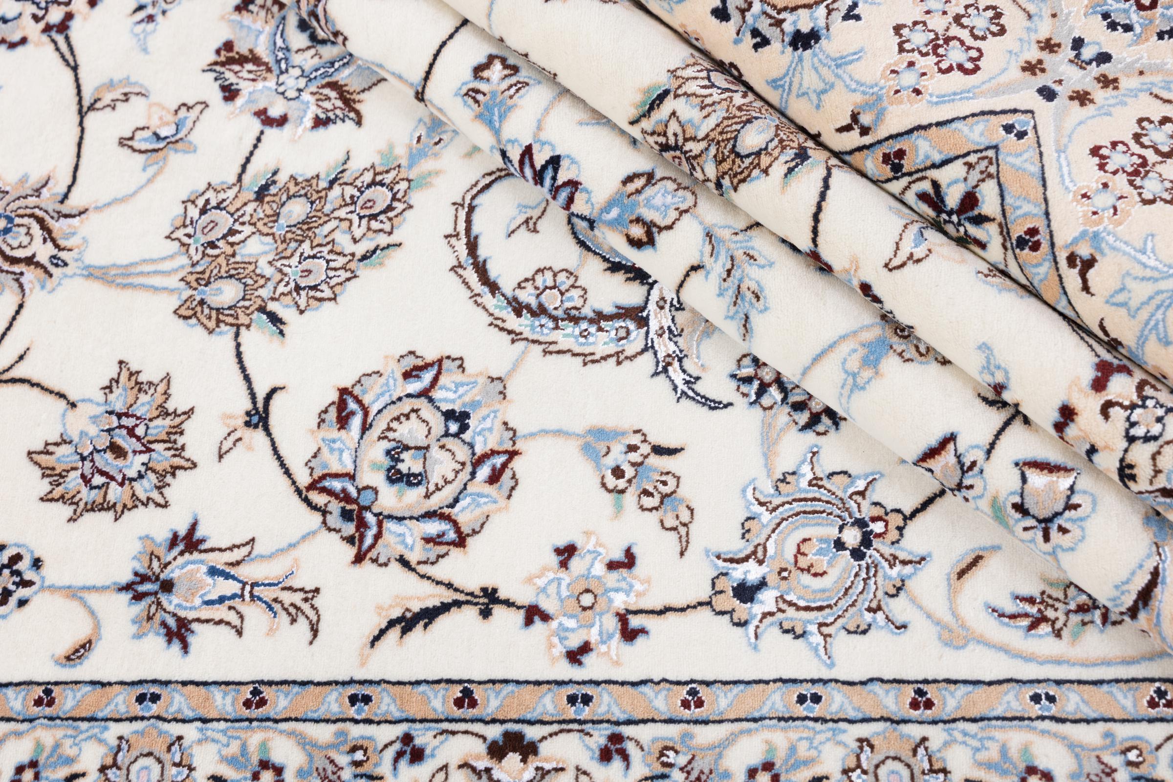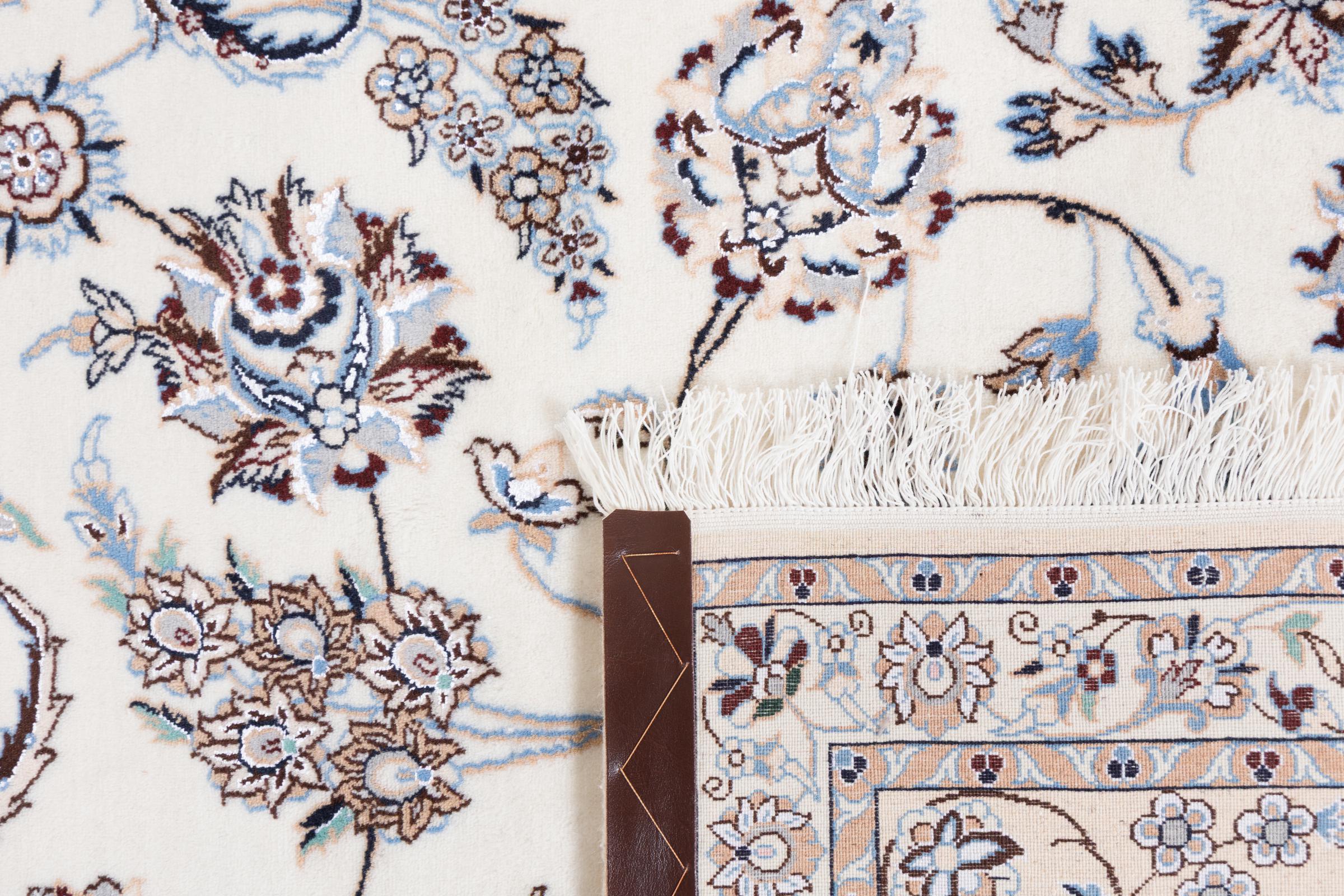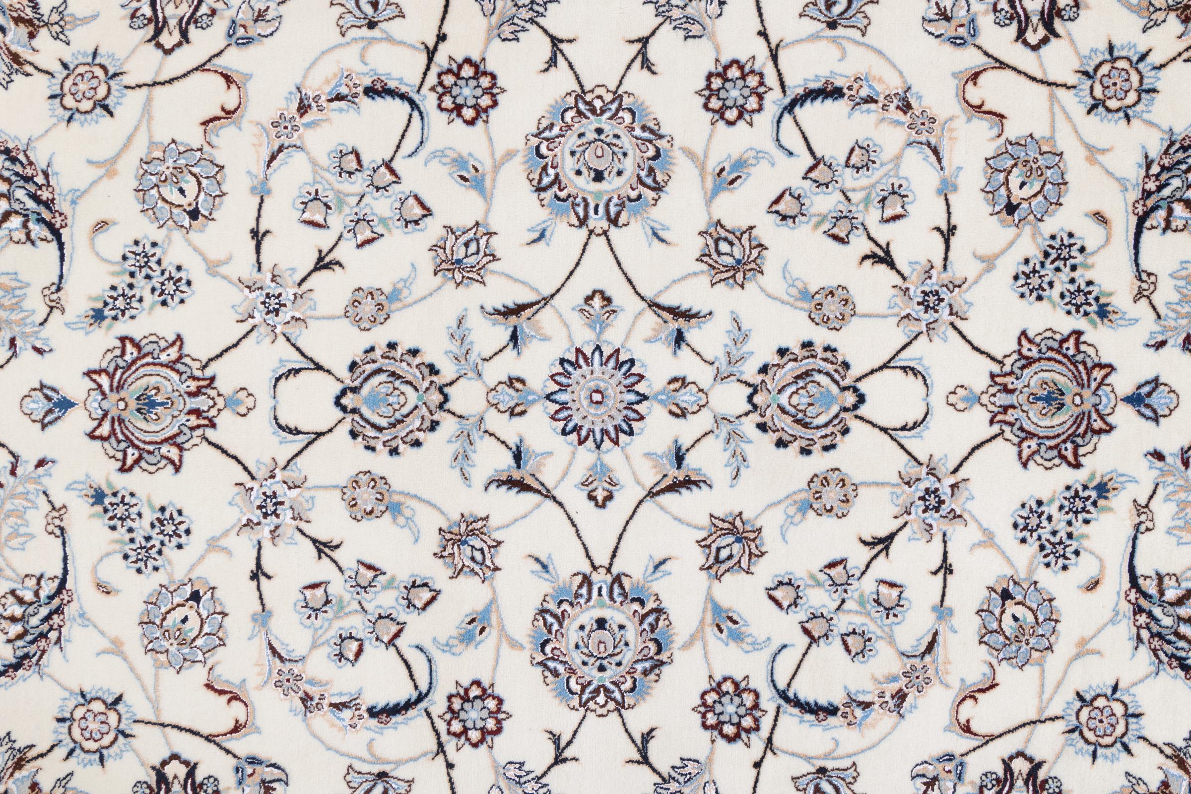 This Nain rug combines quality, tradition and an unmistakable design. It was hand-knotted from high-quality cork wool and natural silk in the desert town of the same name, Nain. Lovers of valuable rugs from Iran will love this Persian rug. With Nain rugs in the 6La and 4La classifications, you have a real work of art with an incredible level of detail that you can really lose yourself in. Nain 4La rugs are almost impossible to find today, as they are extremely elaborate to produce.