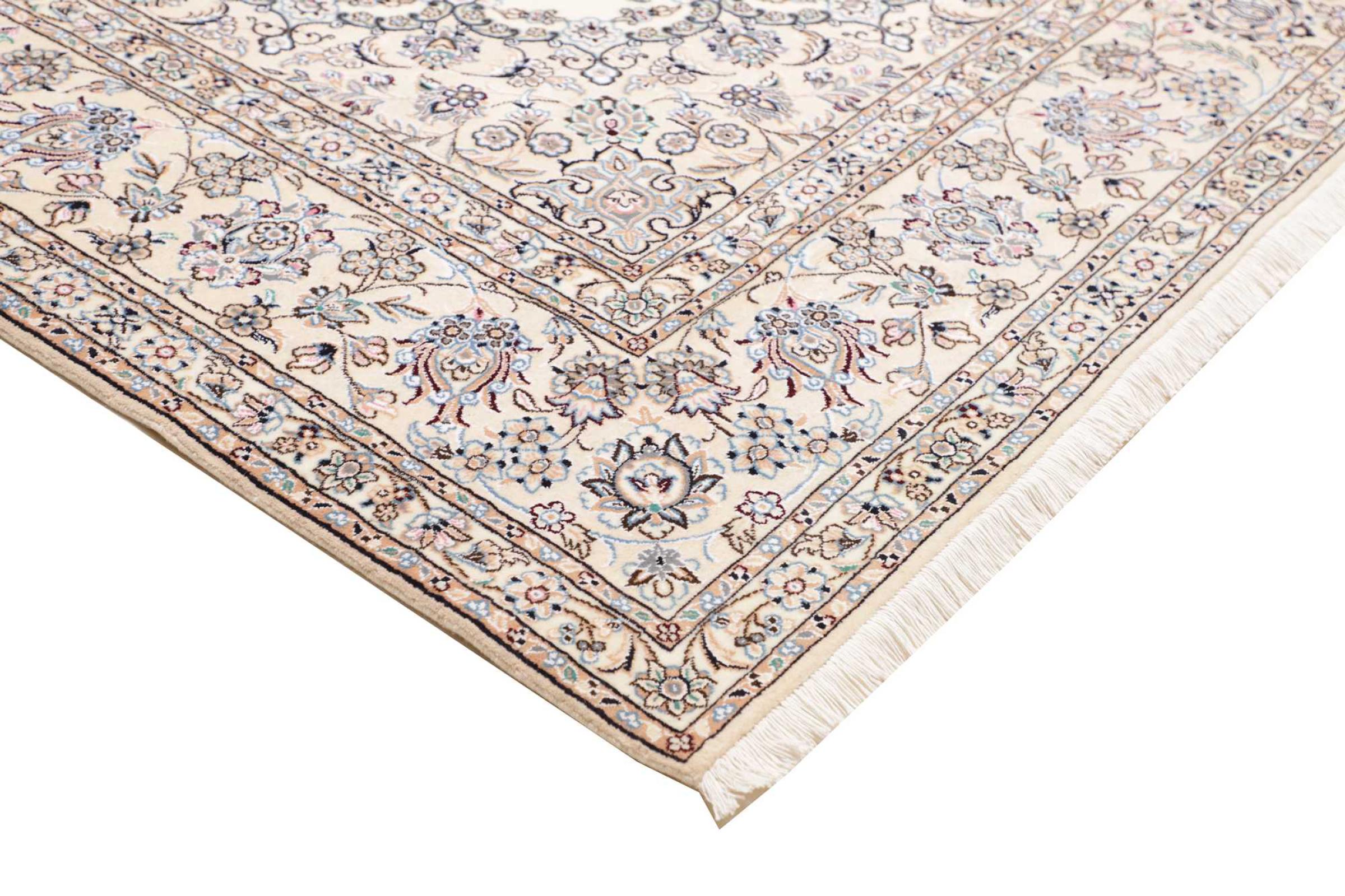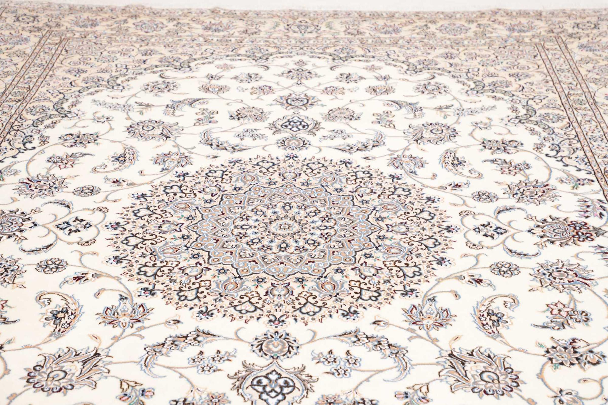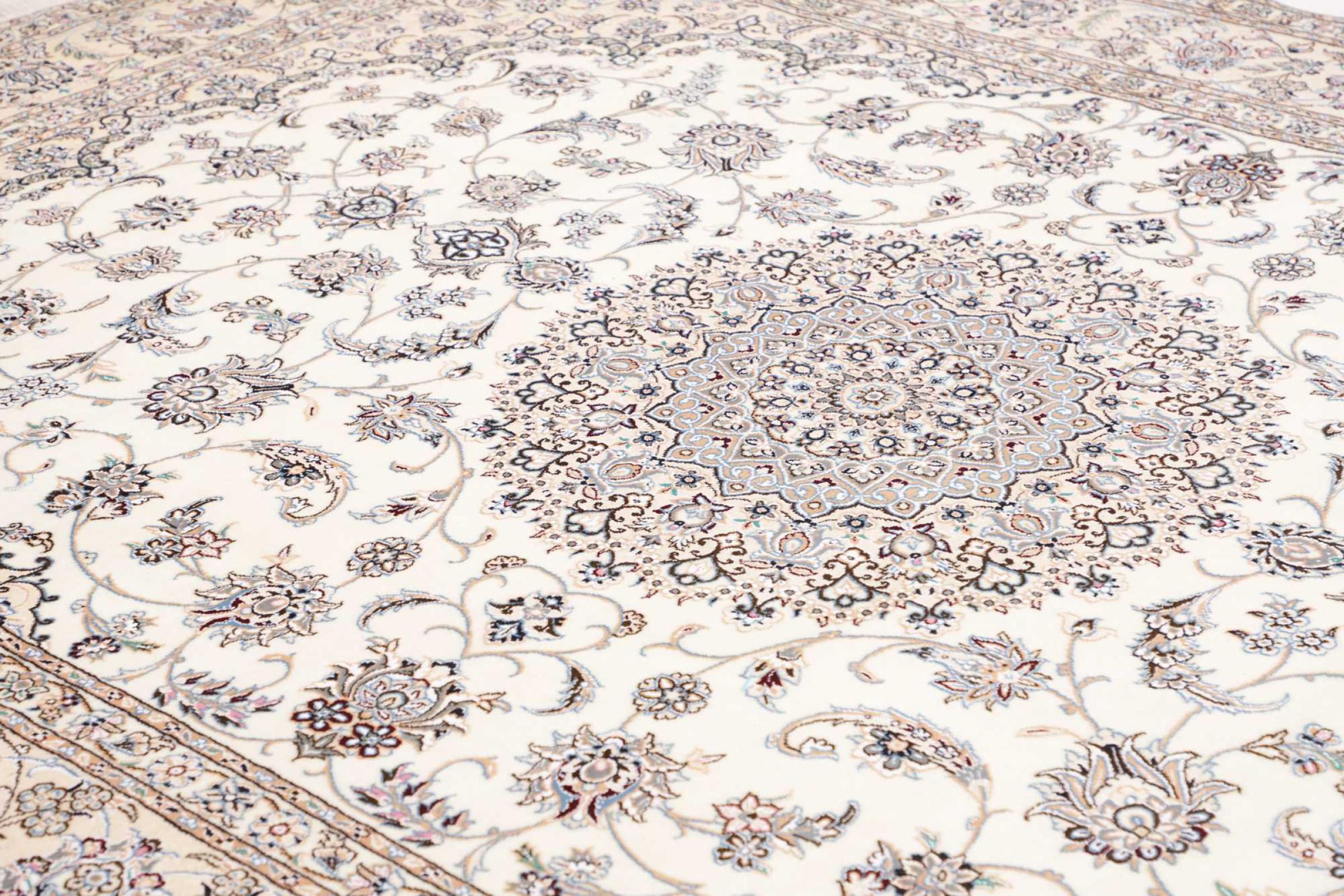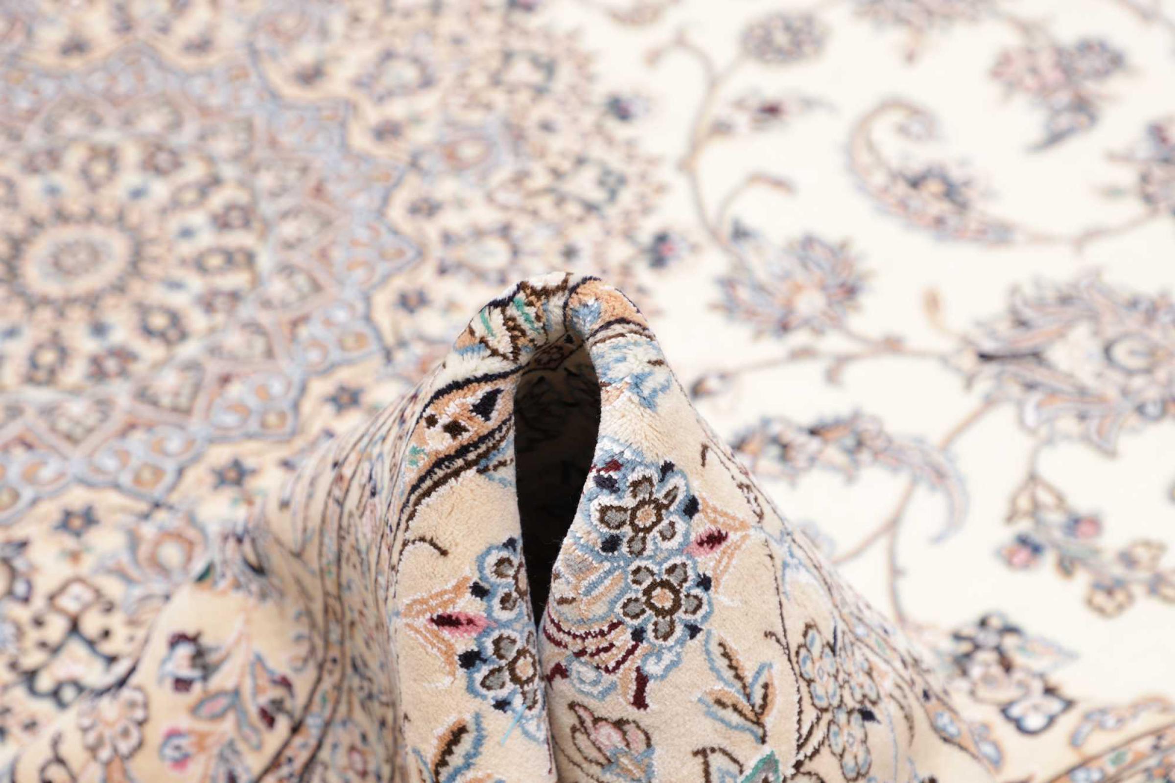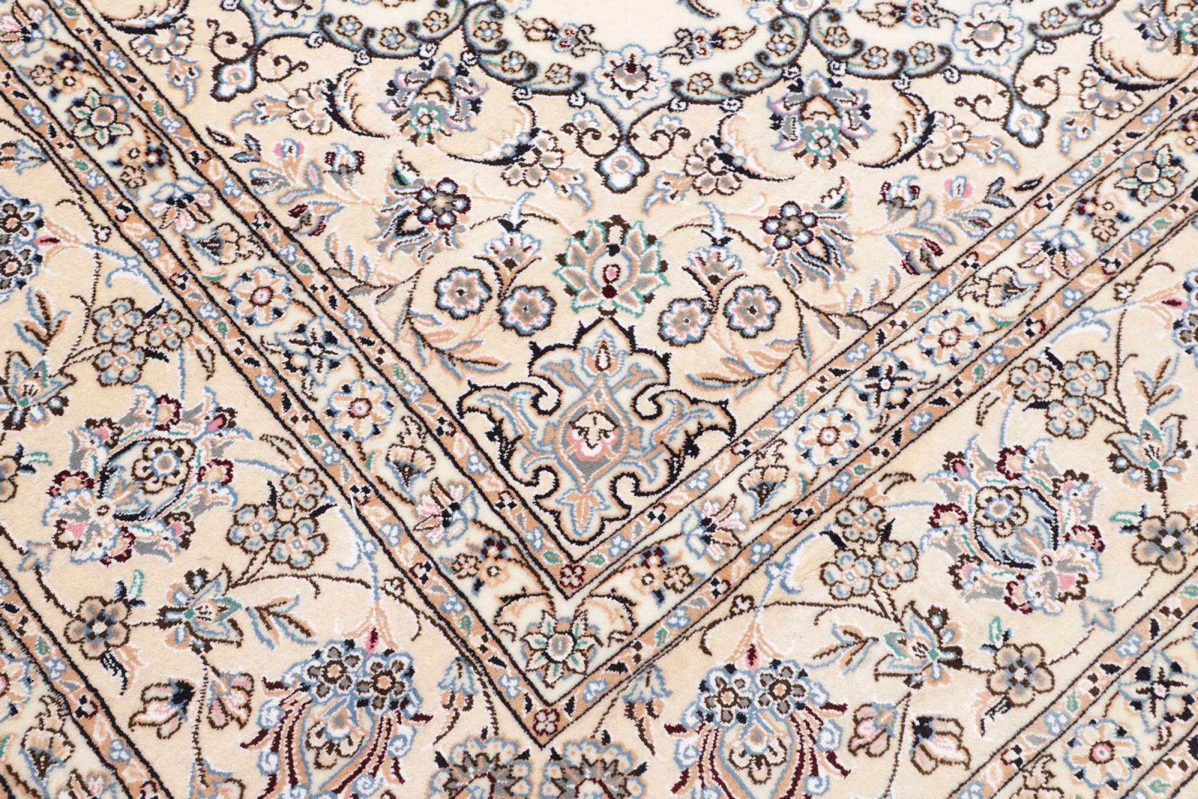 This Nain rug is classified as 9La. The excellent quality, the beautiful oriental design with its curvilinear patterns will delight every buyer. This Persian rug was hand-knotted in the city of Nain, which lies on the western edge of the Dasht-e-Kavir desert, from high-quality wool and natural silk. 9La Nain rugs are significantly finer than a 12La and already show beautiful details.