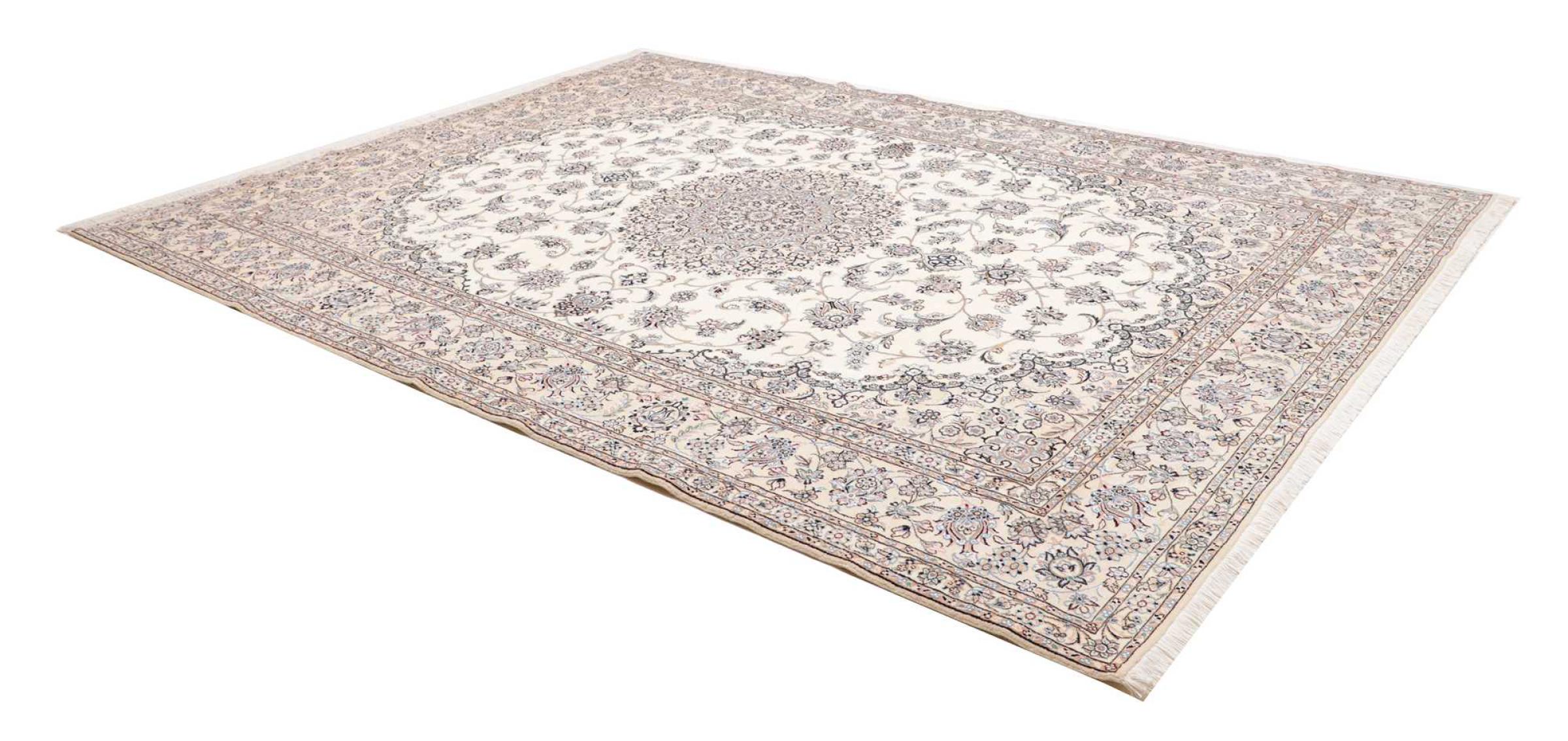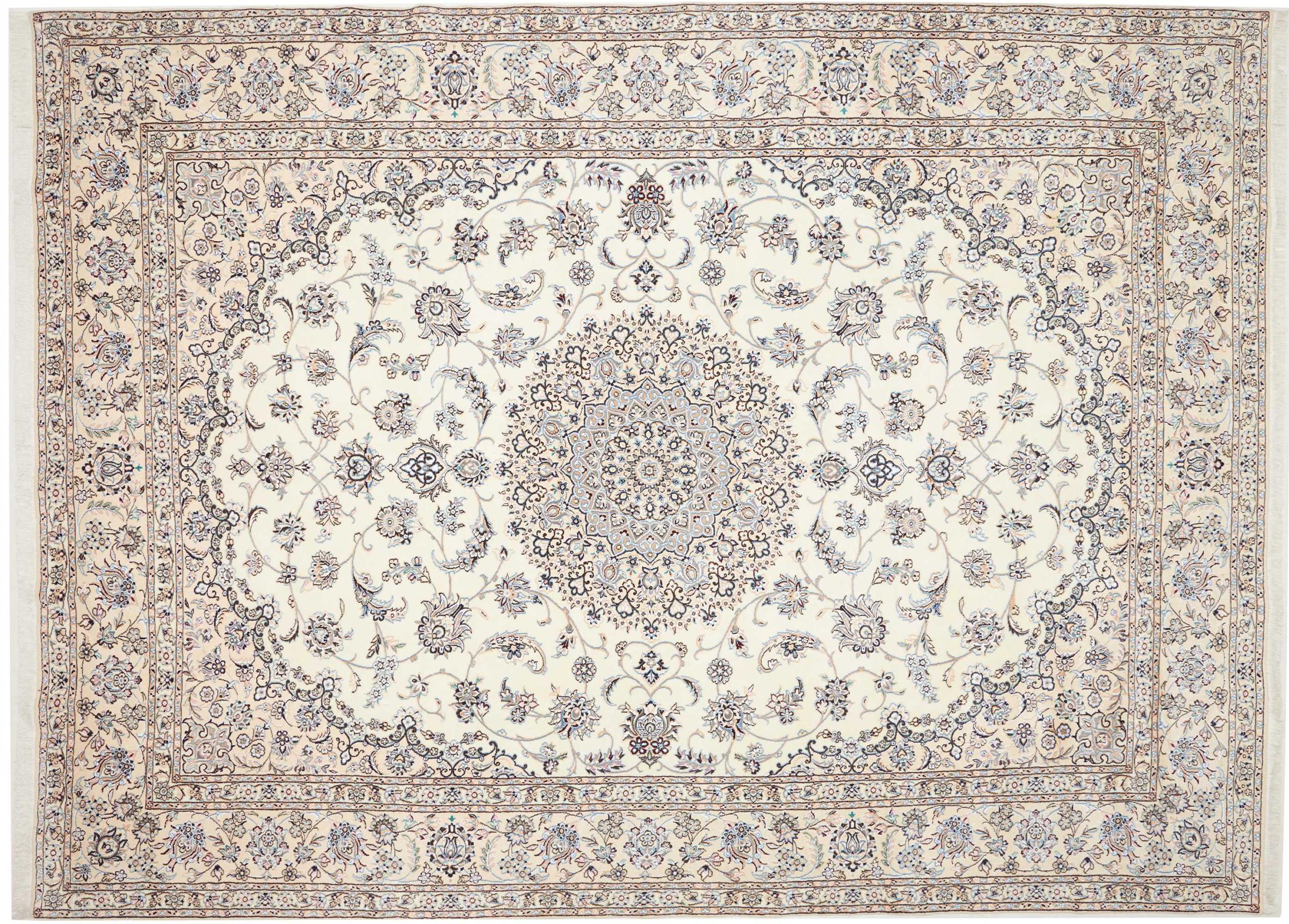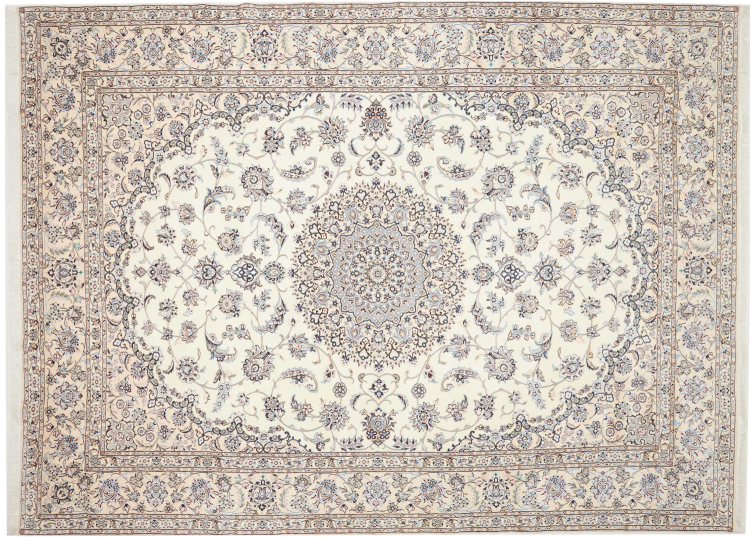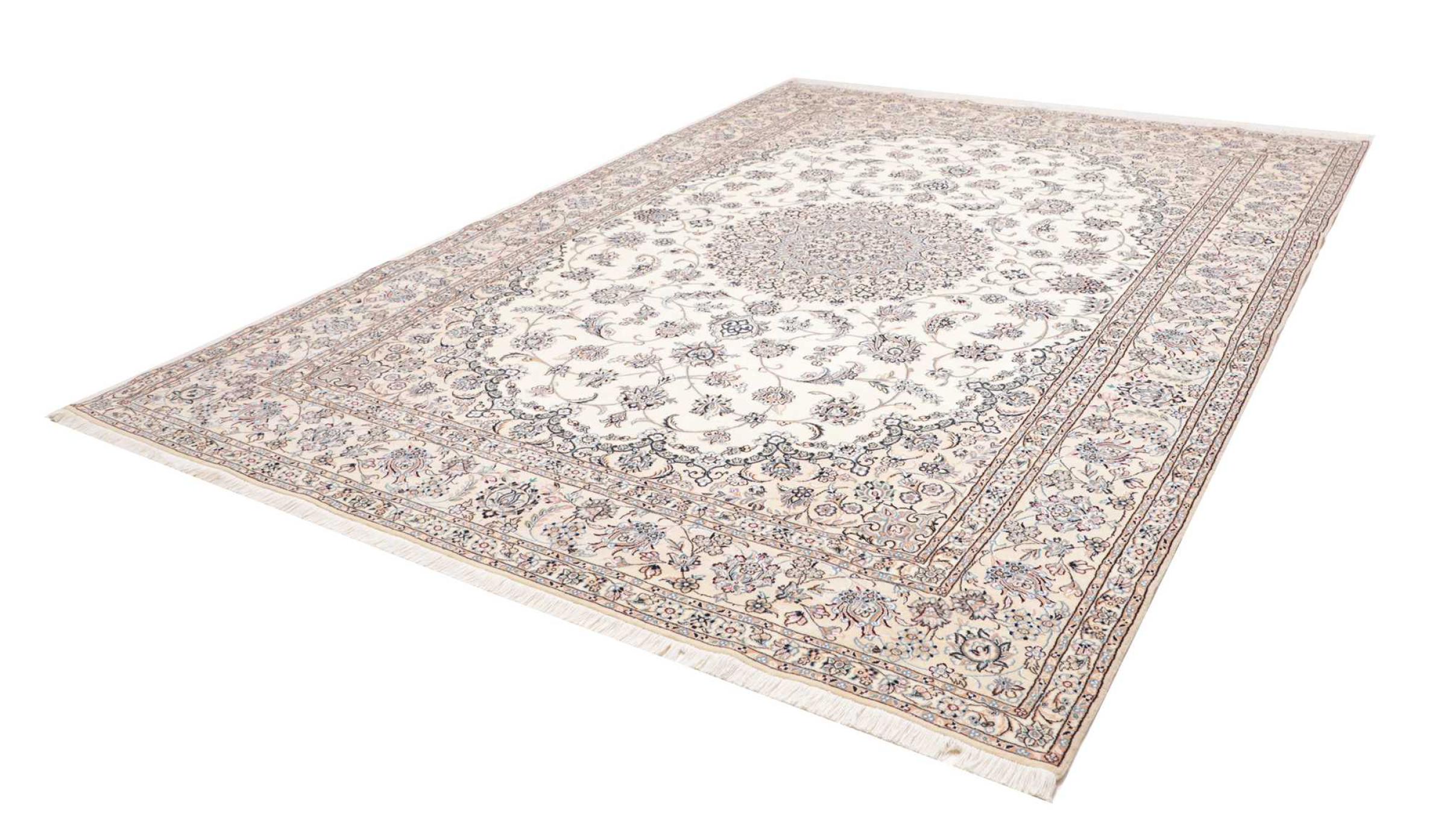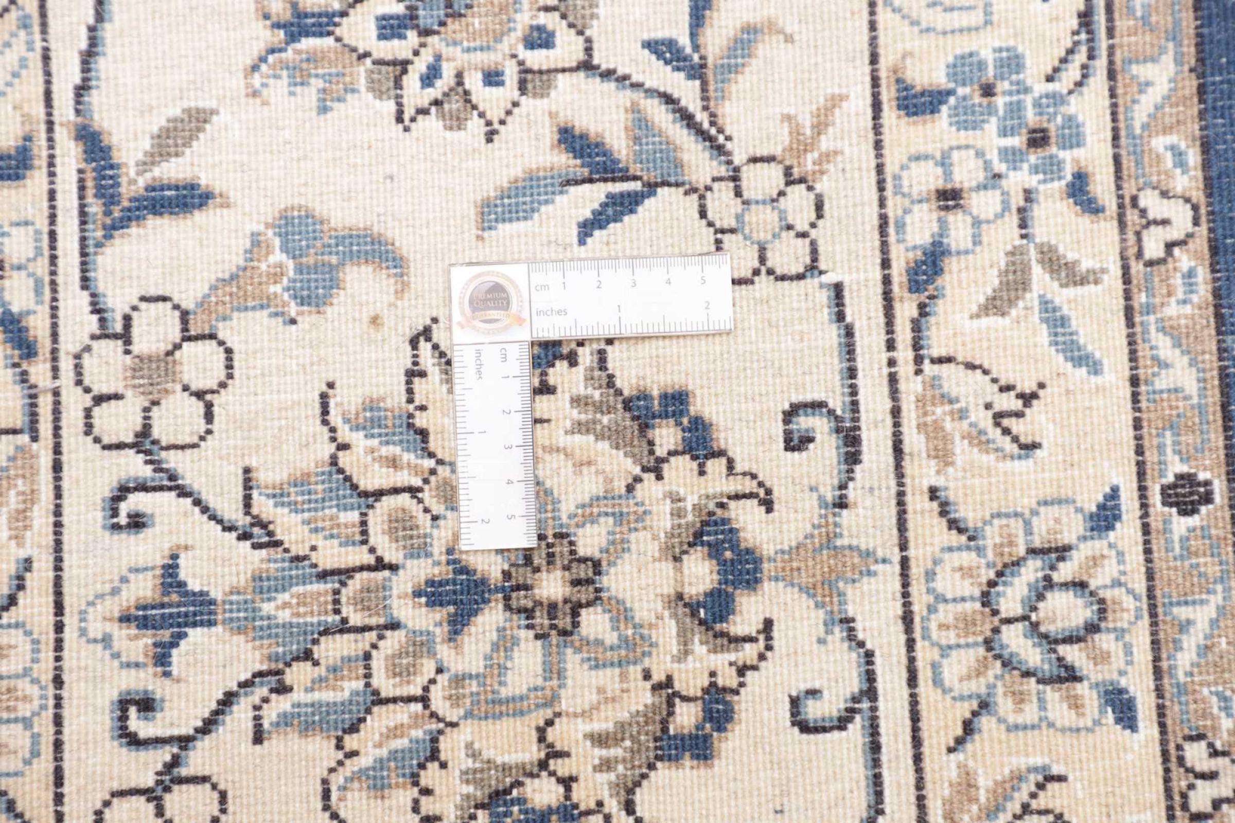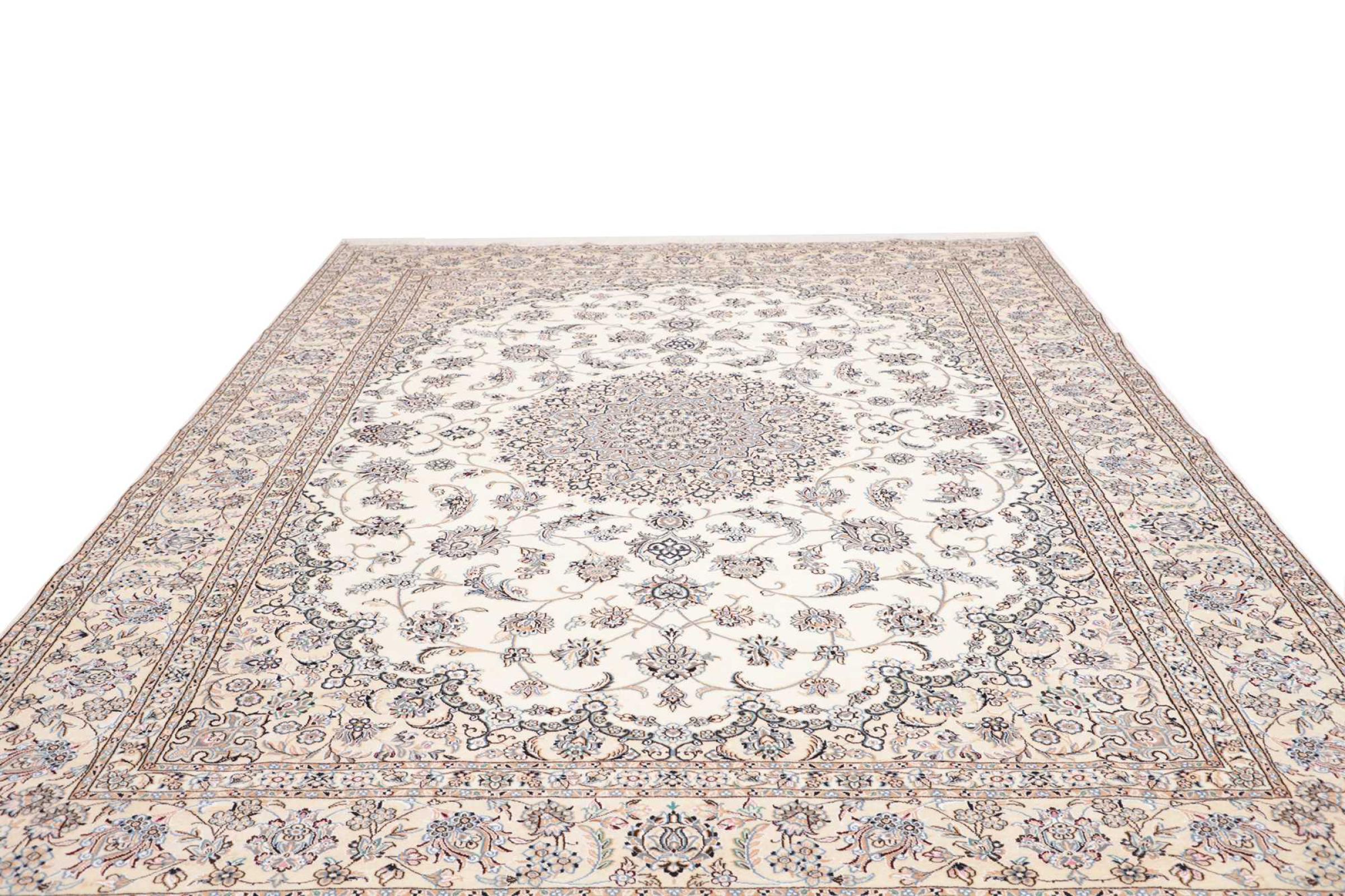 This Nain rug is classified as 9La. The excellent quality, the beautiful oriental design with its curvilinear patterns will delight every buyer. This Persian rug was hand-knotted in the city of Nain, which lies on the western edge of the Dasht-e-Kavir desert, from high-quality wool and natural silk. 9La Nain rugs are significantly finer than a 12La and already show beautiful details.