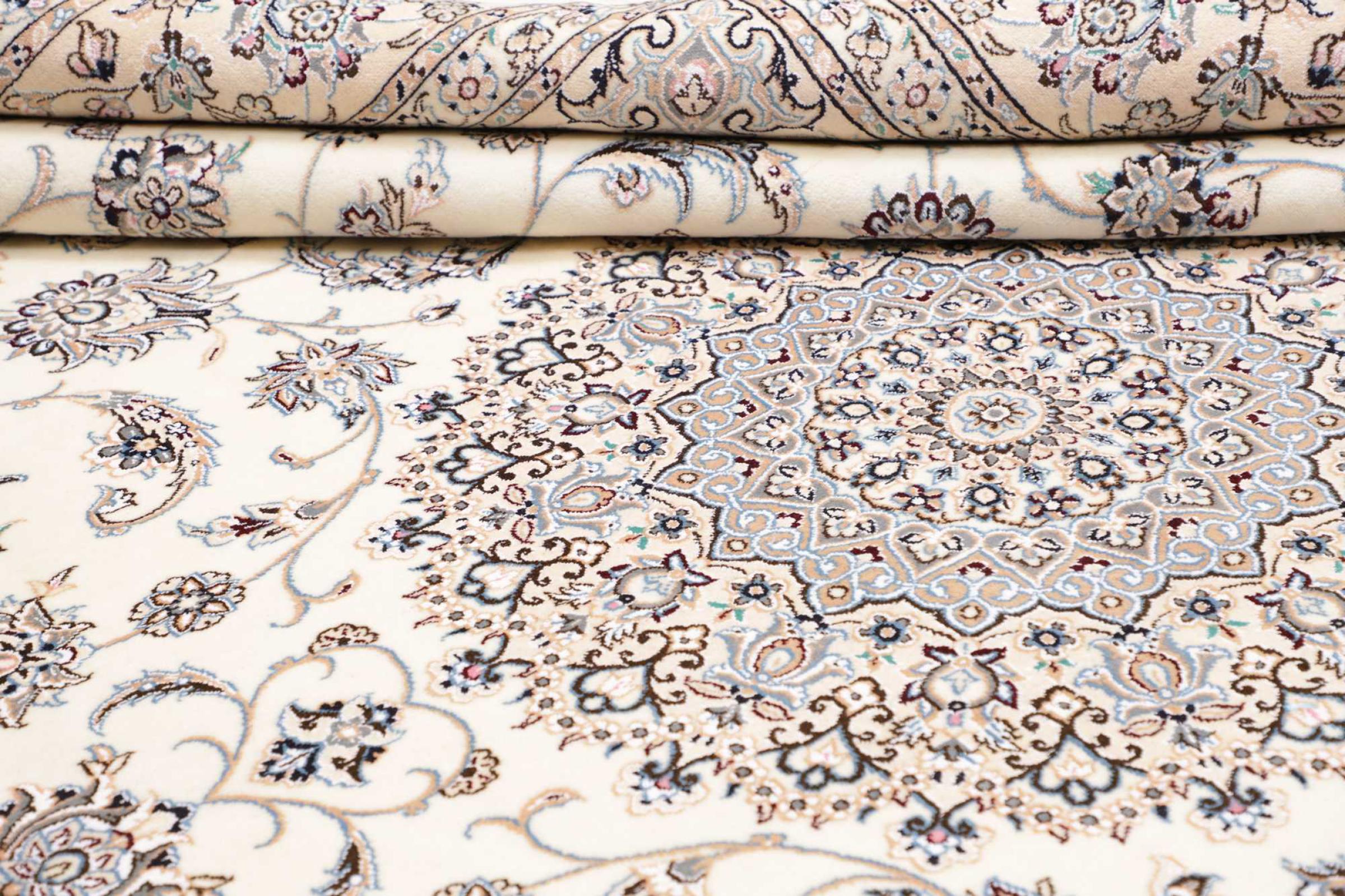 Rugs from the city of Nain, from the border of one of the largest deserts in Iran, are among the most famous Persian rugs in the world. Their typical design is characterized by floral ornaments, a medallion in the middle as well as beige and red or blue shades. Thanks to their designations 4La, 6La, 9La and 12La, the finenesses of a Nain rug can be seen at a glance. The lower the "La" number, the higher the knot density and thus the finer the rug.