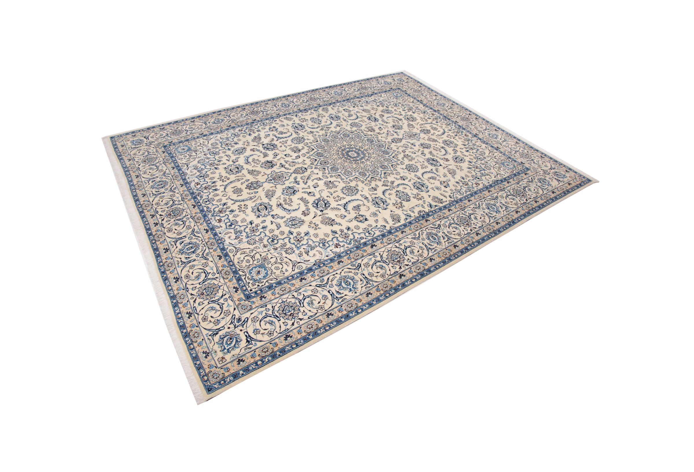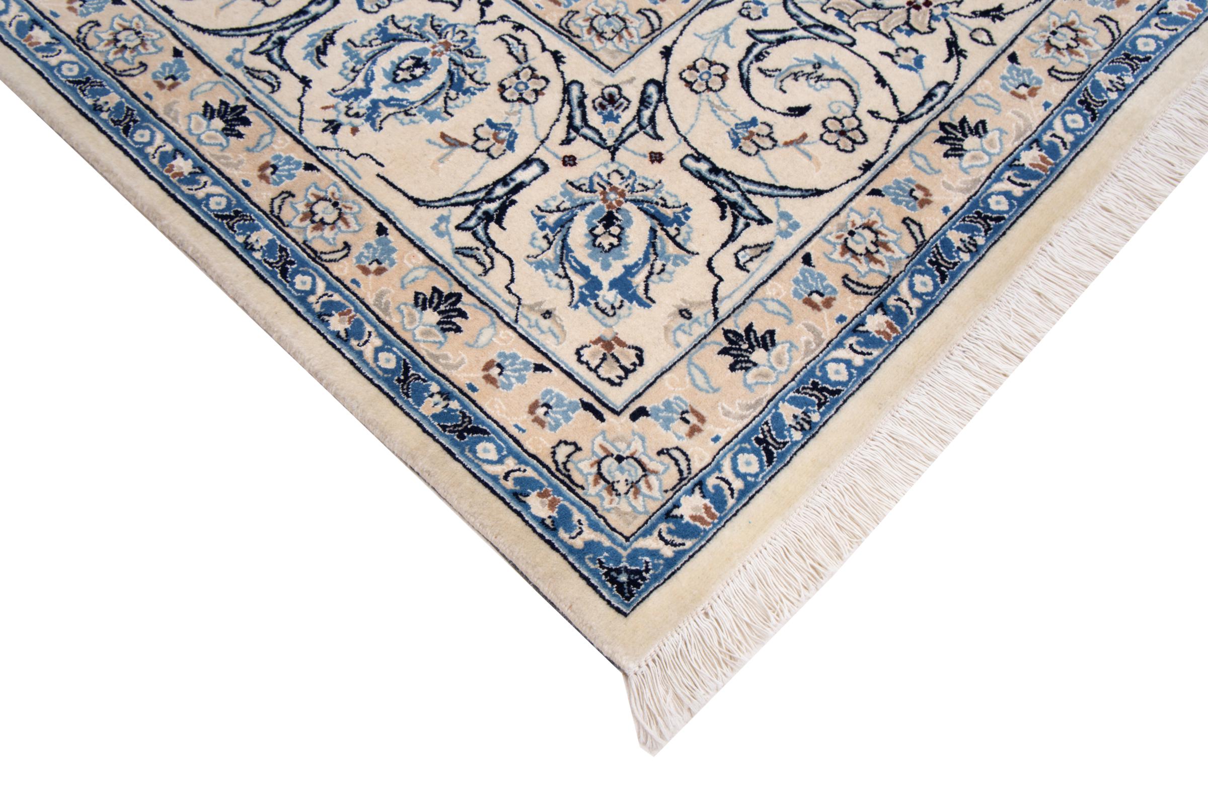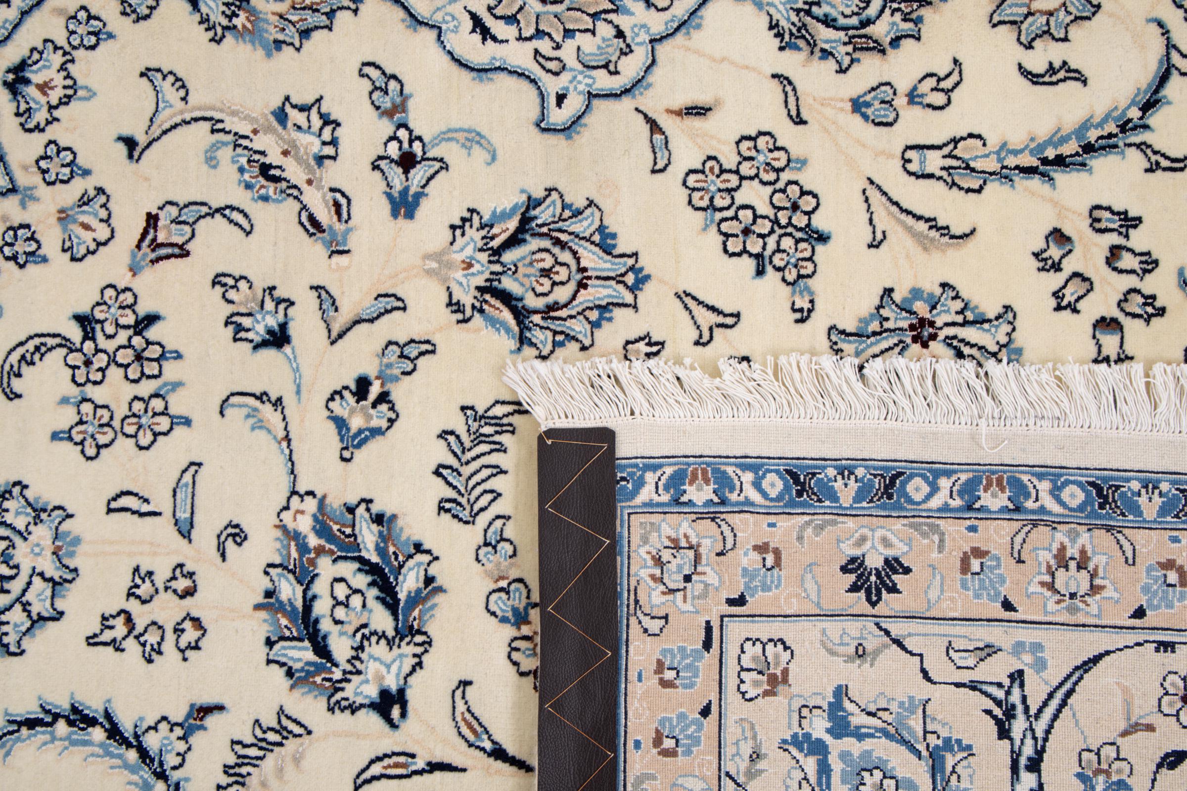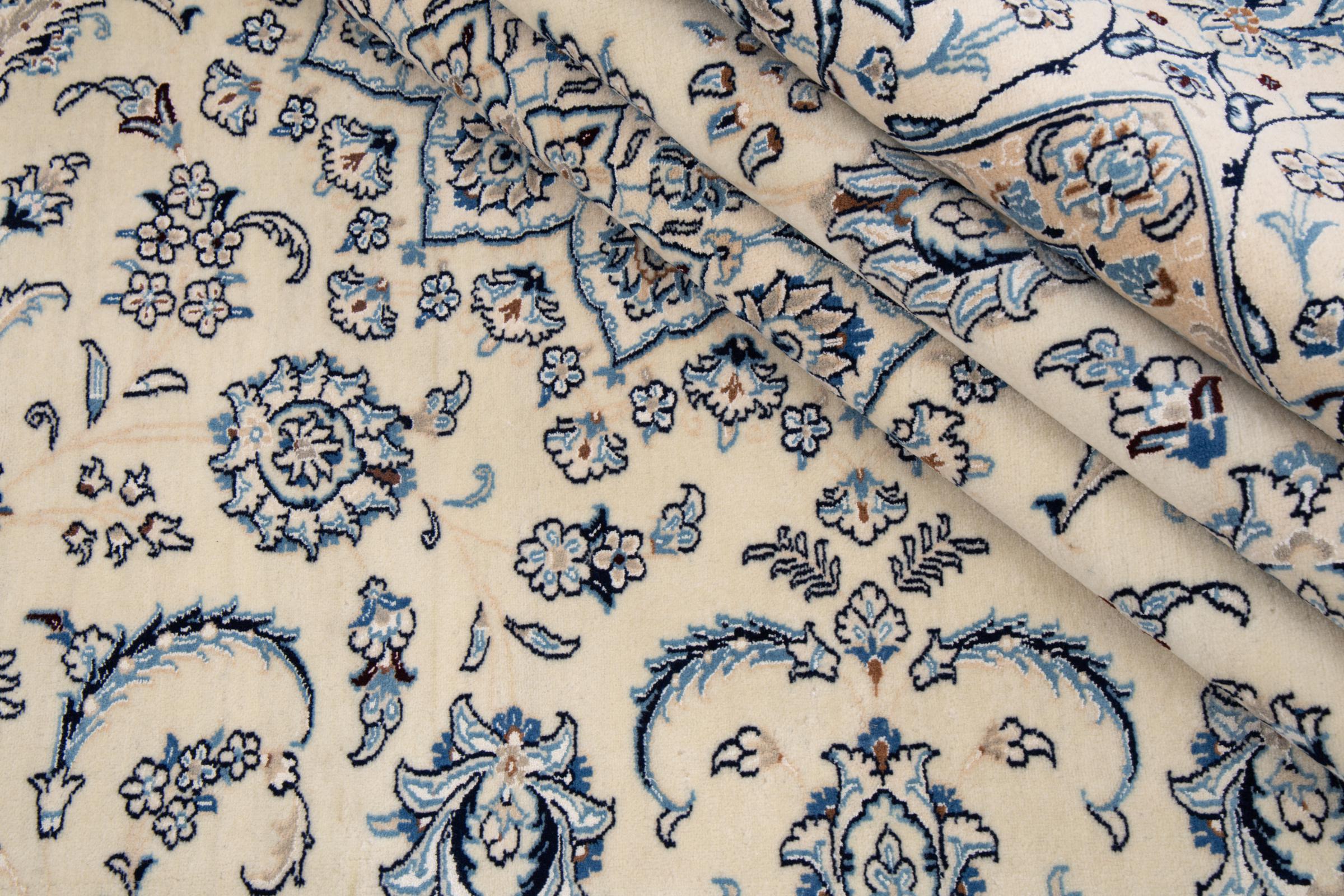 This Nain rug is classified as 9La. The excellent quality, the beautiful oriental design with its curvilinear patterns will delight every buyer. This Persian rug was hand-knotted in the city of Nain, which lies on the western edge of the Dasht-e-Kavir desert, from high-quality wool and natural silk. 9La Nain rugs are significantly finer than a 12La and already show beautiful details.
