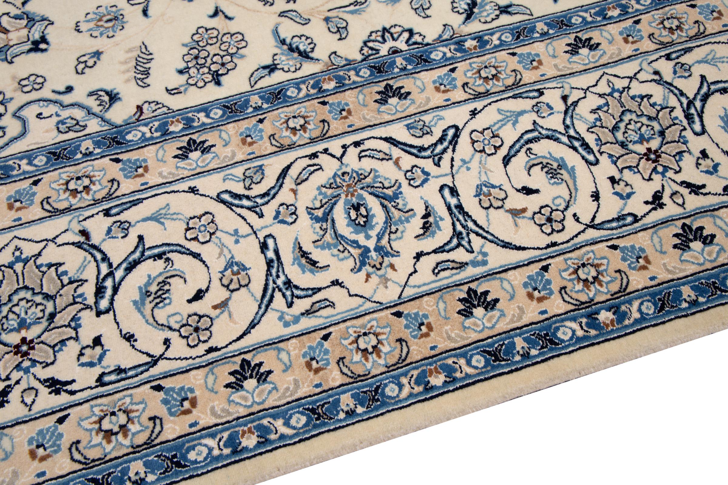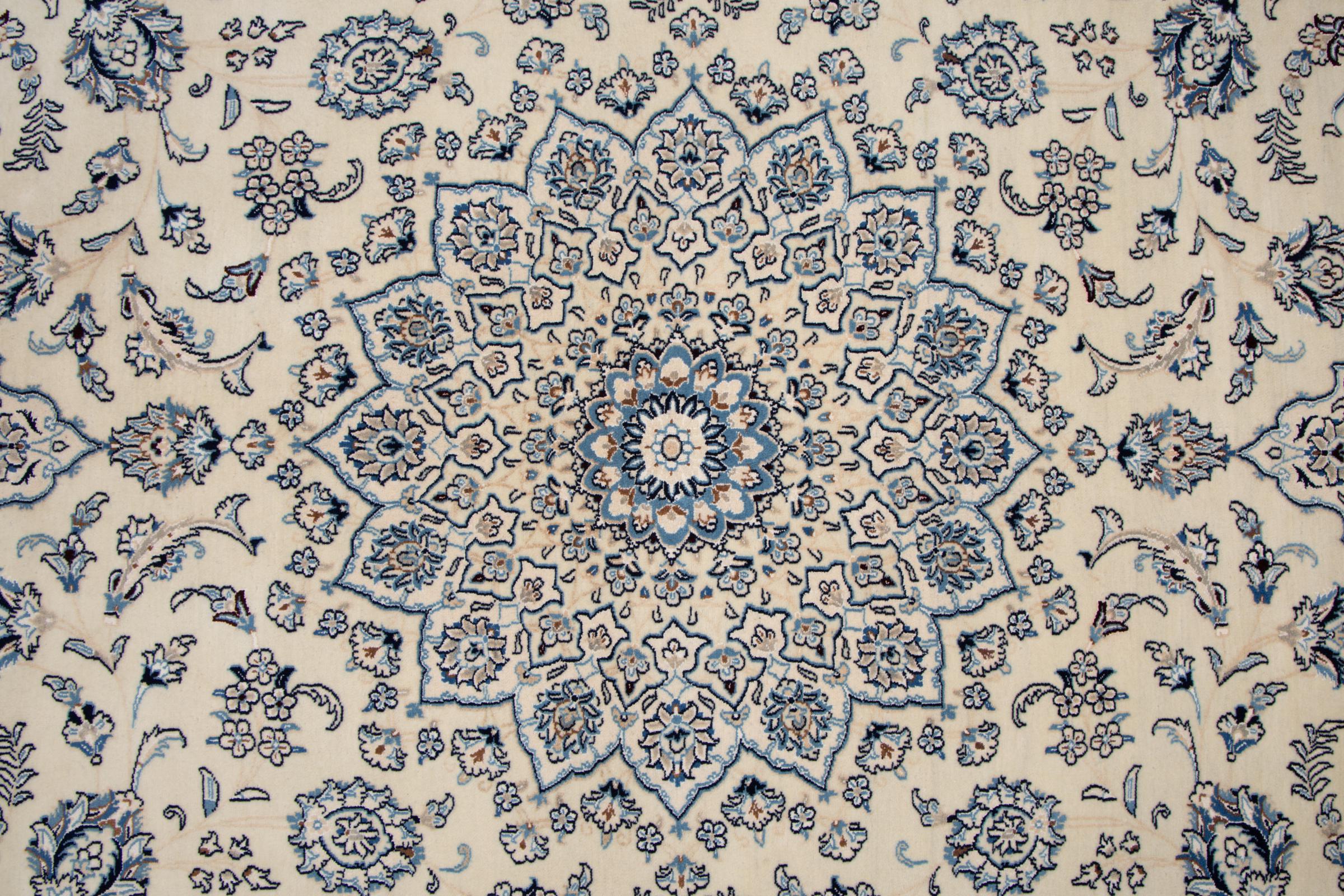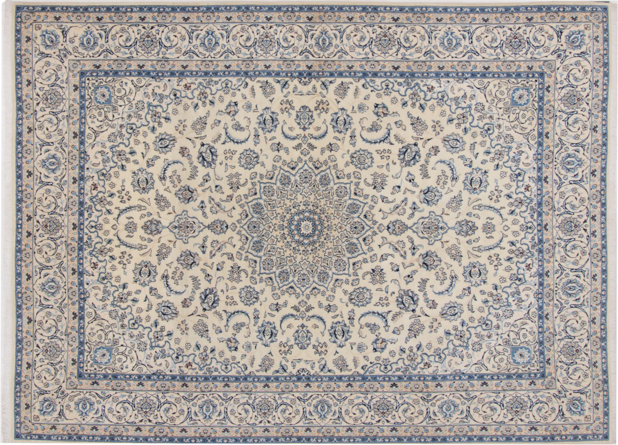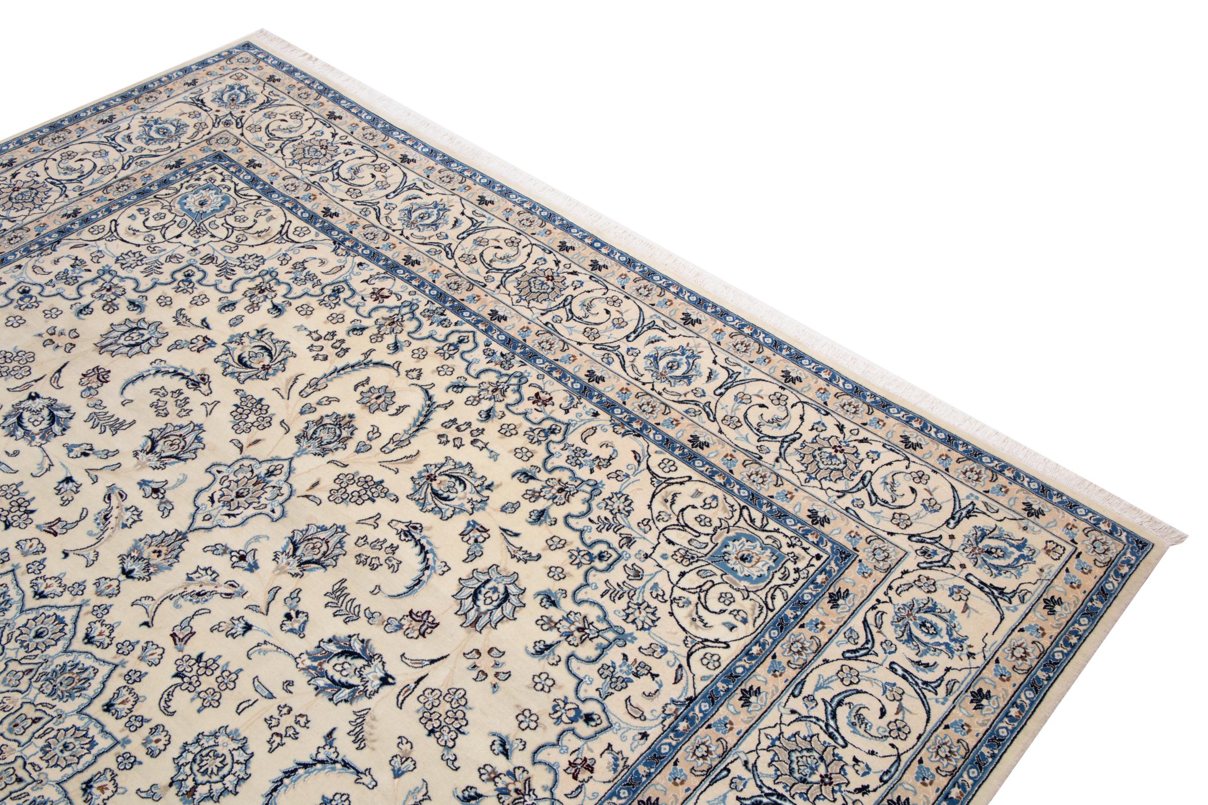 This Nain rug is classified as 9La. The excellent quality, the beautiful oriental design with its curvilinear patterns will delight every buyer. This Persian rug was hand-knotted in the city of Nain, which lies on the western edge of the Dasht-e-Kavir desert, from high-quality wool and natural silk. 9La Nain rugs are significantly finer than a 12La and already show beautiful details.