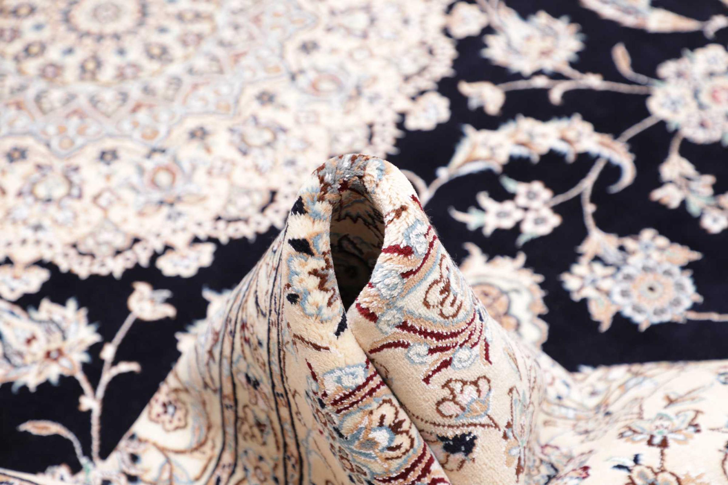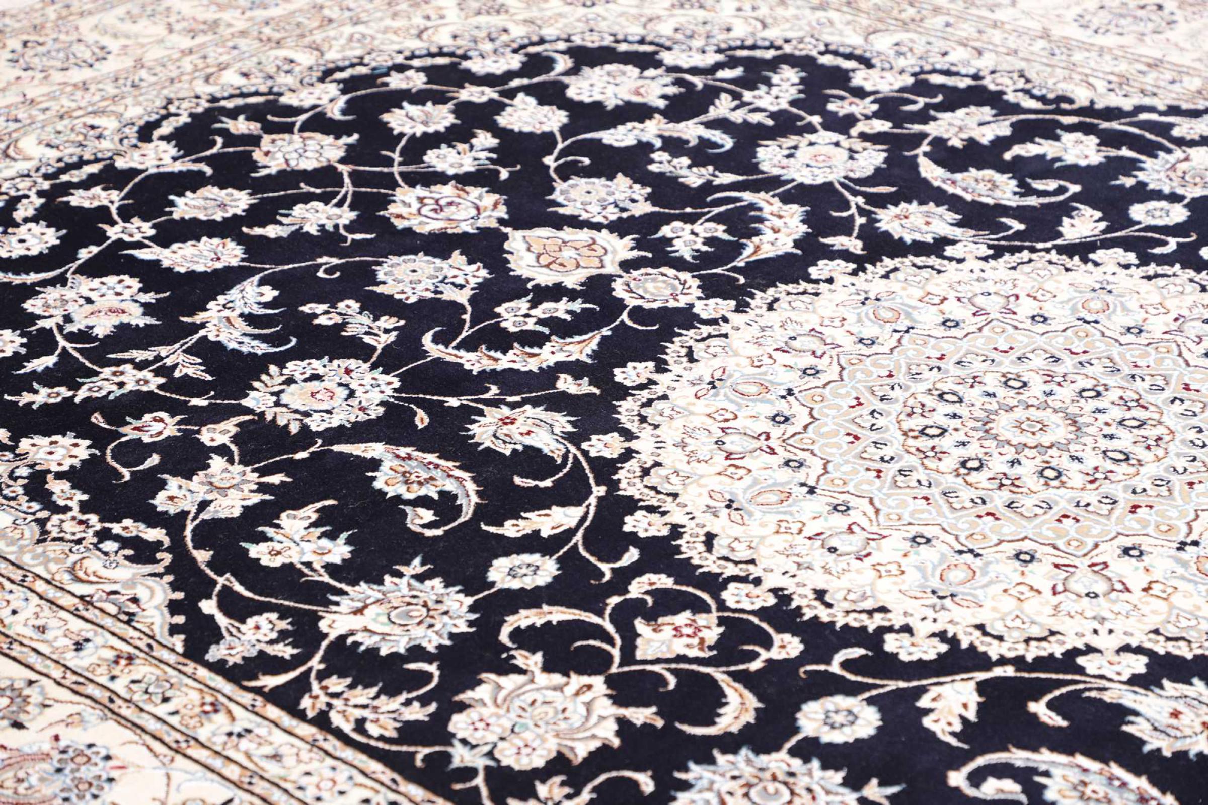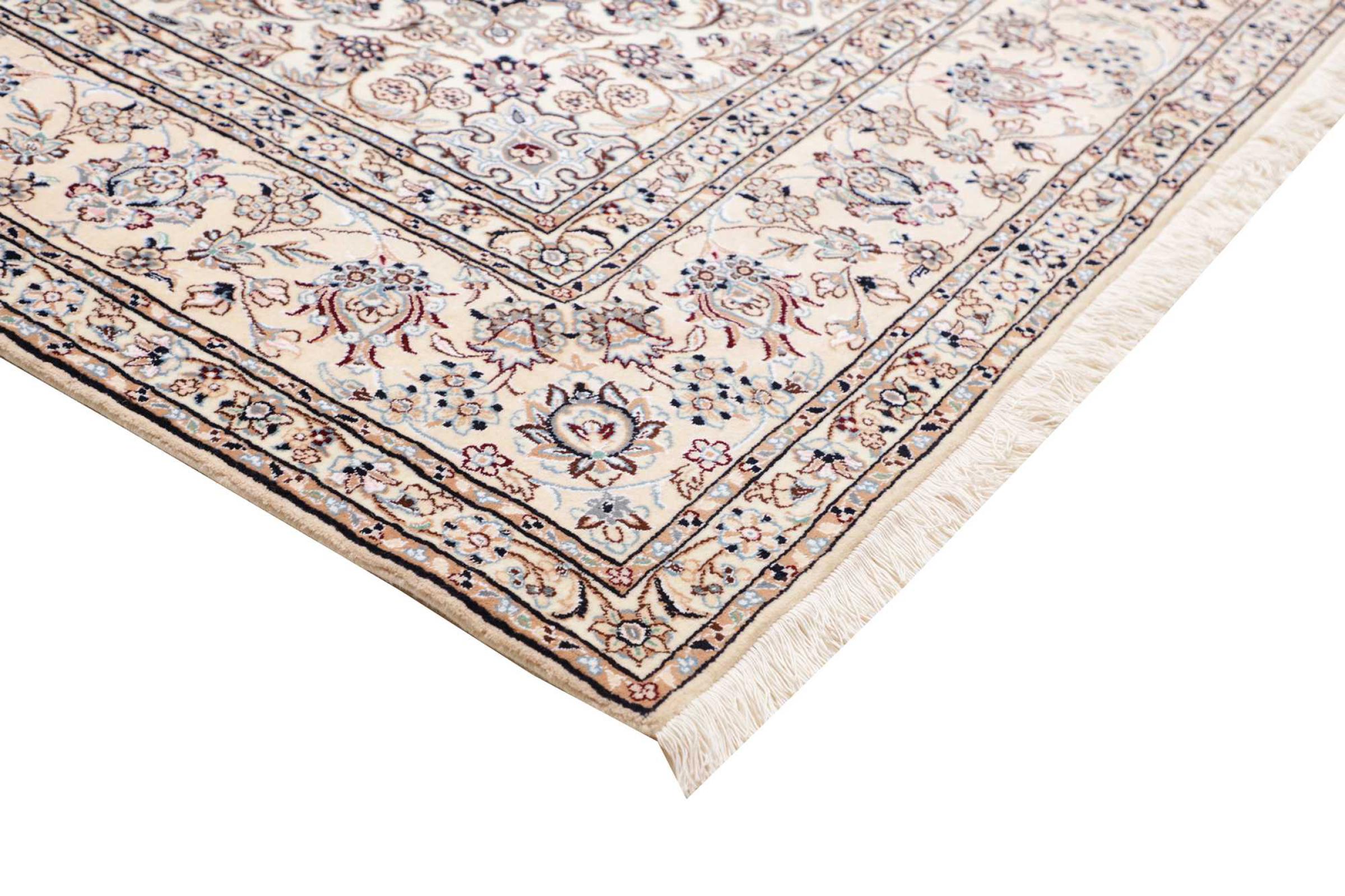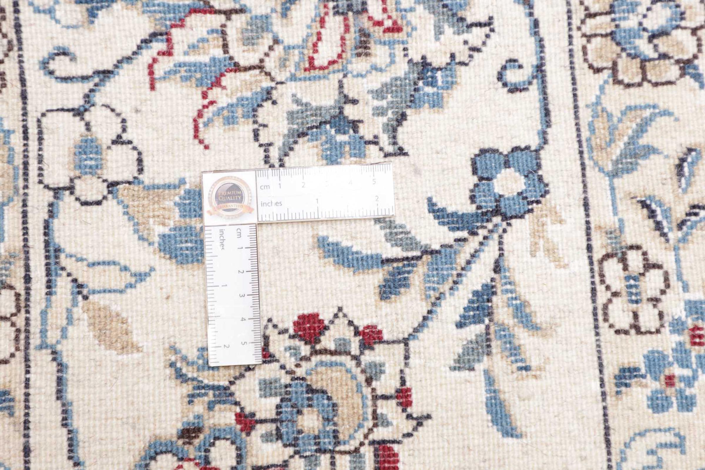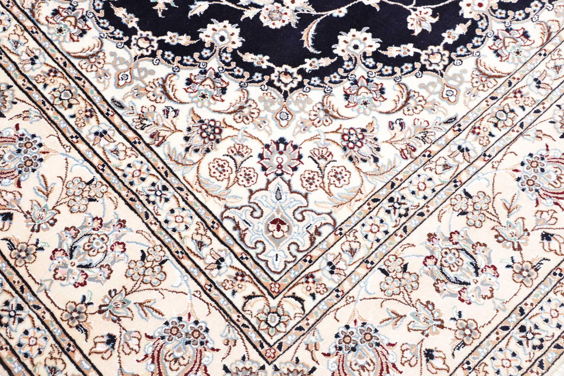 This Nain rug is classified as 9La. The excellent quality, the beautiful oriental design with its curvilinear patterns will delight every buyer. This Persian rug was hand-knotted in the city of Nain, which lies on the western edge of the Dasht-e-Kavir desert, from high-quality wool and natural silk. 9La Nain rugs are significantly finer than a 12La and already show beautiful details.
