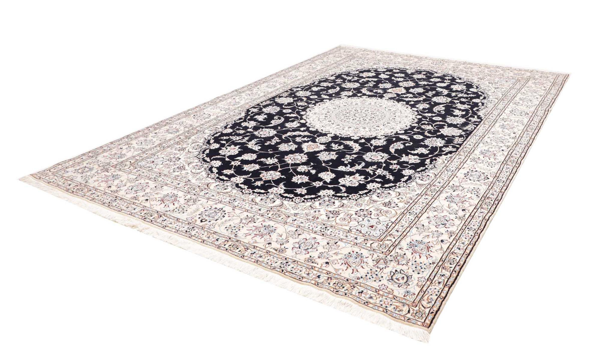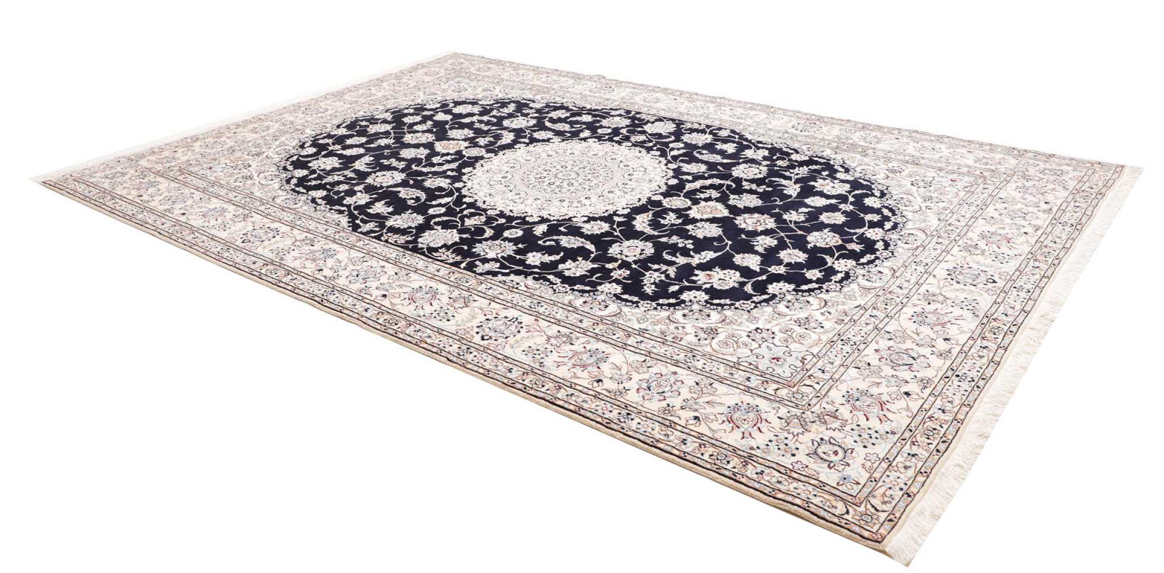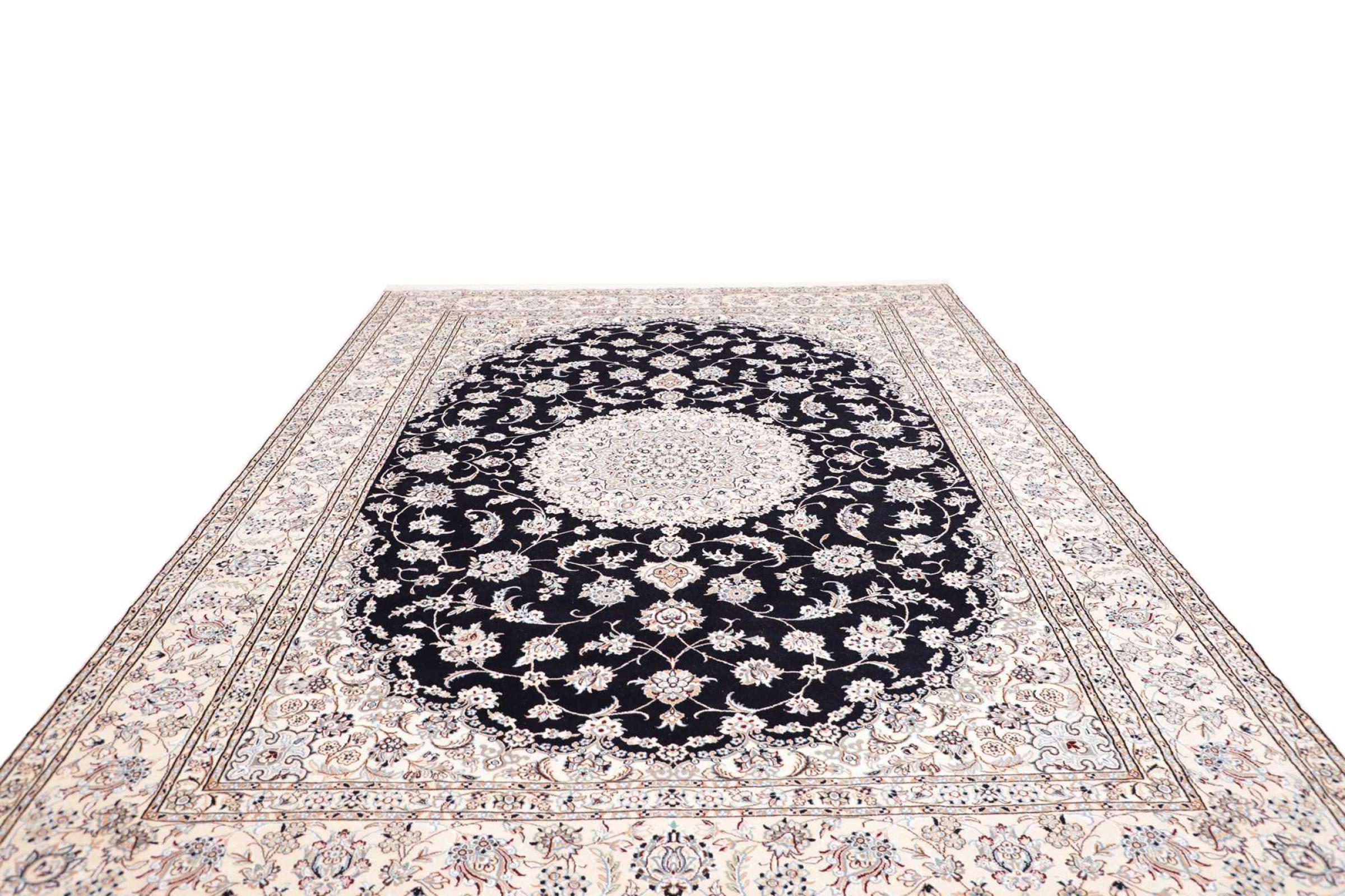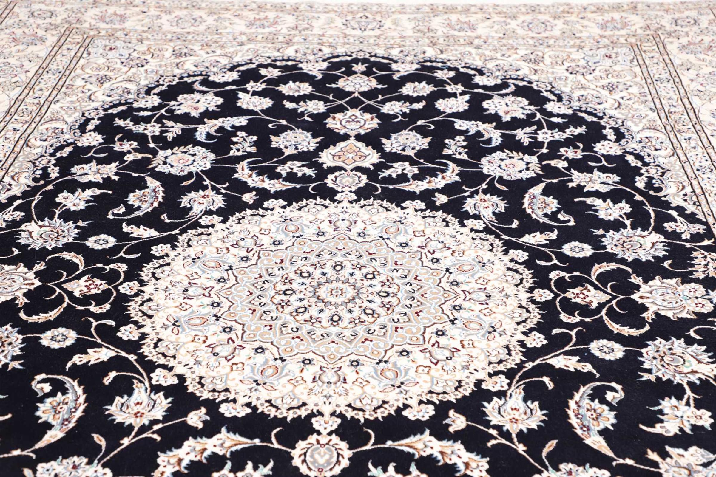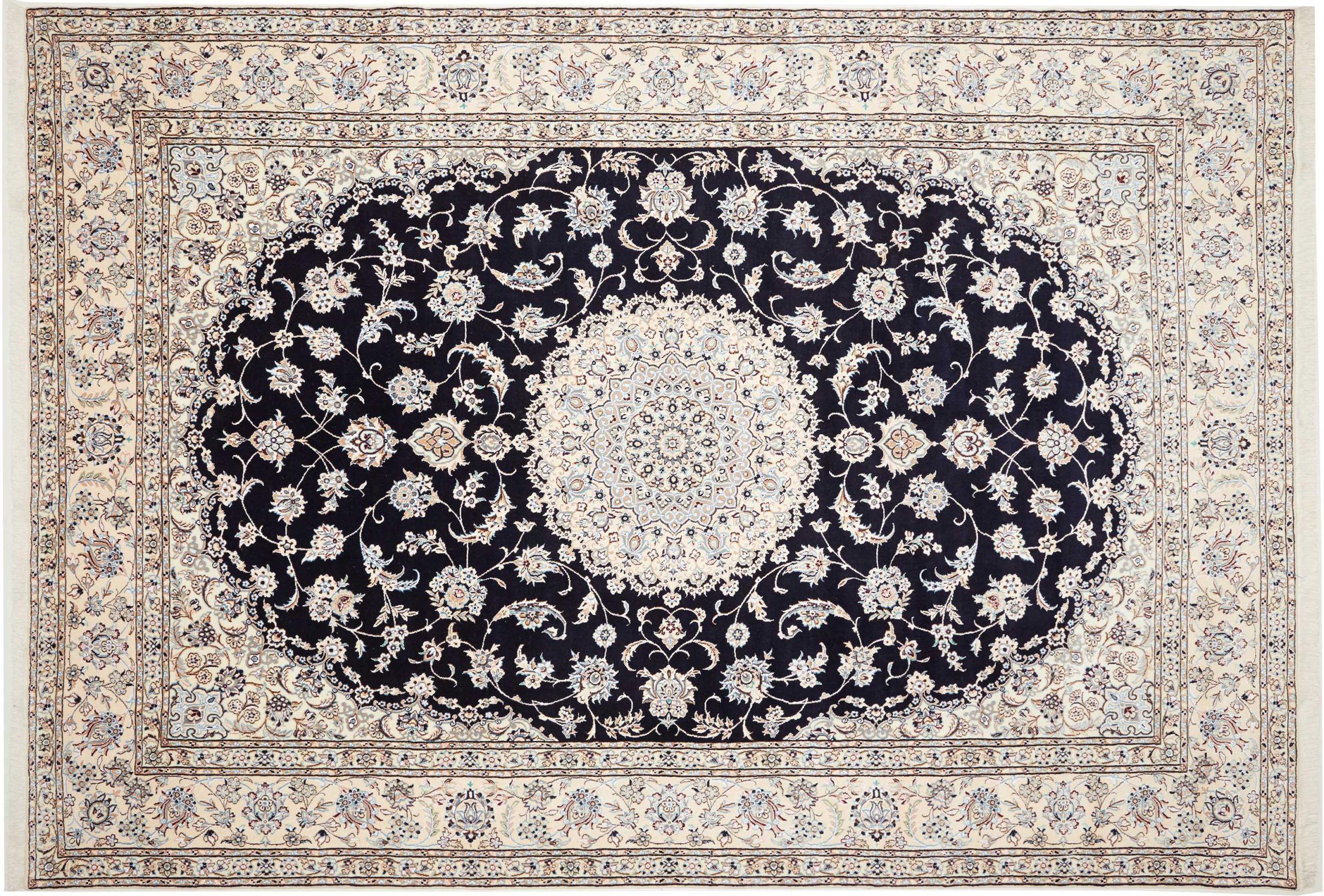 This Nain rug is classified as 9La. The excellent quality, the beautiful oriental design with its curvilinear patterns will delight every buyer. This Persian rug was hand-knotted in the city of Nain, which lies on the western edge of the Dasht-e-Kavir desert, from high-quality wool and natural silk. 9La Nain rugs are significantly finer than a 12La and already show beautiful details.