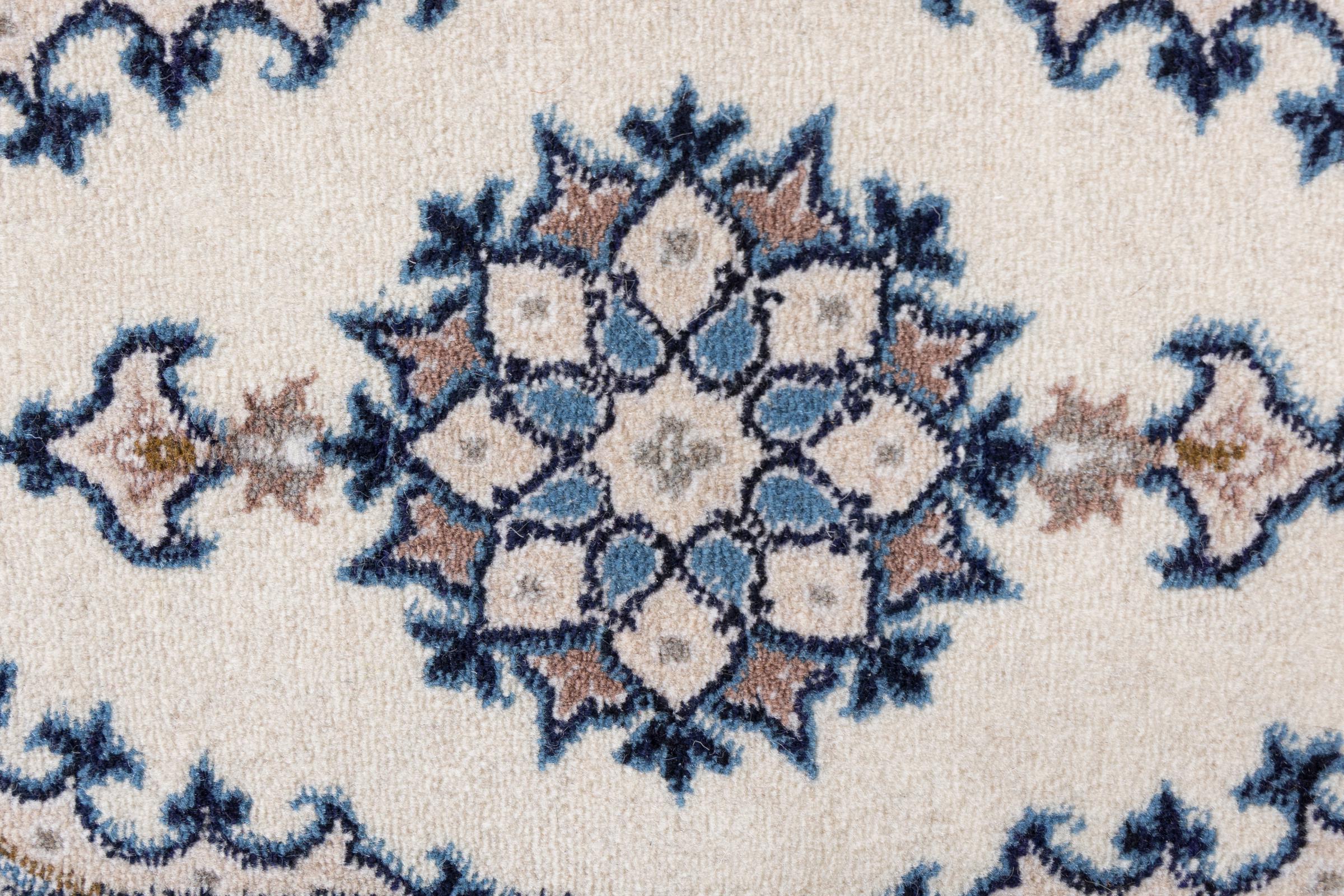 This Nain rug is classified as 12La. Its typical Nain colour scheme gives it an elegant and sophisticated look. This Persian rug was hand-knotted in the city of Nain, which lies on the western edge of the Dasht-e-Kavir desert, using high-quality wool and natural silk. At 12La, it is not as finely detailed with ornamentation as a Nain 9La or 6La.