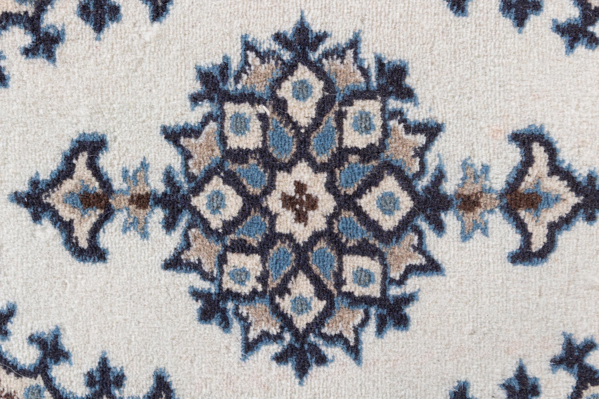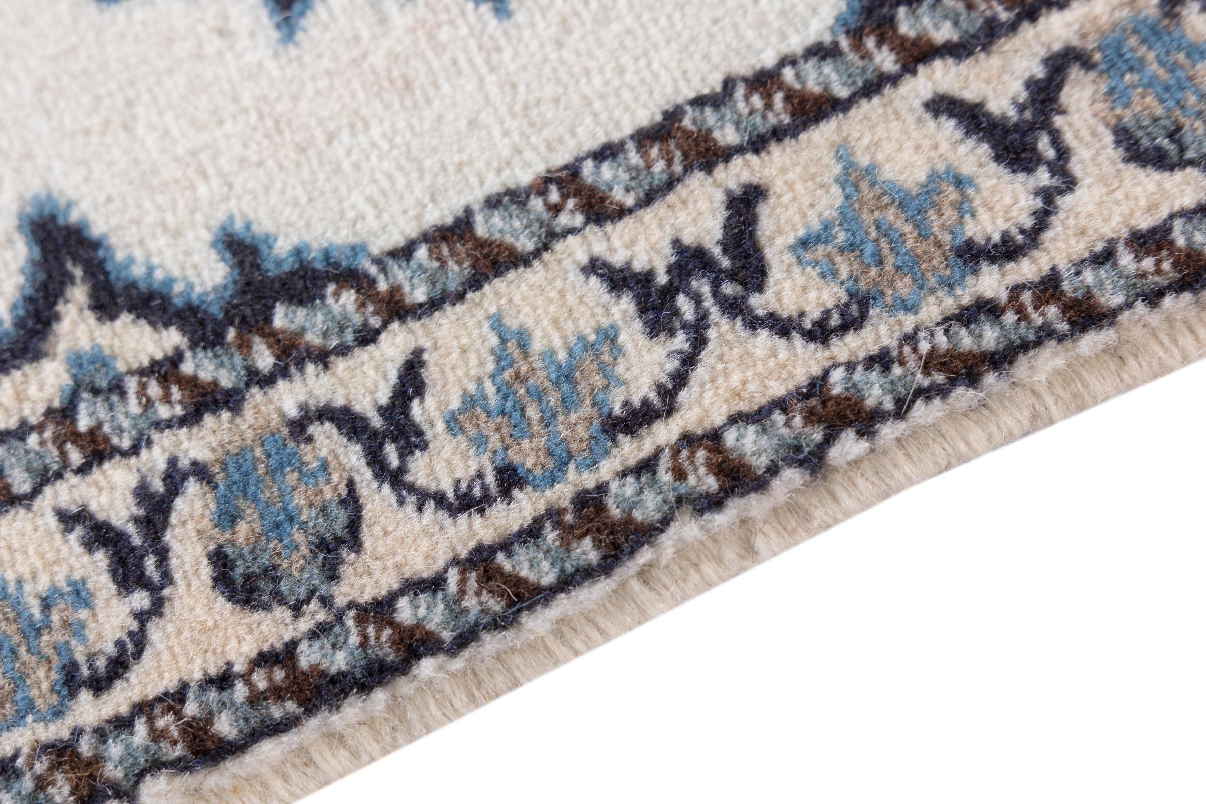 This Nain rug is classified as 12La. Its typical Nain colour scheme gives it an elegant and sophisticated look. This Persian rug was hand-knotted in the city of Nain, which lies on the western edge of the Dasht-e-Kavir desert, using high-quality wool and natural silk. At 12La, it is not as finely detailed with ornamentation as a Nain 9La or 6La.