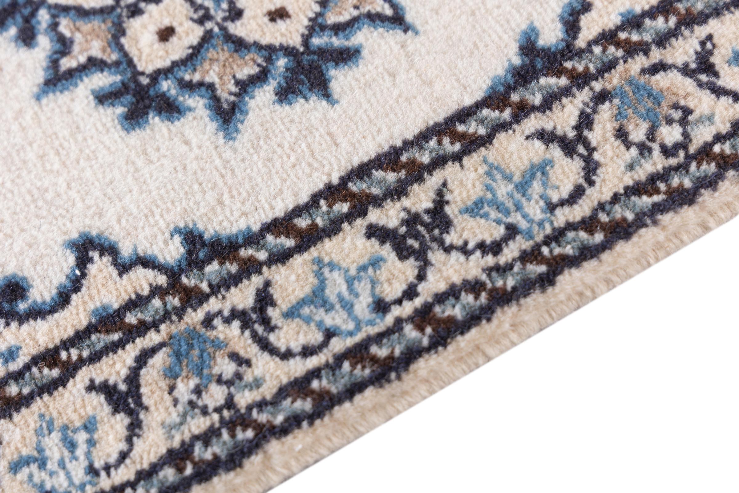 This Nain rug is classified as 12La. Its typical Nain colour scheme gives it an elegant and sophisticated look. This Persian rug was hand-knotted in the city of Nain, which lies on the western edge of the Dasht-e-Kavir desert, using high-quality wool and natural silk. At 12La, it is not as finely detailed with ornamentation as a Nain 9La or 6La.