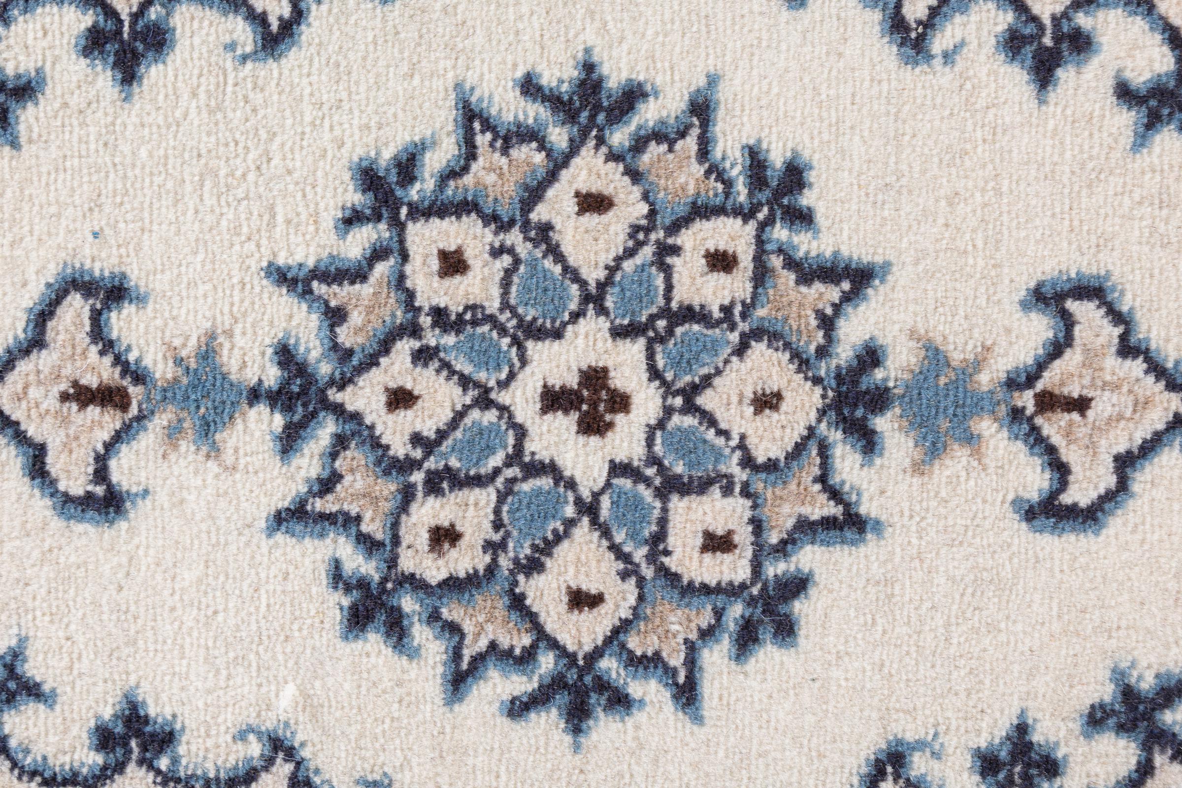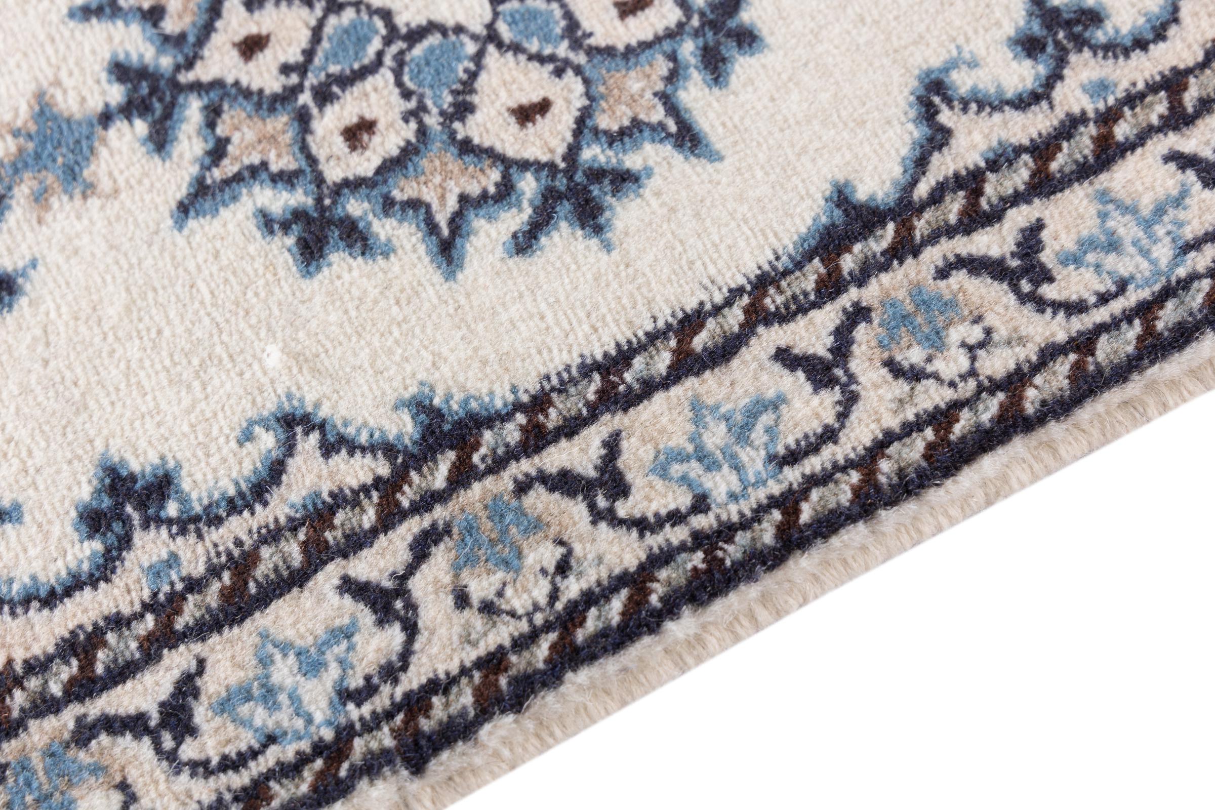 This Nain rug is classified as 12La. Its typical Nain colour scheme gives it an elegant and sophisticated look. This Persian rug was hand-knotted in the city of Nain, which lies on the western edge of the Dasht-e-Kavir desert, using high-quality wool and natural silk. At 12La, it is not as finely detailed with ornamentation as a Nain 9La or 6La.