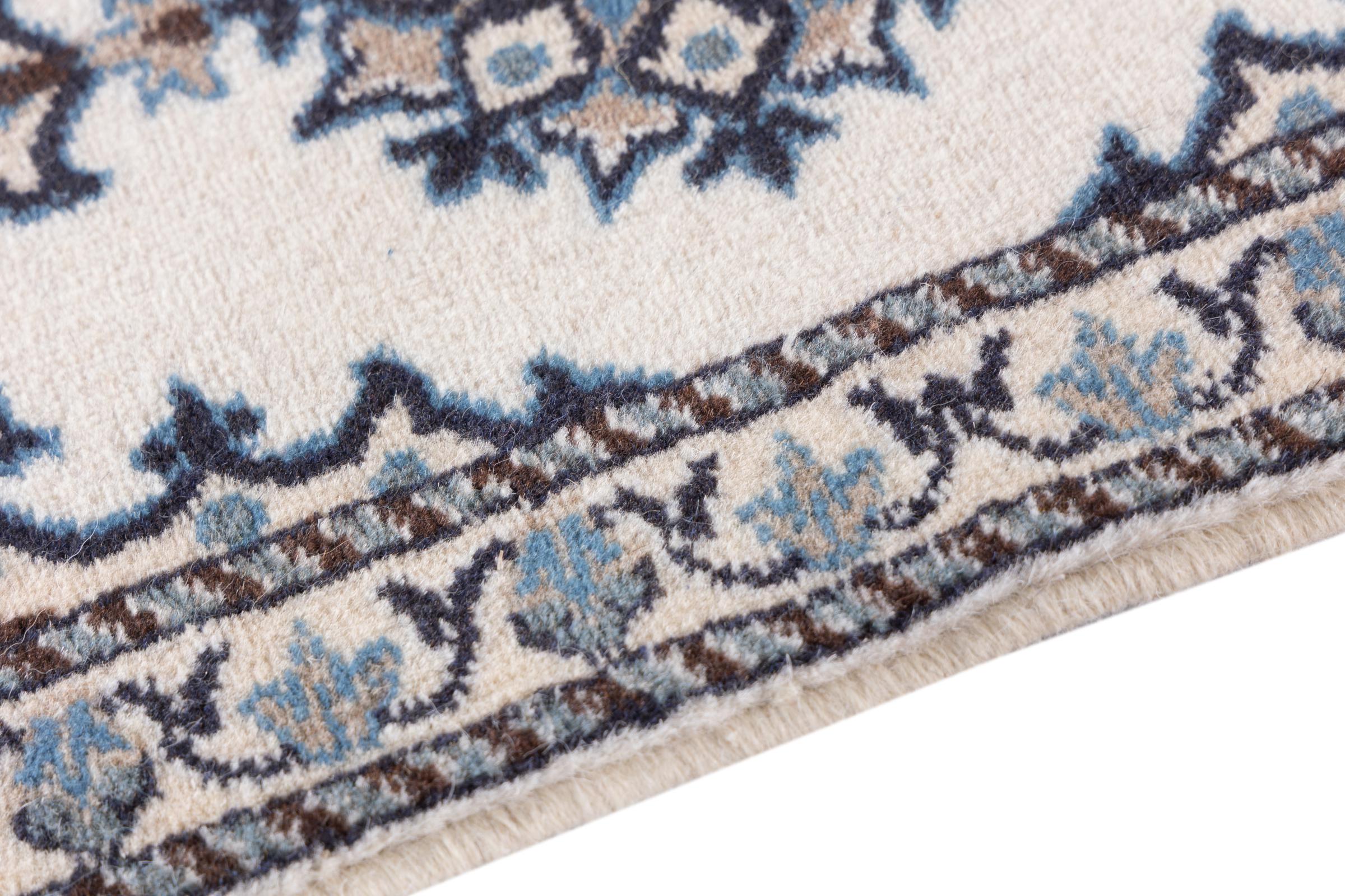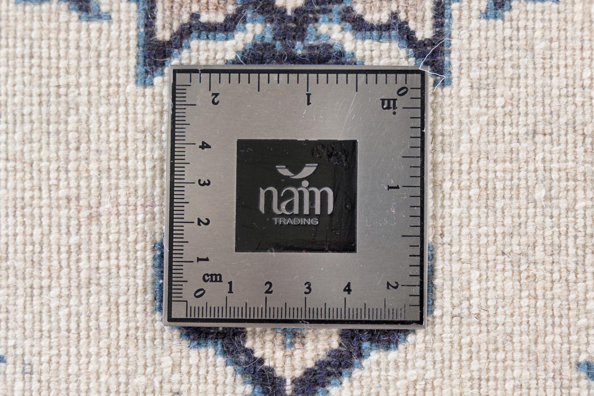This Nain rug is classified as 12La. Its typical Nain colour scheme gives it an elegant and sophisticated look. This Persian rug was hand-knotted in the city of Nain, which lies on the western edge of the Dasht-e-Kavir desert, using high-quality wool and natural silk. At 12La, it is not as finely detailed with ornamentation as a Nain 9La or 6La.