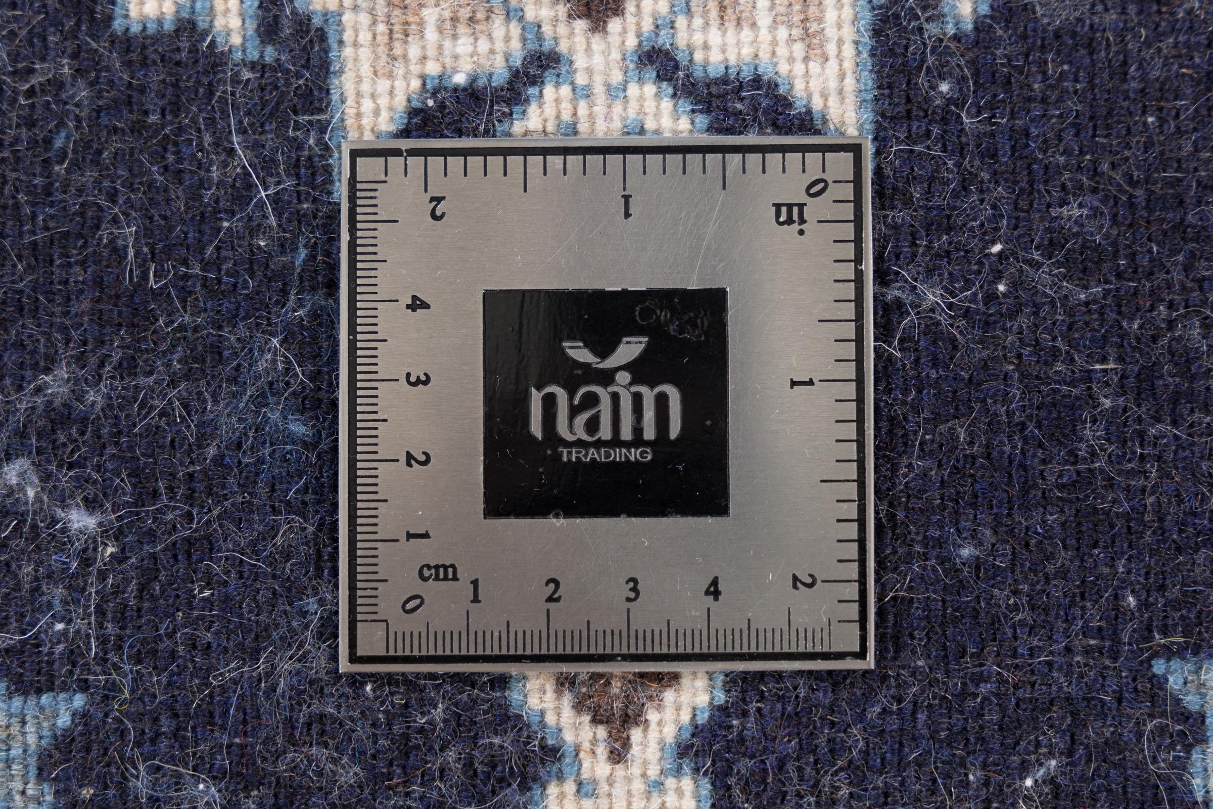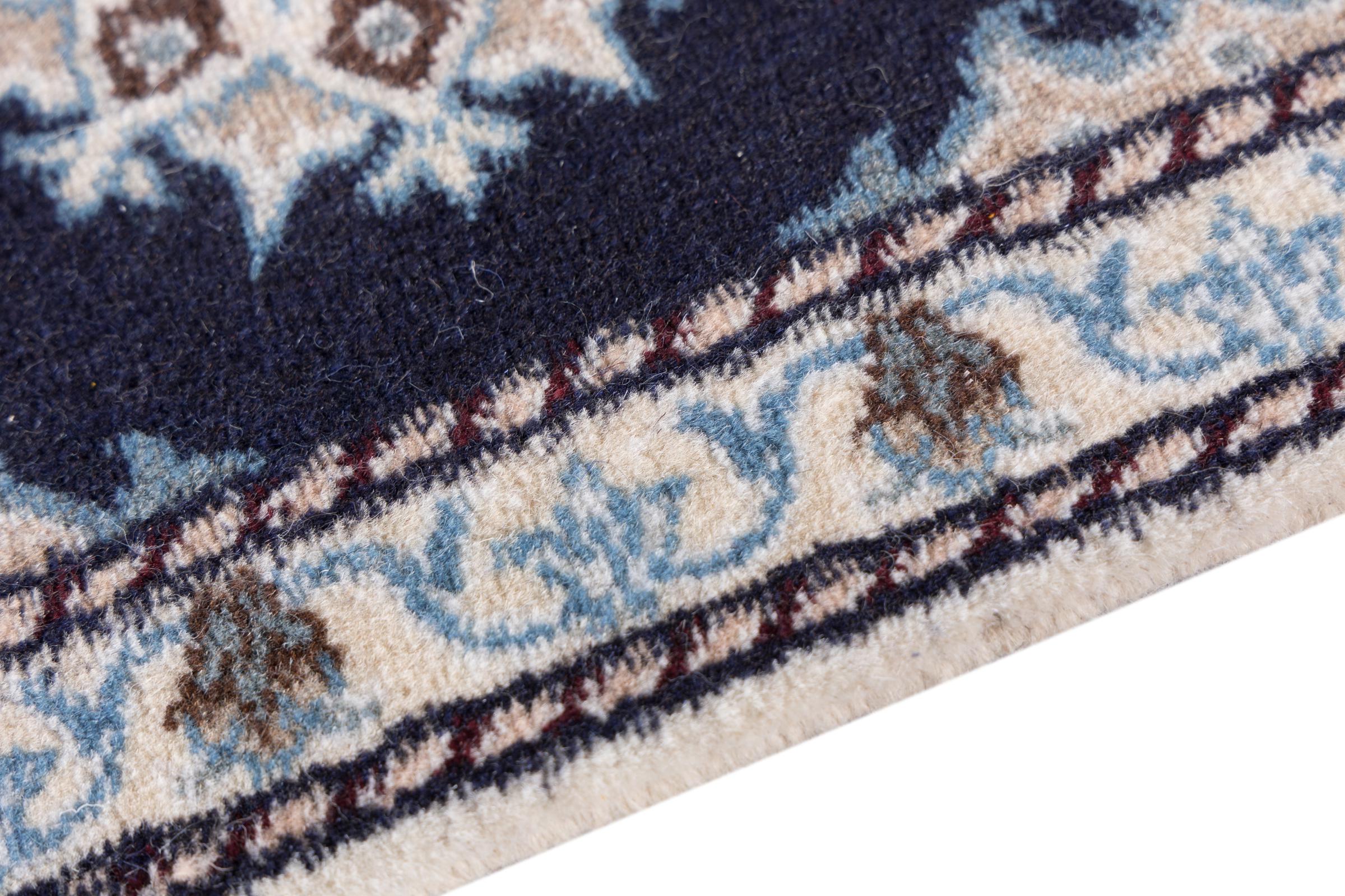 This Nain rug is classified as 12La. Its typical Nain colour scheme gives it an elegant and sophisticated look. This Persian rug was hand-knotted in the city of Nain, which lies on the western edge of the Dasht-e-Kavir desert, using high-quality wool and natural silk. At 12La, it is not as finely detailed with ornamentation as a Nain 9La or 6La.