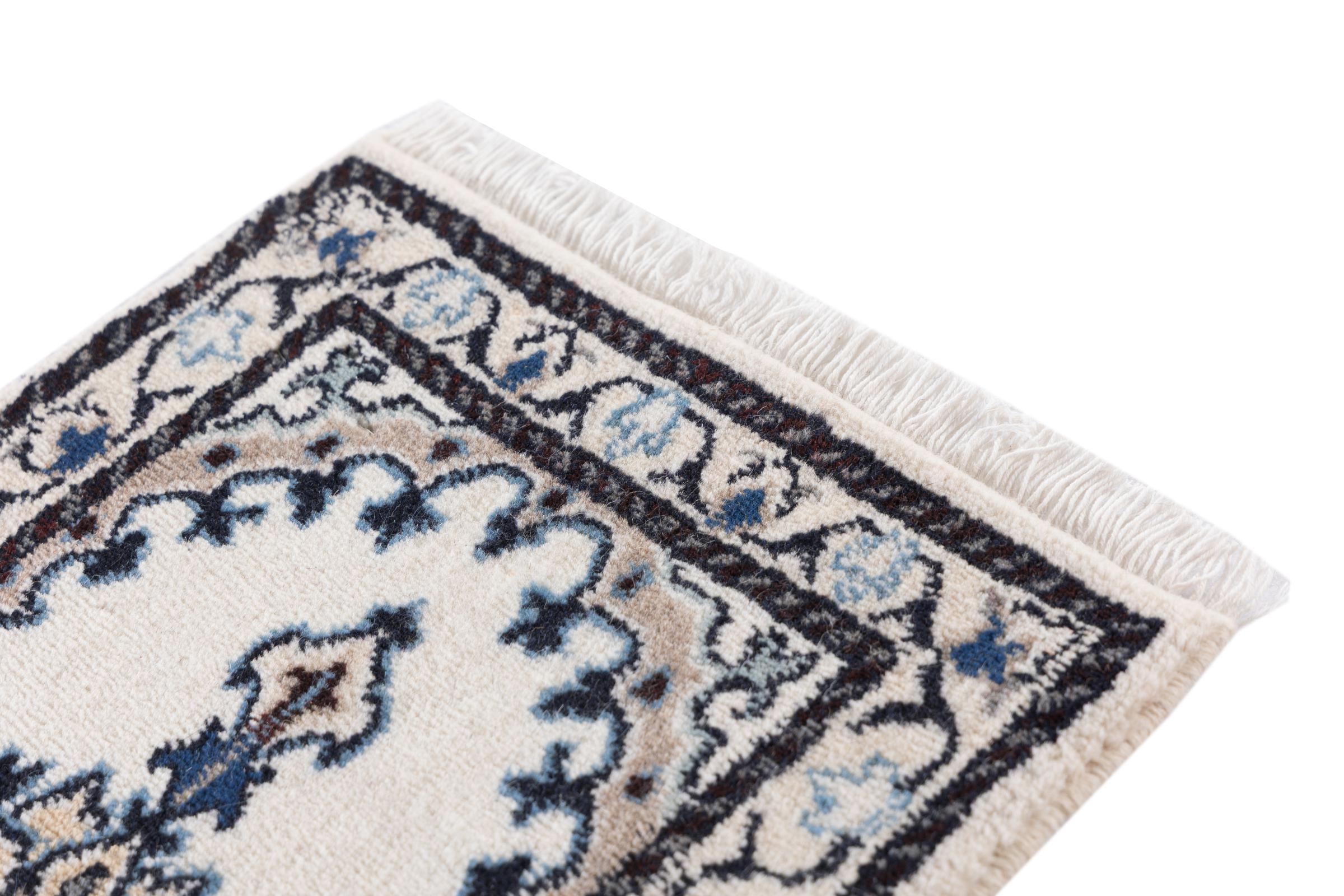 Carpet ID: 2940650021517 Size: 60x40 cm Thickness: ap. 12 mm Knot density: 200 000 - 250 000 / m² Manufacturing: Knotted by hand Pile: Wool with silk Warp: Cotton Origin: Persia Age: New Weight: ap. 1 kg In stock: Unique - Only 1 in stock