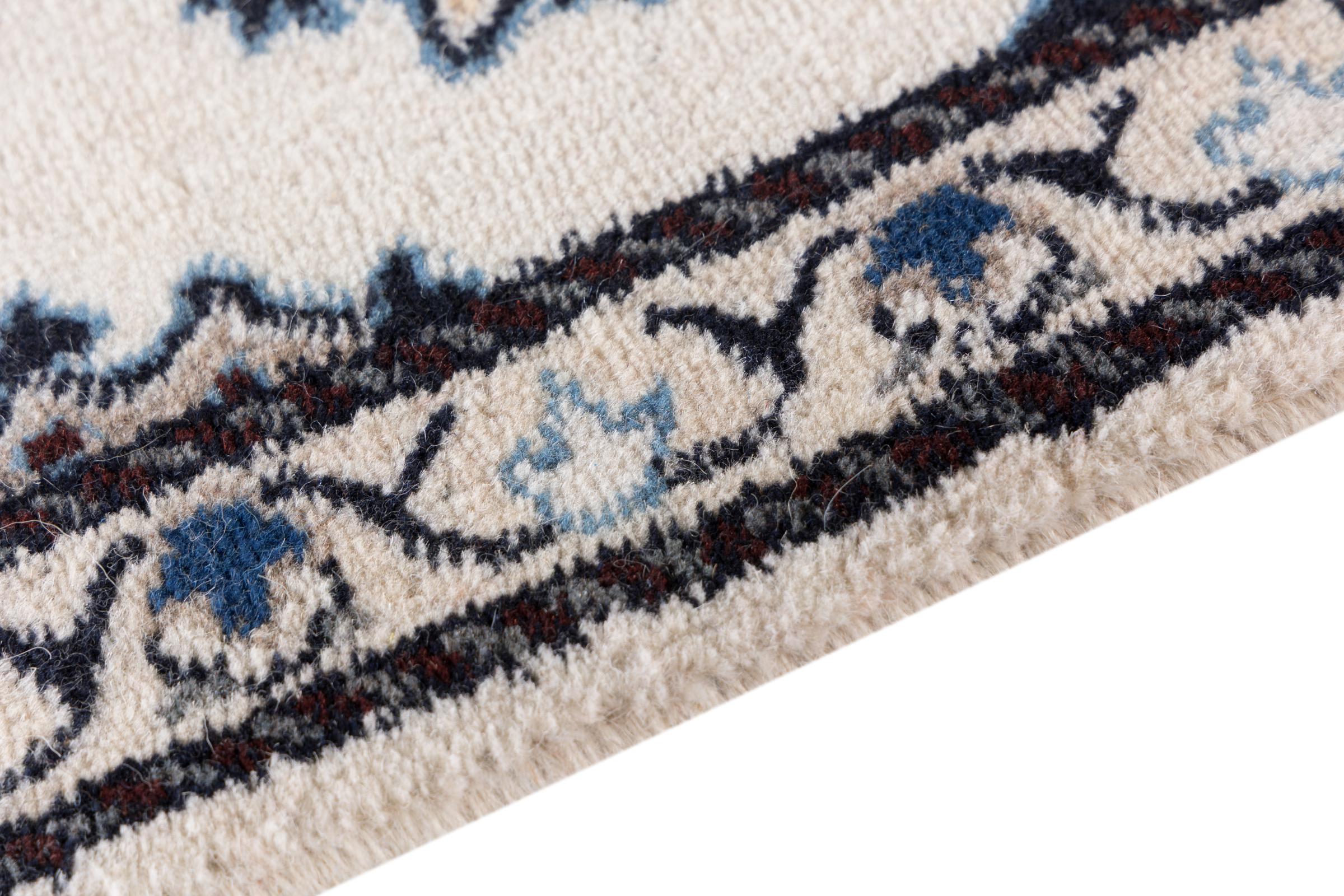 This Nain rug is classified as 12La. Its typical Nain colour scheme gives it an elegant and sophisticated look. This Persian rug was hand-knotted in the city of Nain, which lies on the western edge of the Dasht-e-Kavir desert, using high-quality wool and natural silk. At 12La, it is not as finely detailed with ornamentation as a Nain 9La or 6La.