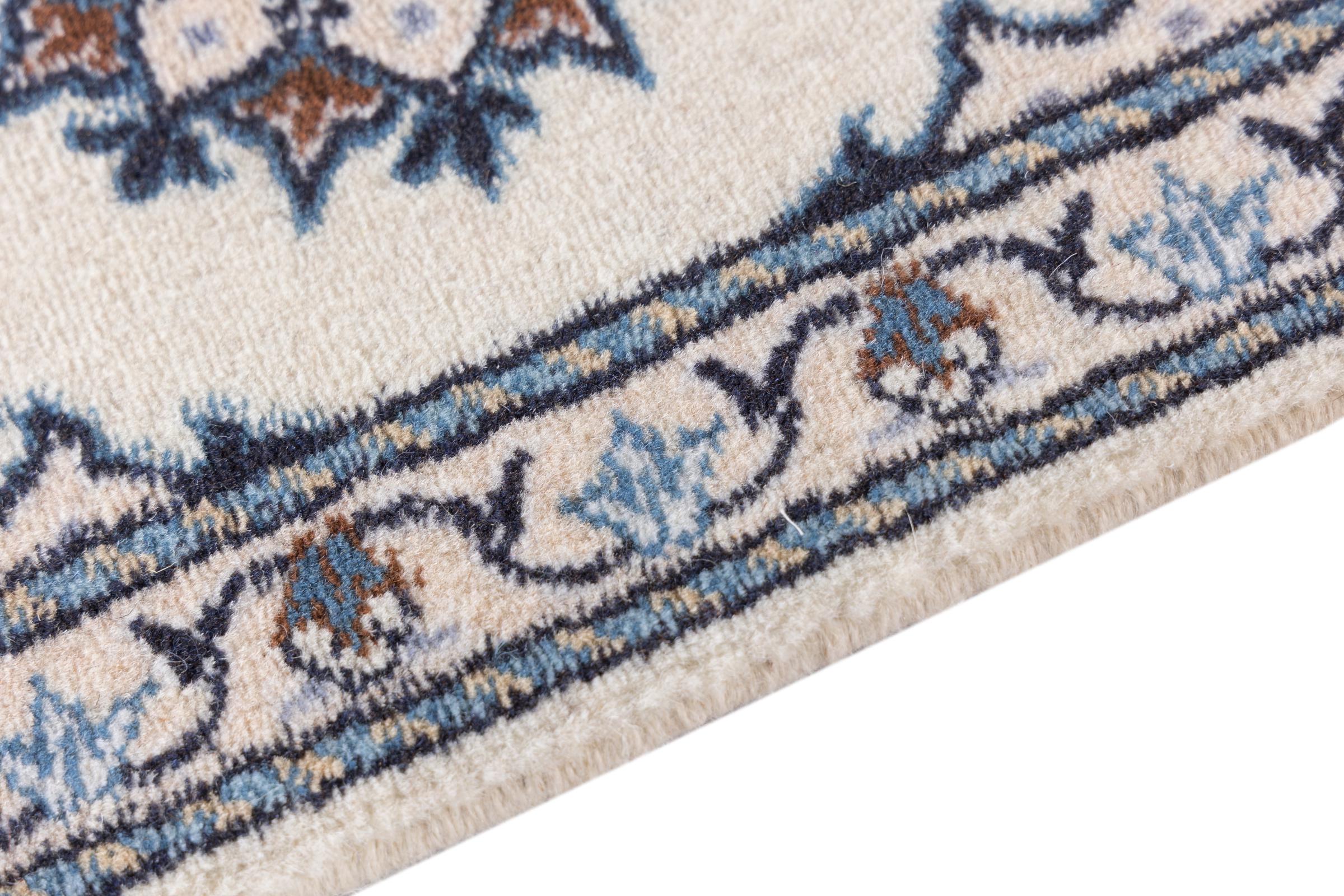 This Nain rug is classified as 12La. Its typical Nain colour scheme gives it an elegant and sophisticated look. This Persian rug was hand-knotted in the city of Nain, which lies on the western edge of the Dasht-e-Kavir desert, using high-quality wool and natural silk. At 12La, it is not as finely detailed with ornamentation as a Nain 9La or 6La.