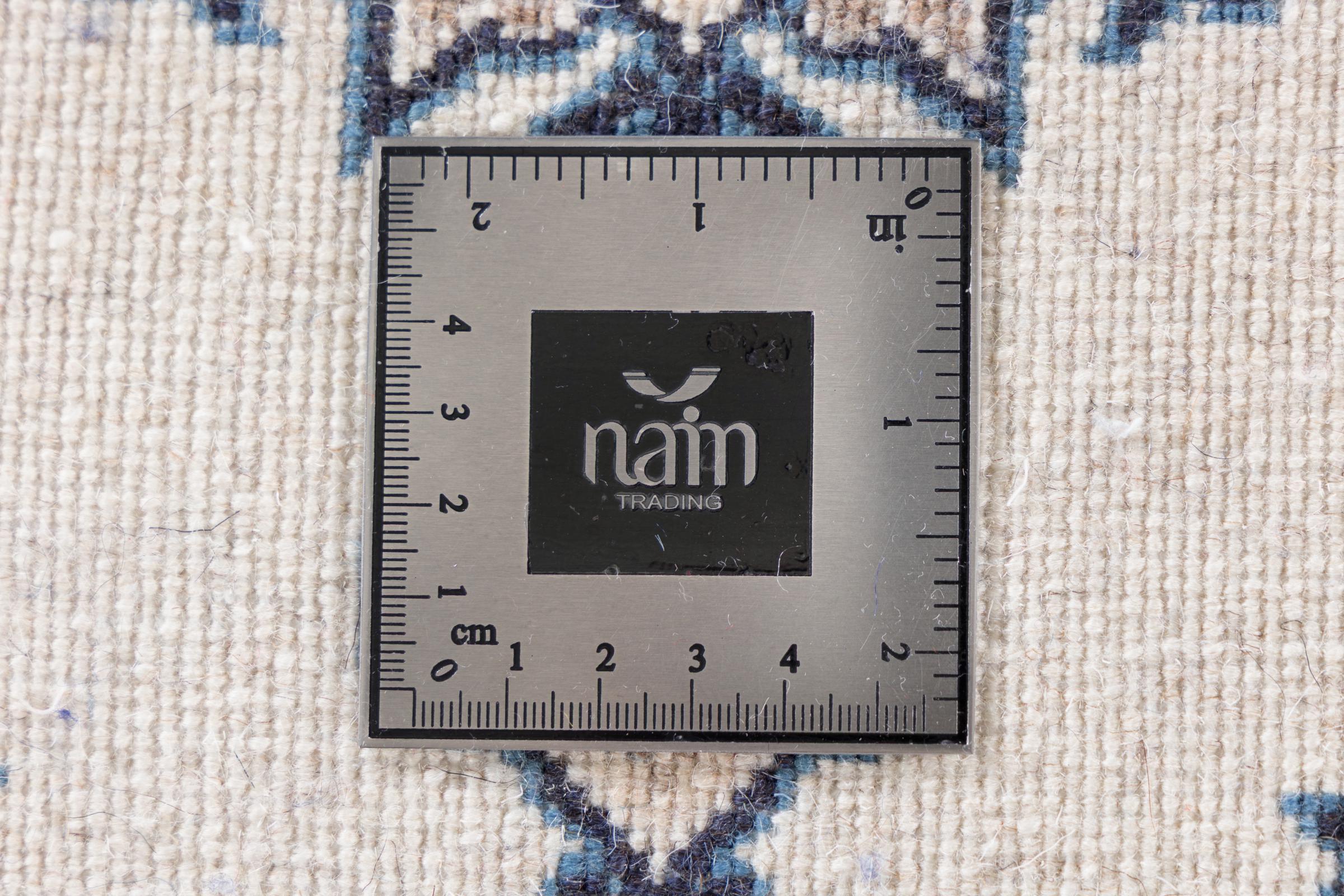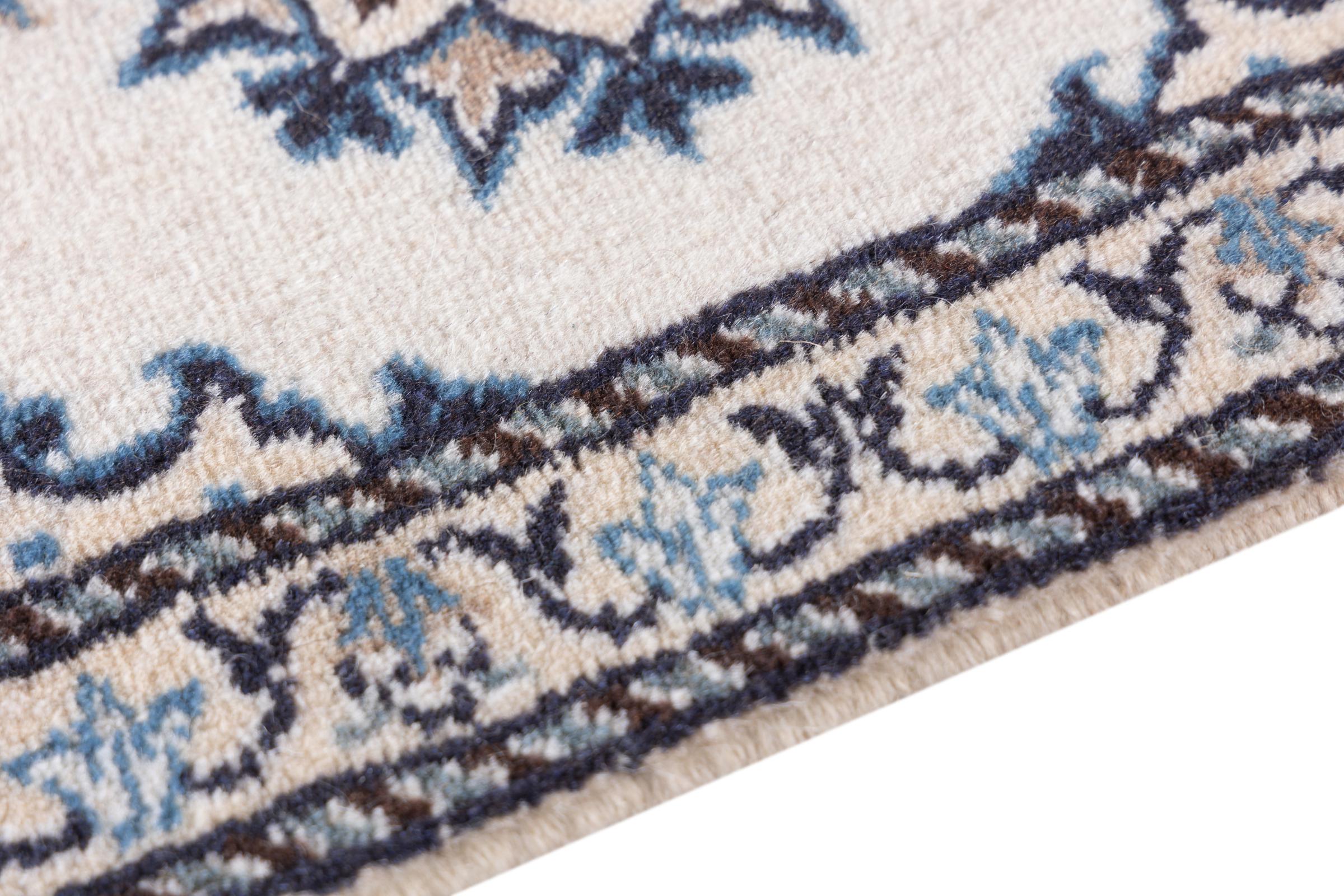 This Nain rug is classified as 12La. Its typical Nain colour scheme gives it an elegant and sophisticated look. This Persian rug was hand-knotted in the city of Nain, which lies on the western edge of the Dasht-e-Kavir desert, using high-quality wool and natural silk. At 12La, it is not as finely detailed with ornamentation as a Nain 9La or 6La.