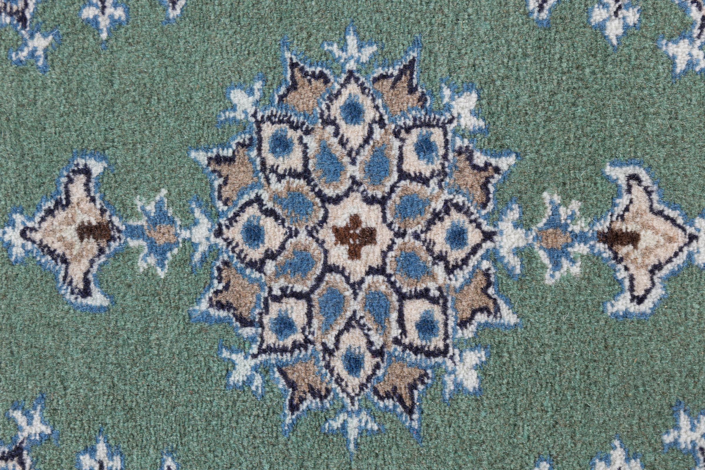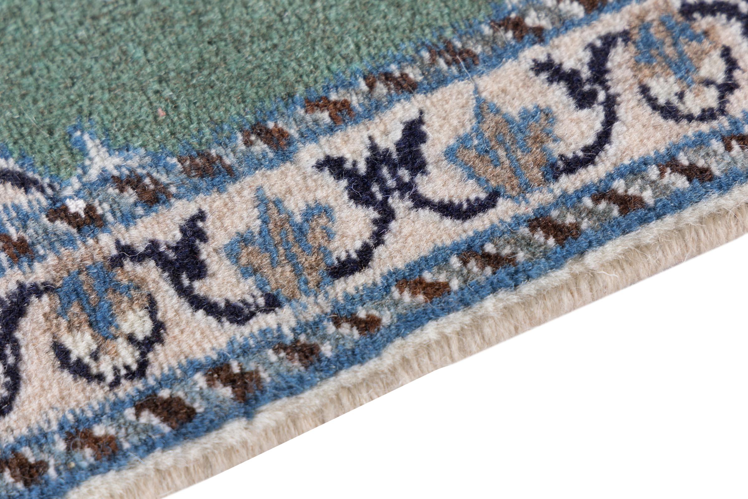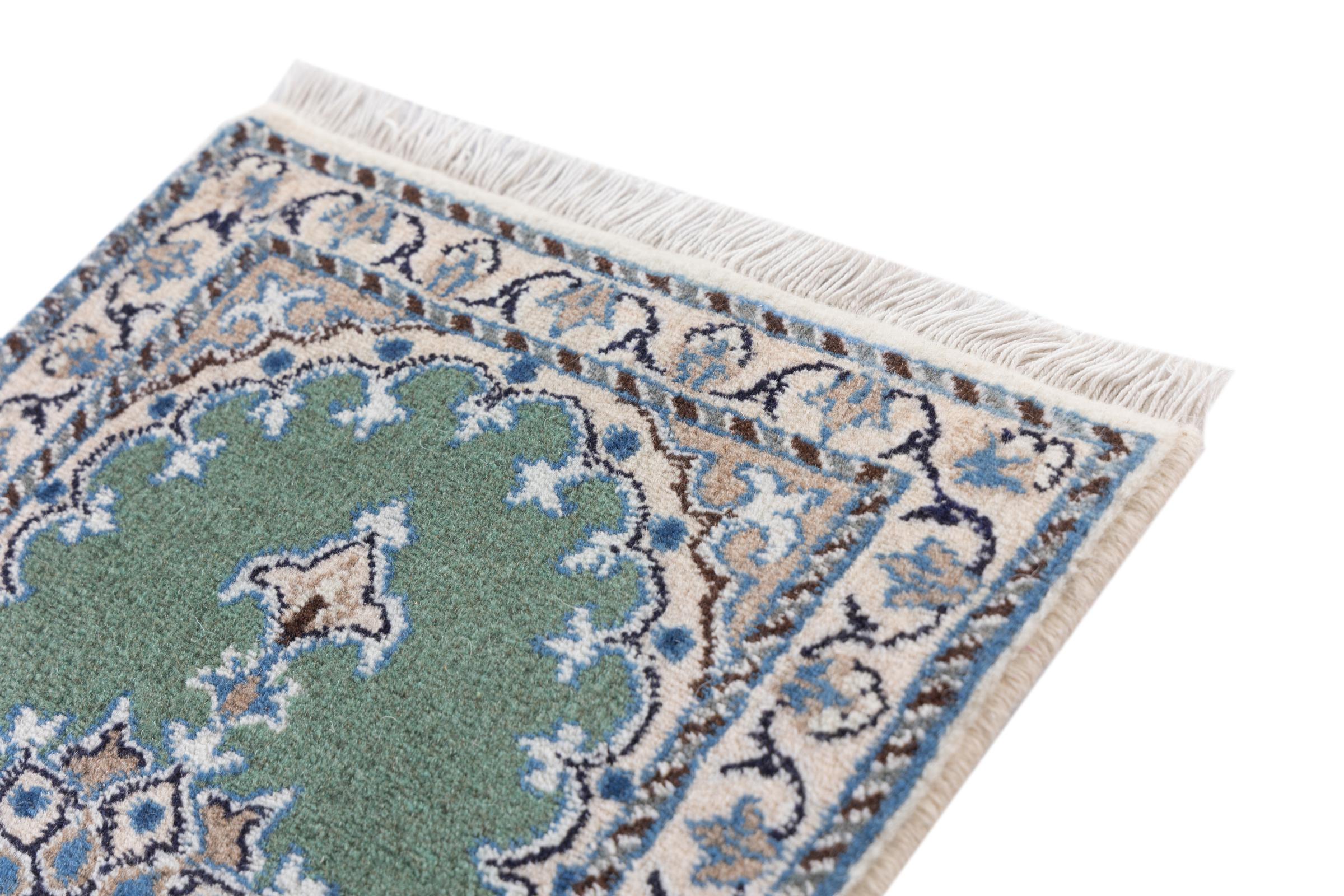 This Nain rug is classified as 12La. Its typical Nain colour scheme gives it an elegant and sophisticated look. This Persian rug was hand-knotted in the city of Nain, which lies on the western edge of the Dasht-e-Kavir desert, using high-quality wool and natural silk. At 12La, it is not as finely detailed with ornamentation as a Nain 9La or 6La.