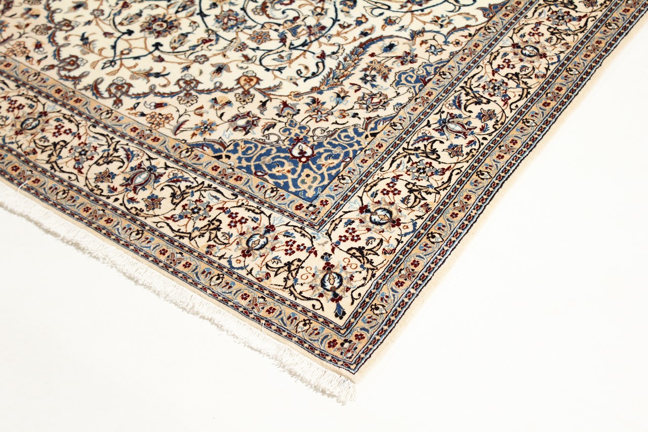 This Nain rug combines quality, tradition and an unmistakable design. It was hand-knotted from high-quality cork wool and natural silk in the desert town of the same name, Nain. Lovers of valuable rugs from Iran will love this Persian rug. With Nain rugs in the 6La and 4La classifications, you have a real work of art with an incredible level of detail that you can really lose yourself in. Nain 4La rugs are almost impossible to find today, as they are extremely elaborate to produce.